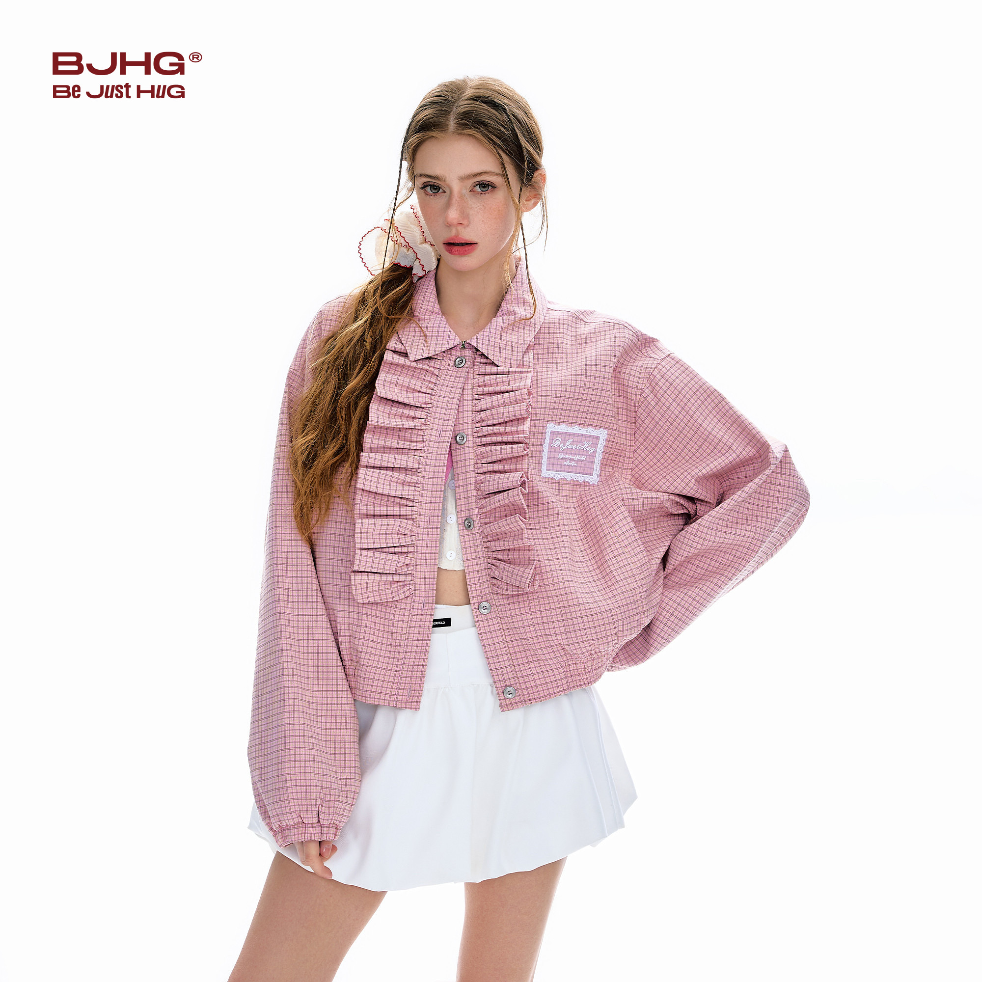 BJHG不计后果美式复古夹克女春季新款翻领短款上衣学院风格纹外套