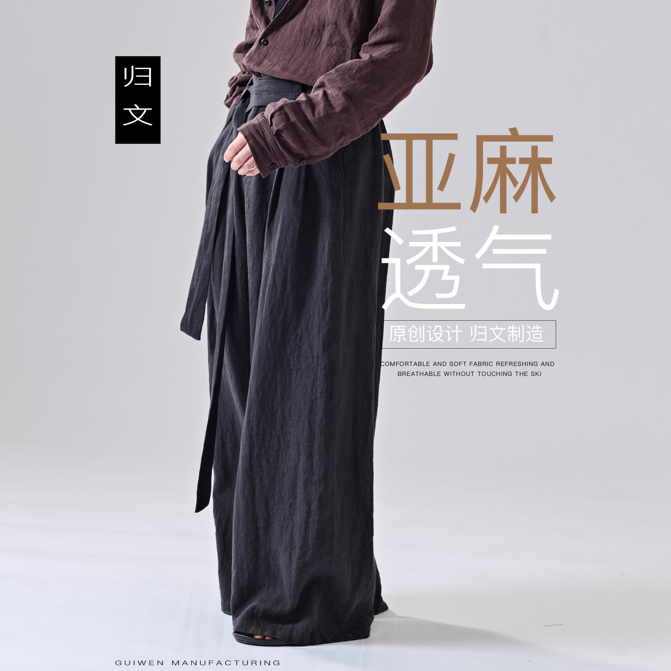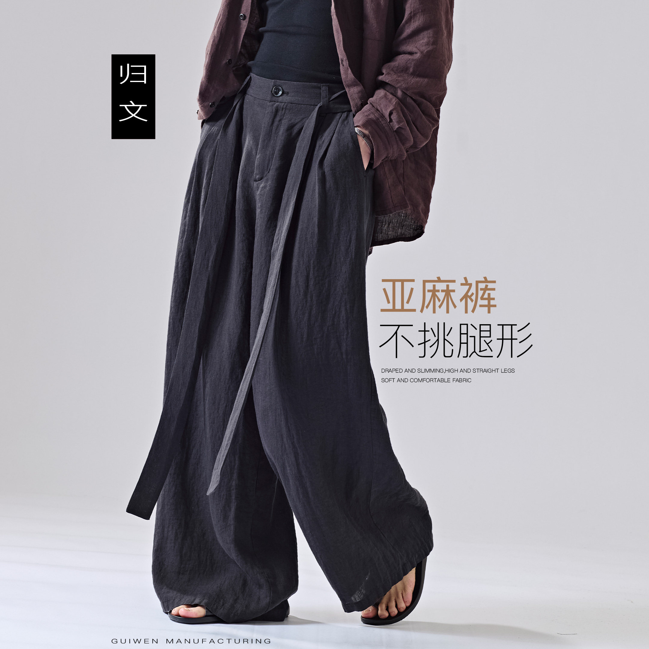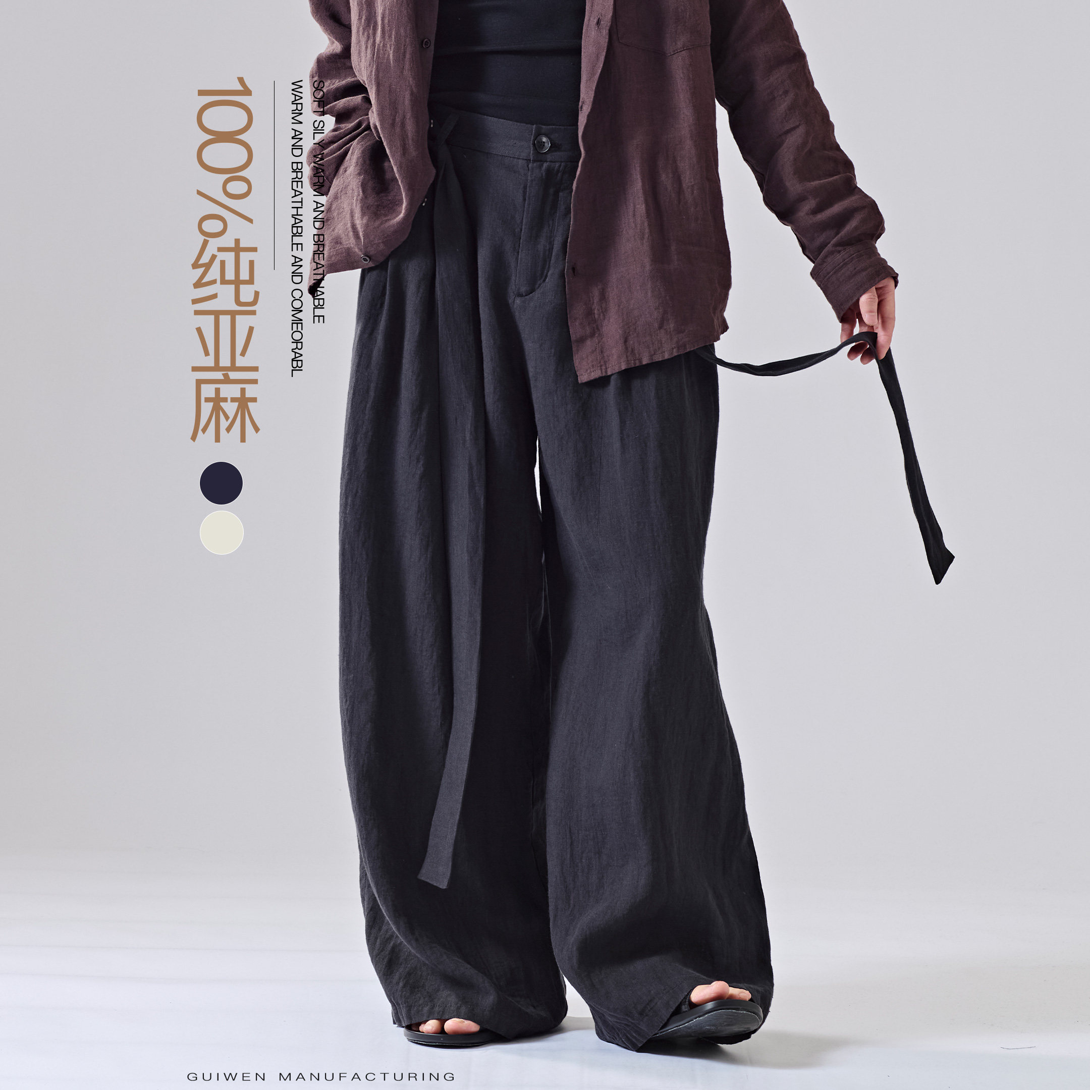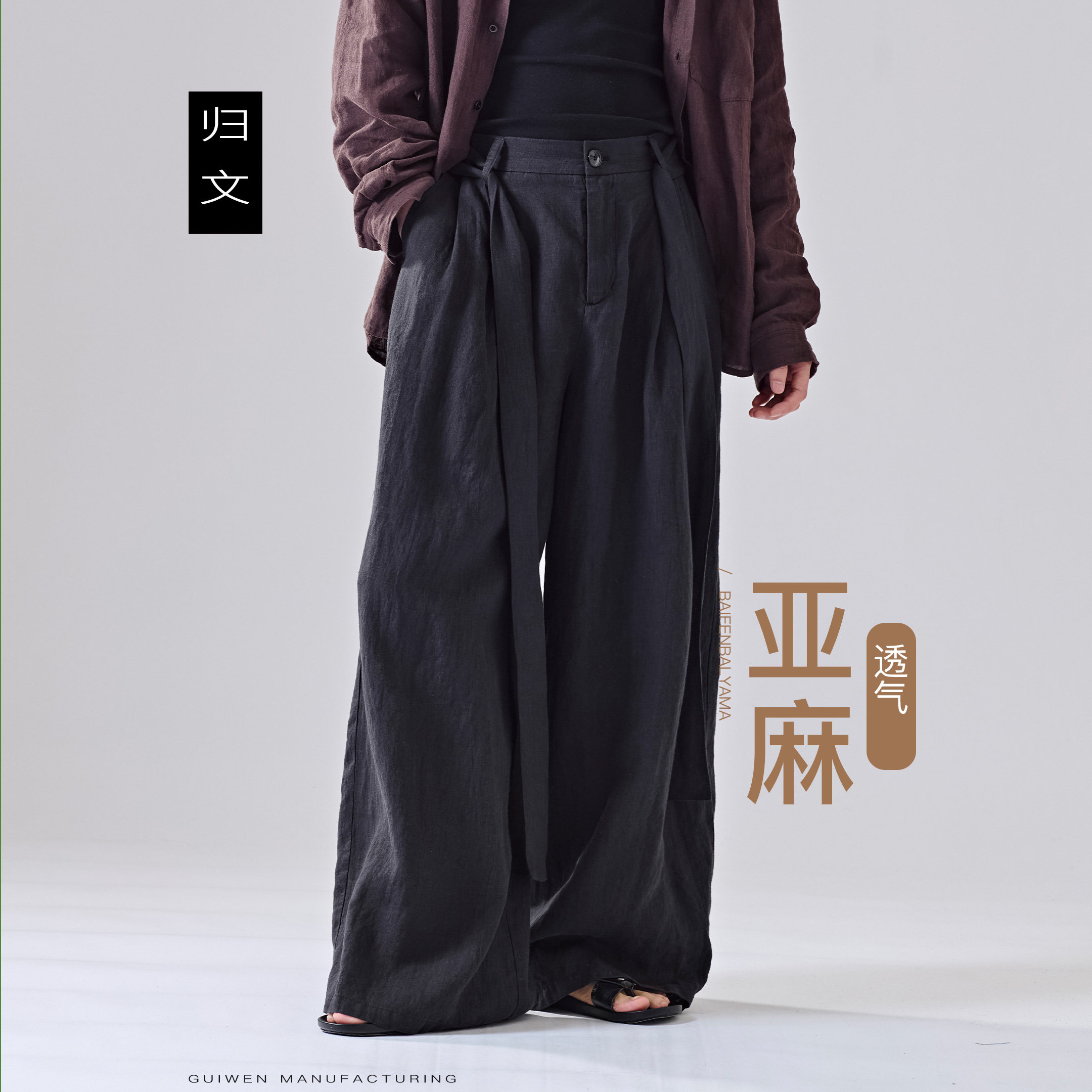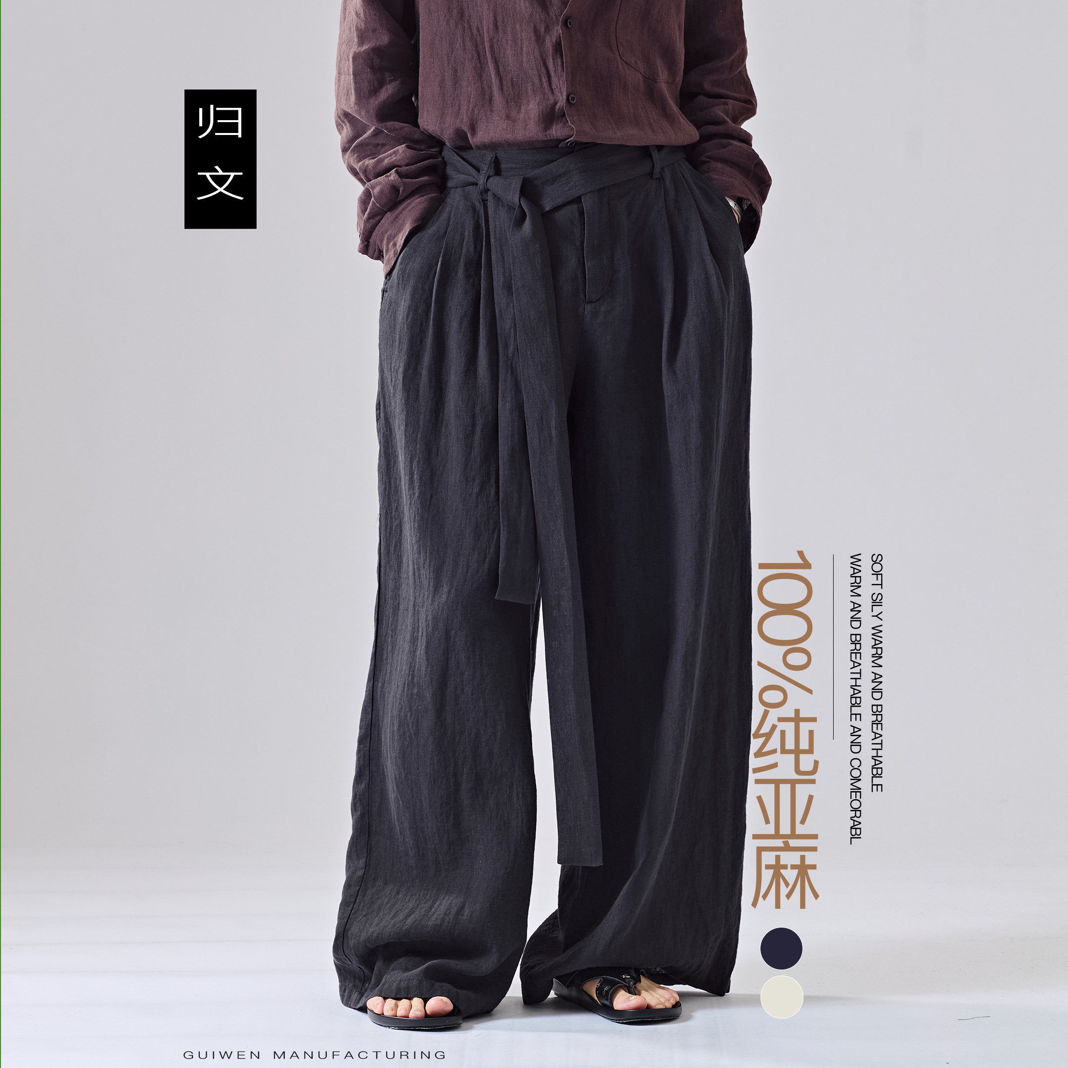 归文老钱风100%纯亚麻阔腿裤男春季宽松直筒透气休闲裤垂坠感裤子