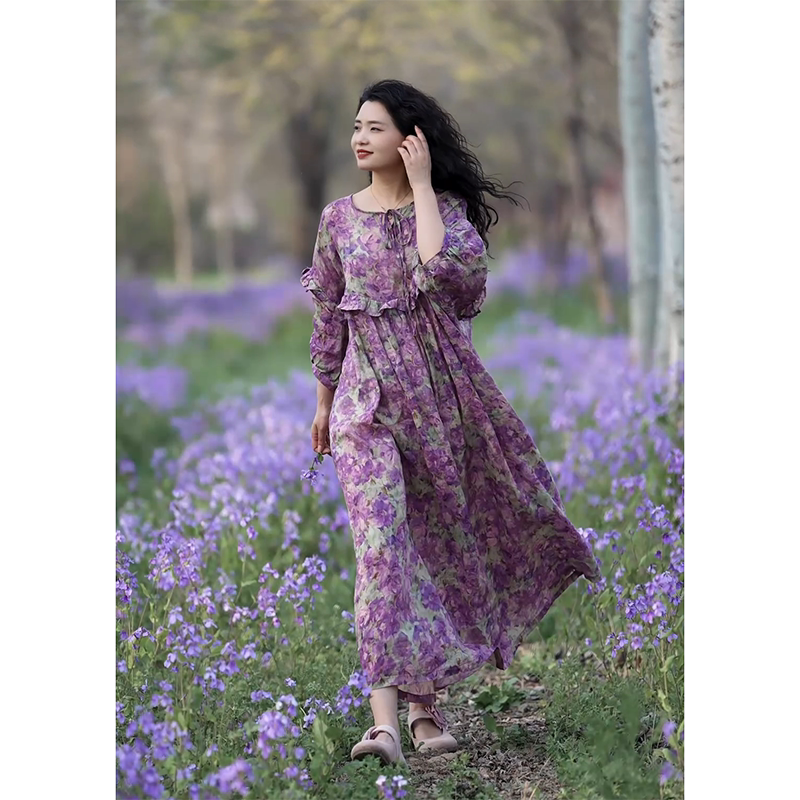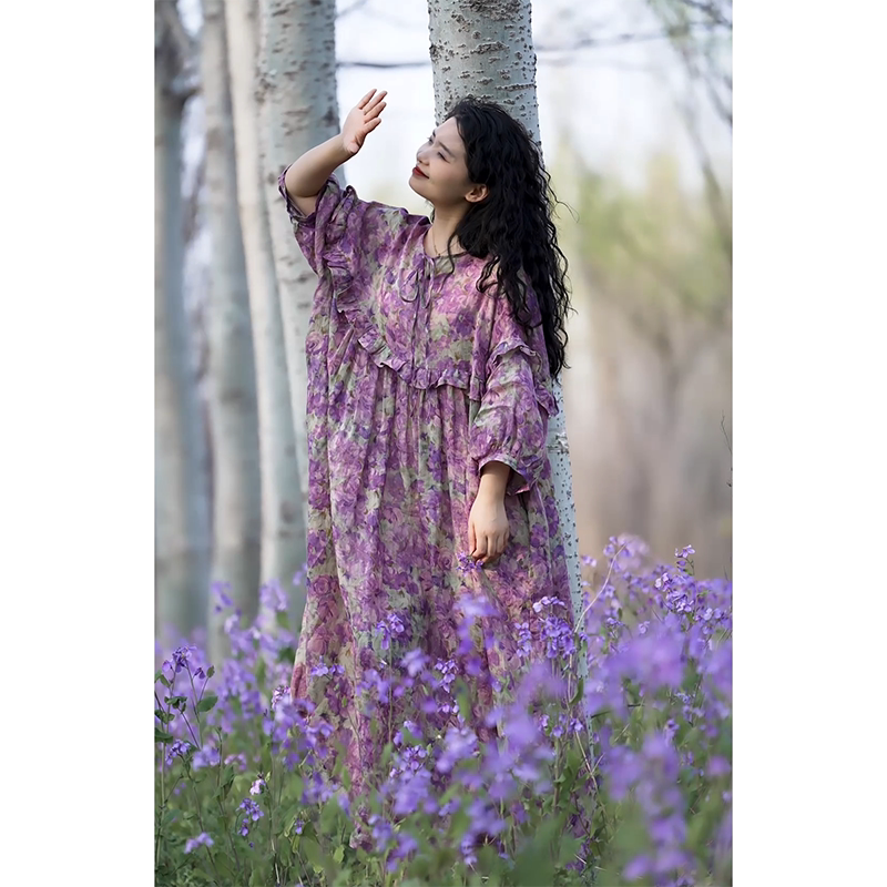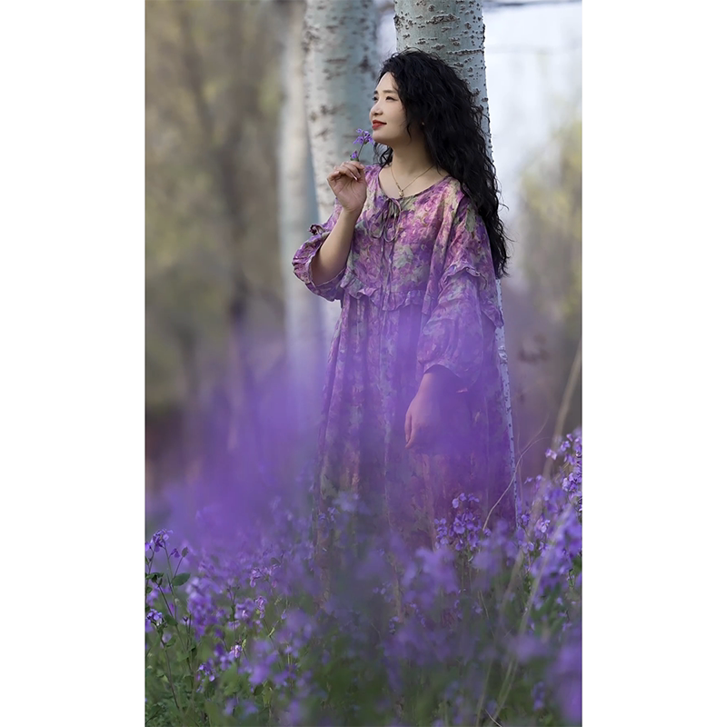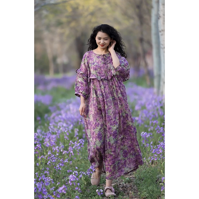 YIMIAN 浪漫花边拼接印花文艺苎麻宽松连衣裙220072