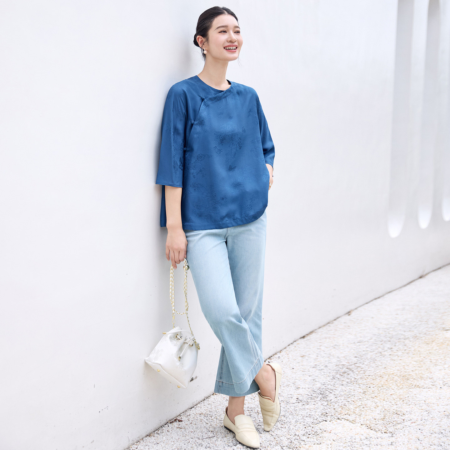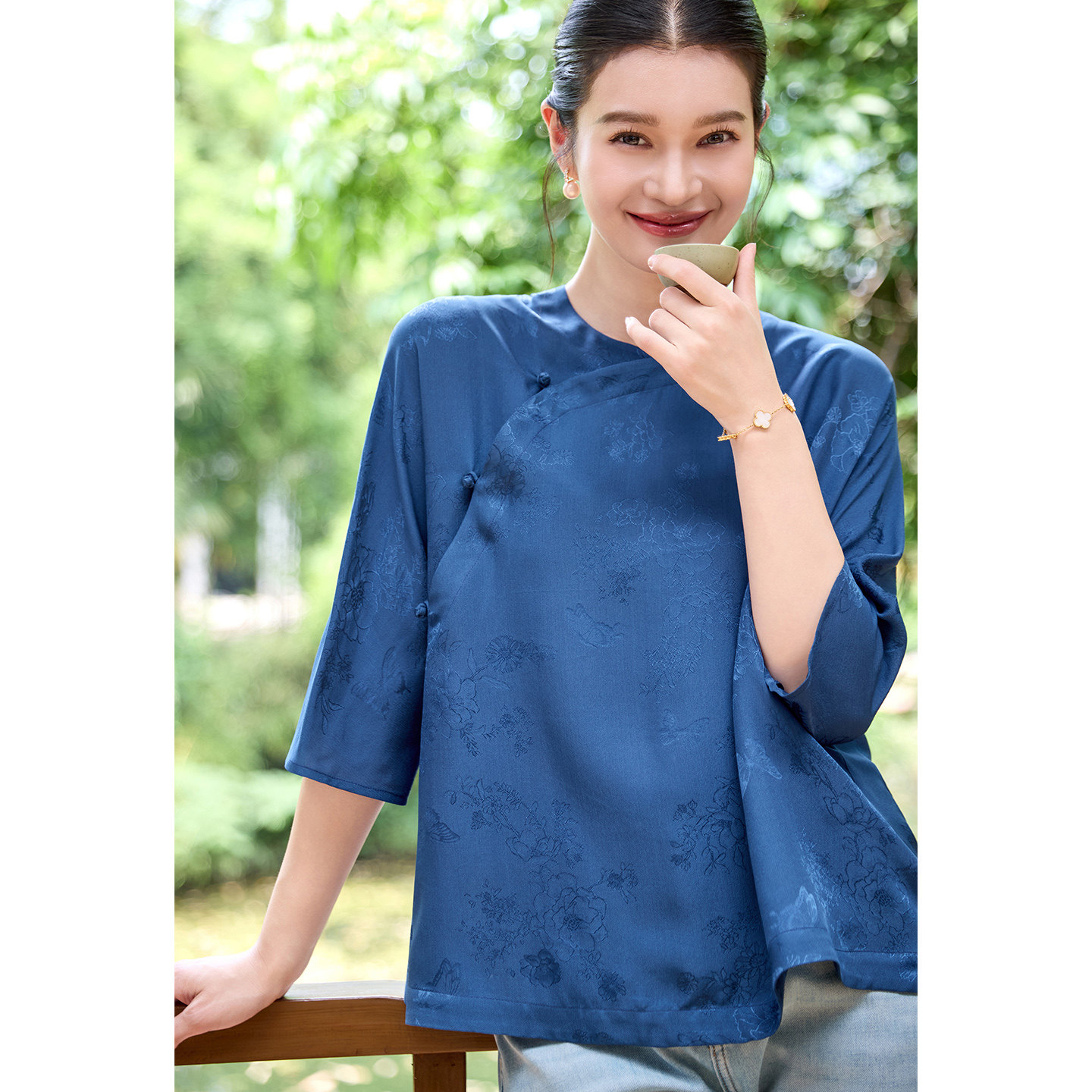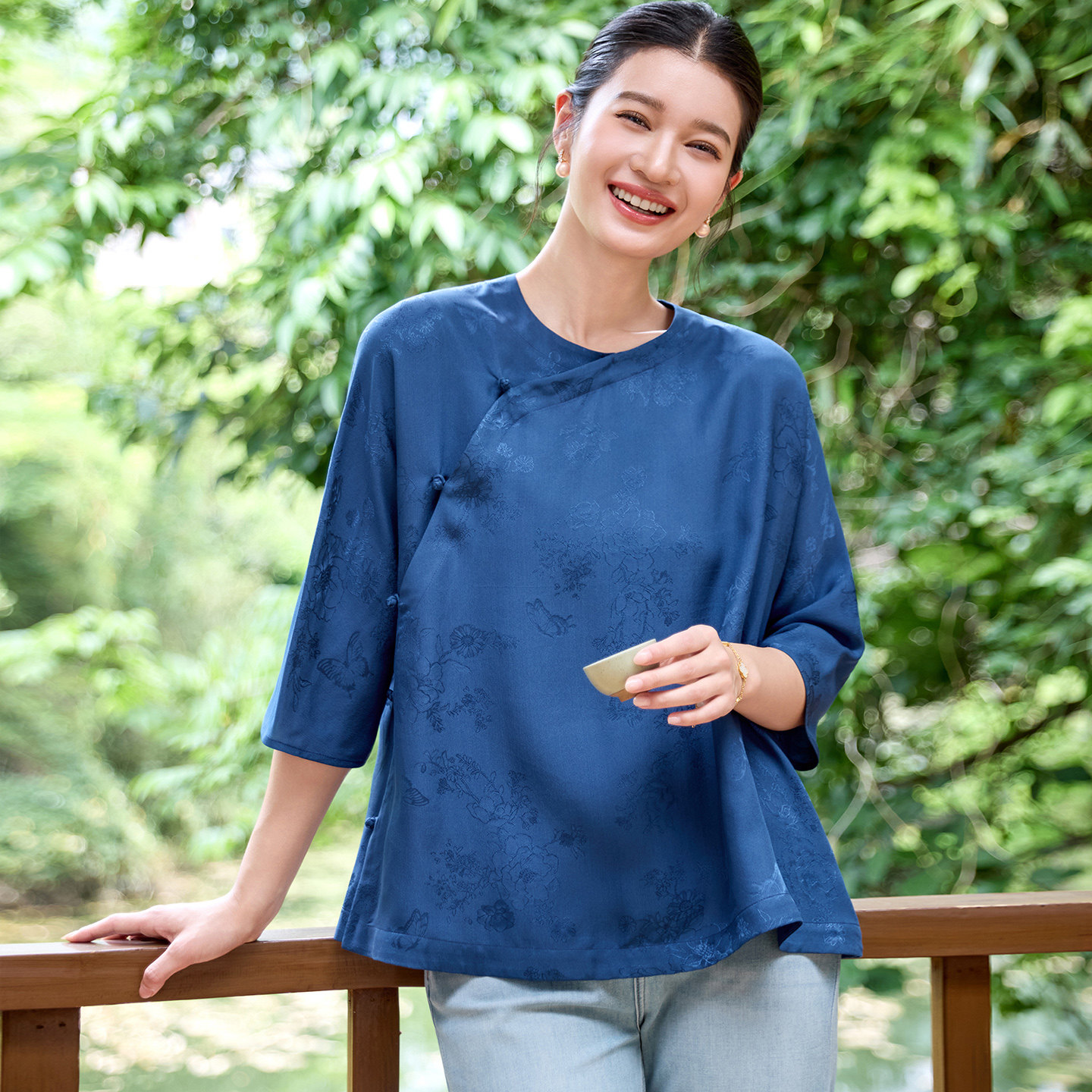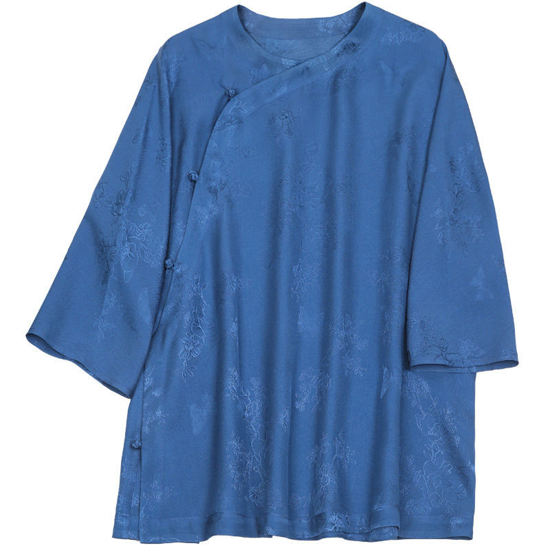 菲伊唐真丝花萝提花新中式圆领衬衫女斜襟盘扣女上衣禅意茶服女夏