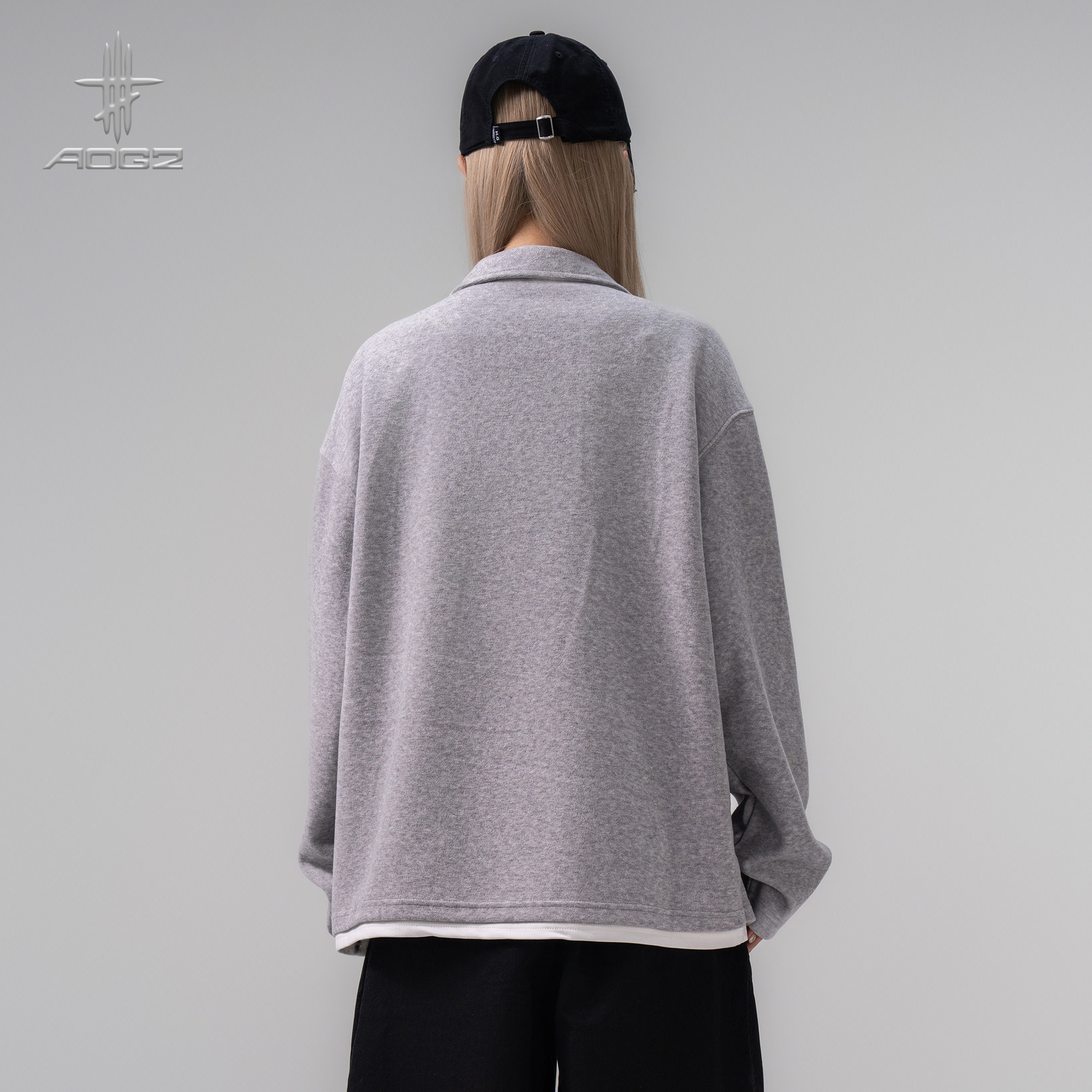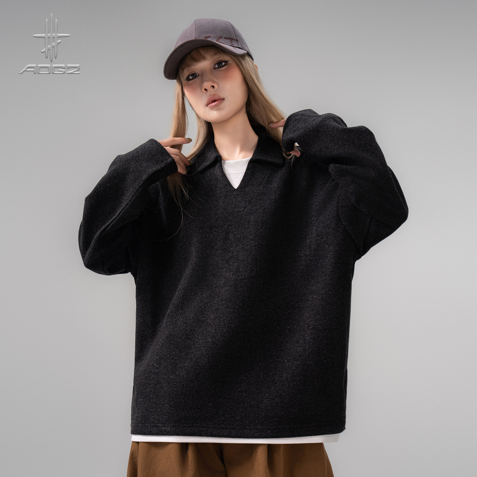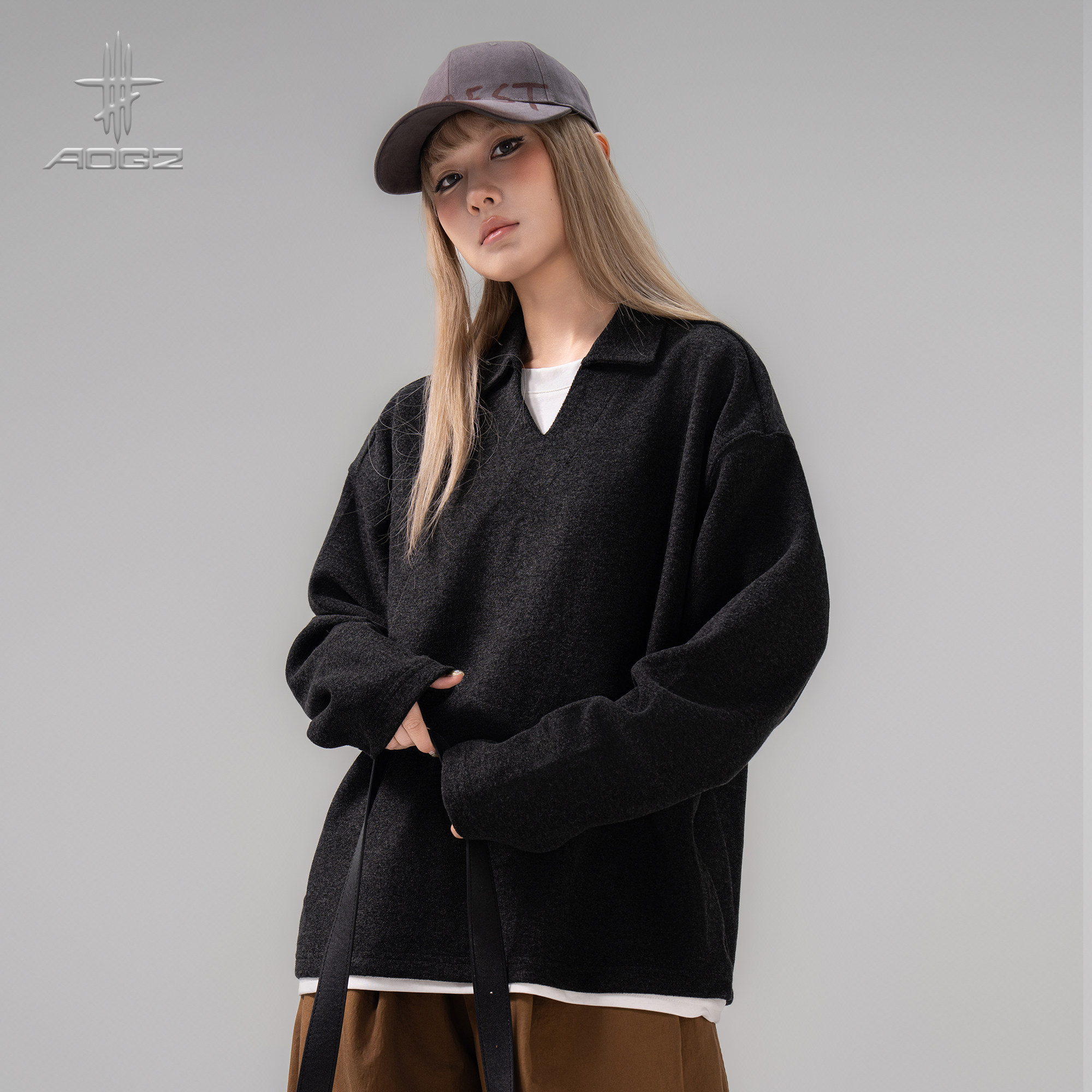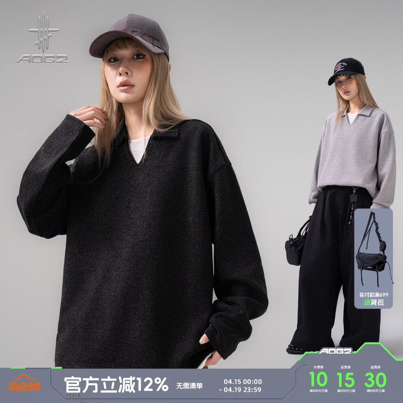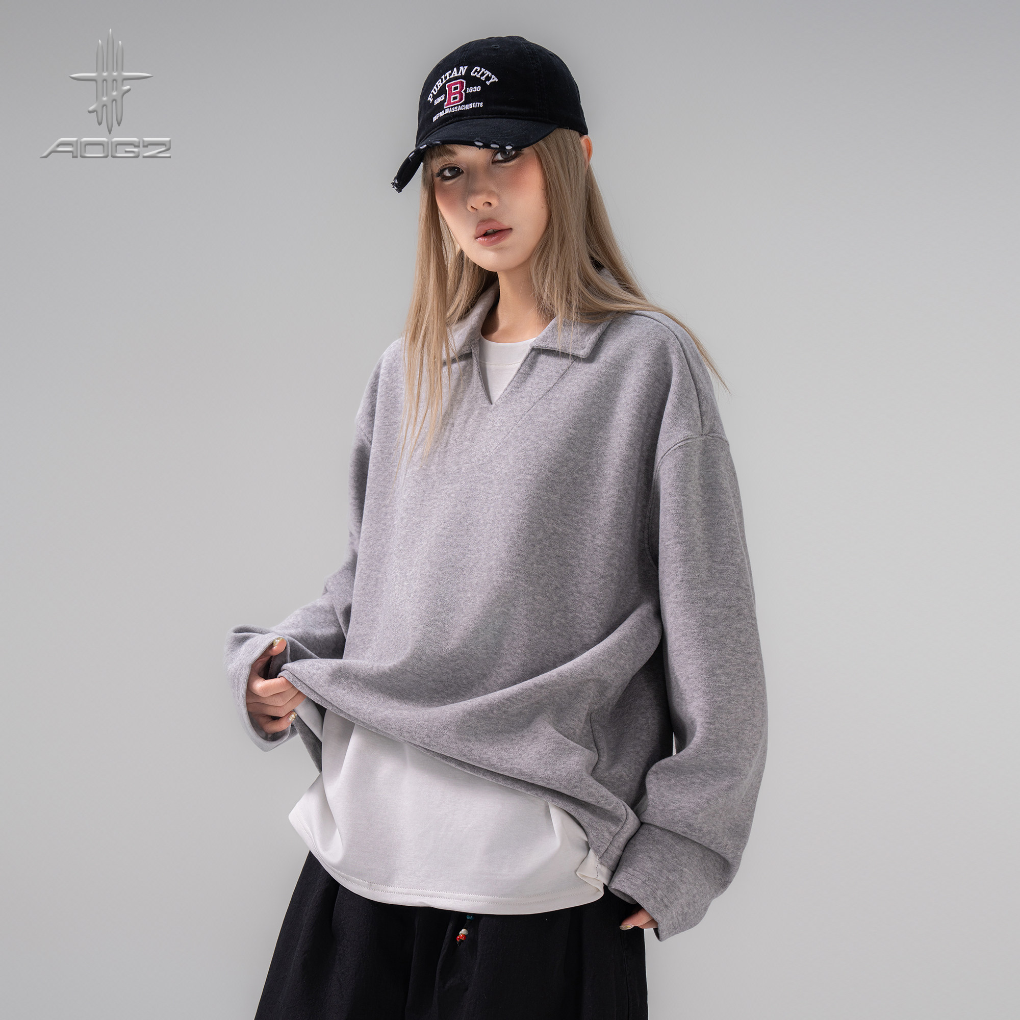 AOGZ撞色拼接假两件卫衣春季新款男女休闲百搭老钱风翻领长袖上衣