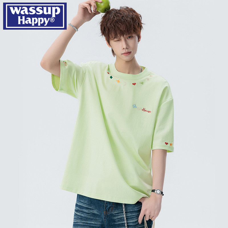 wassup happy美式字母刺绣圆领短袖t恤男士夏季街头宽松半袖体恤