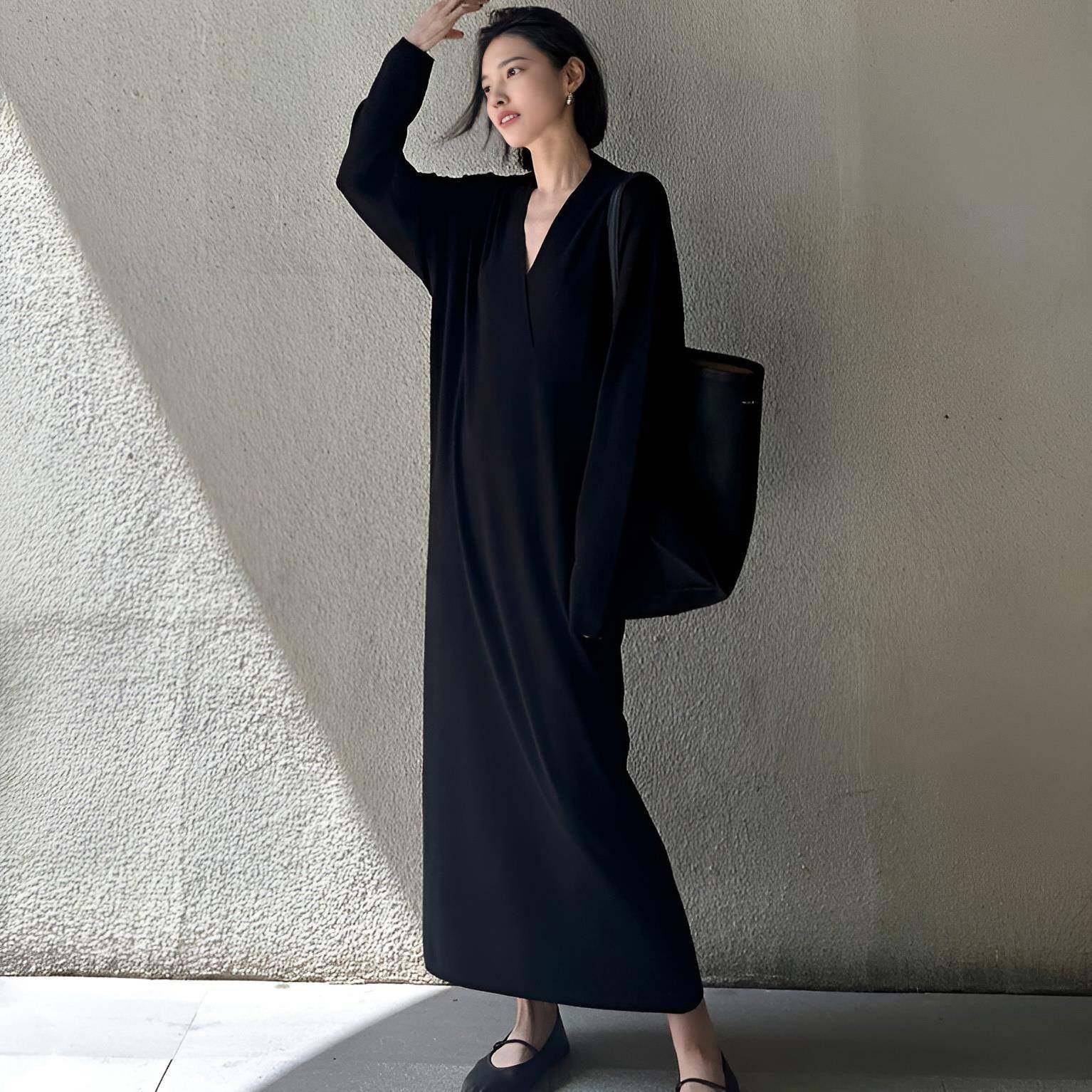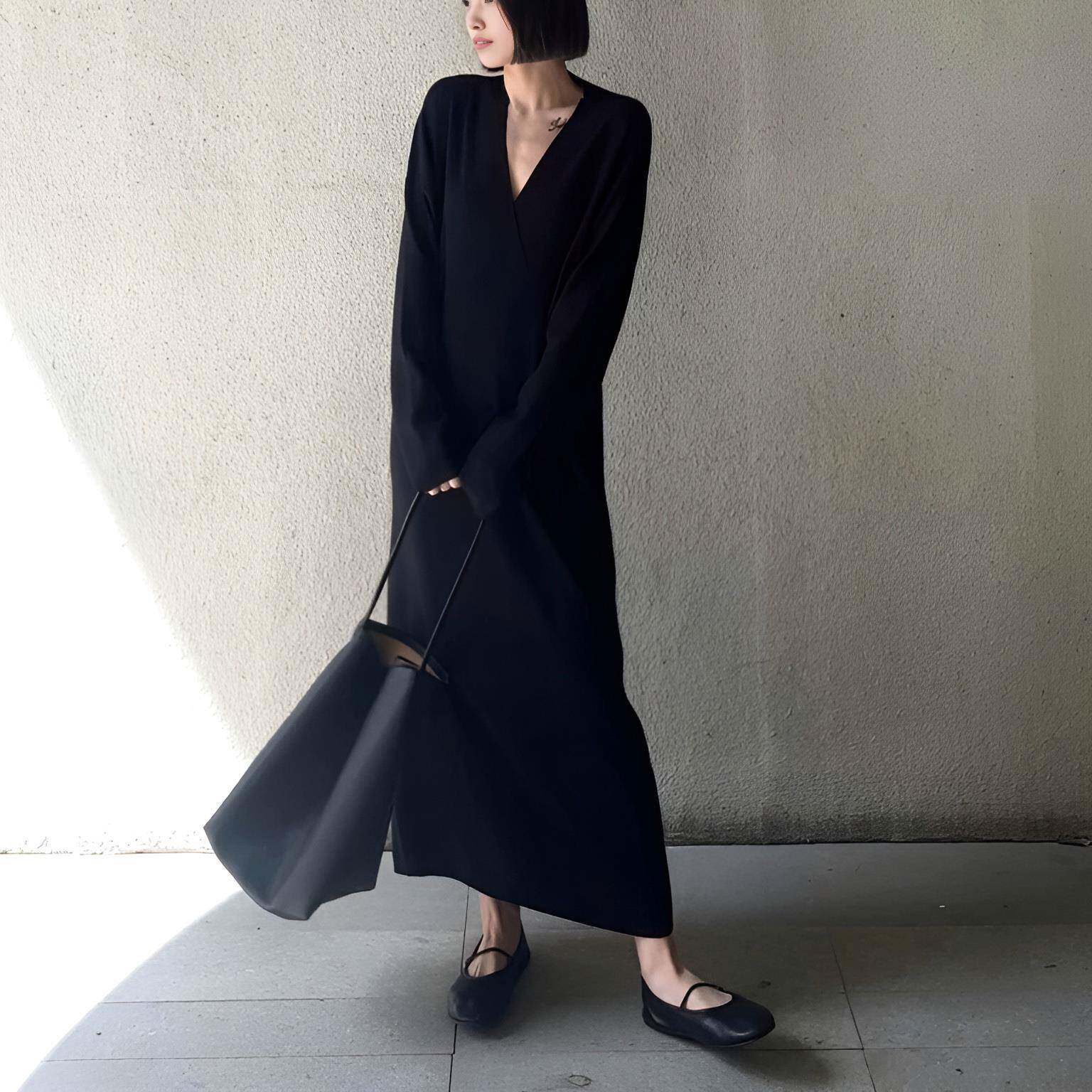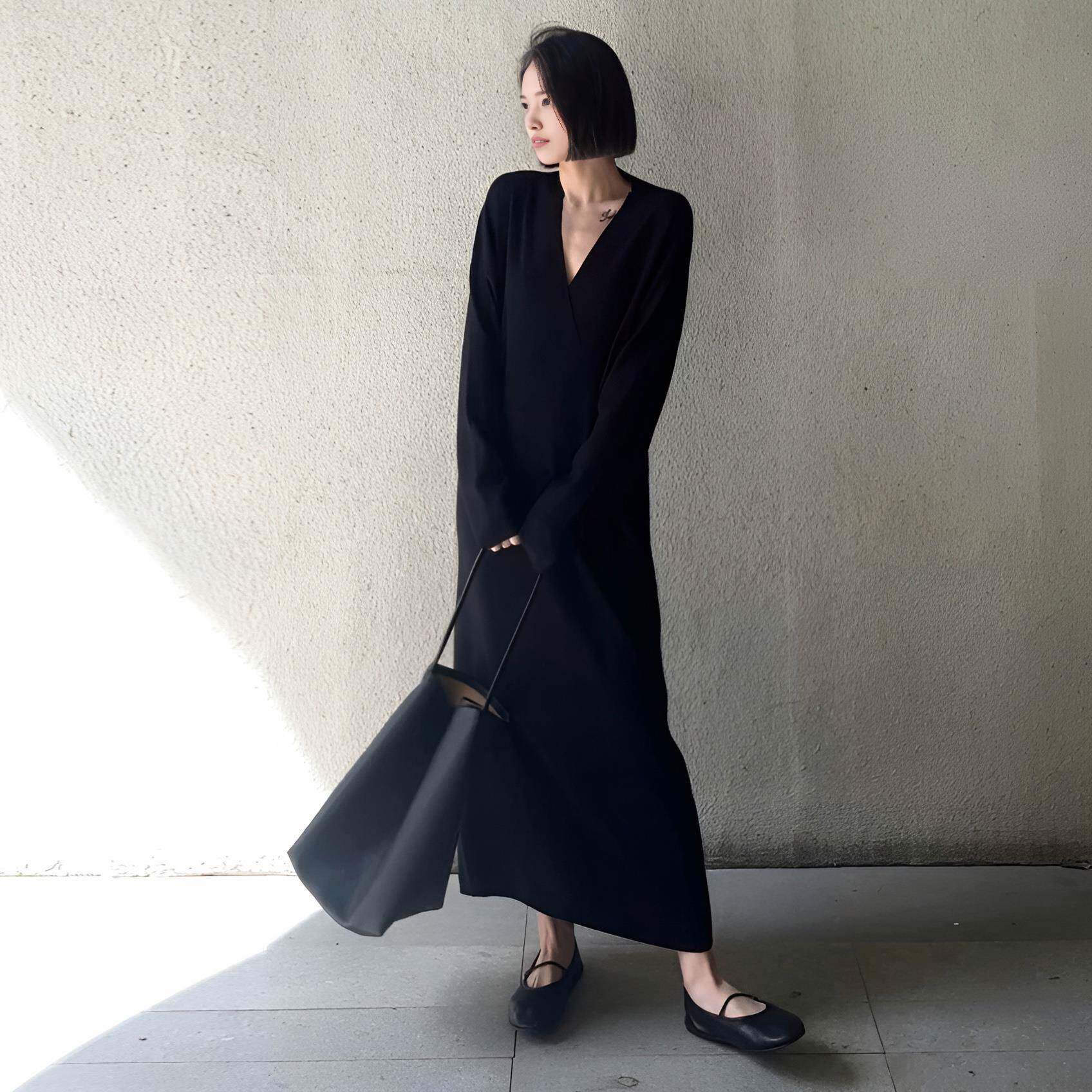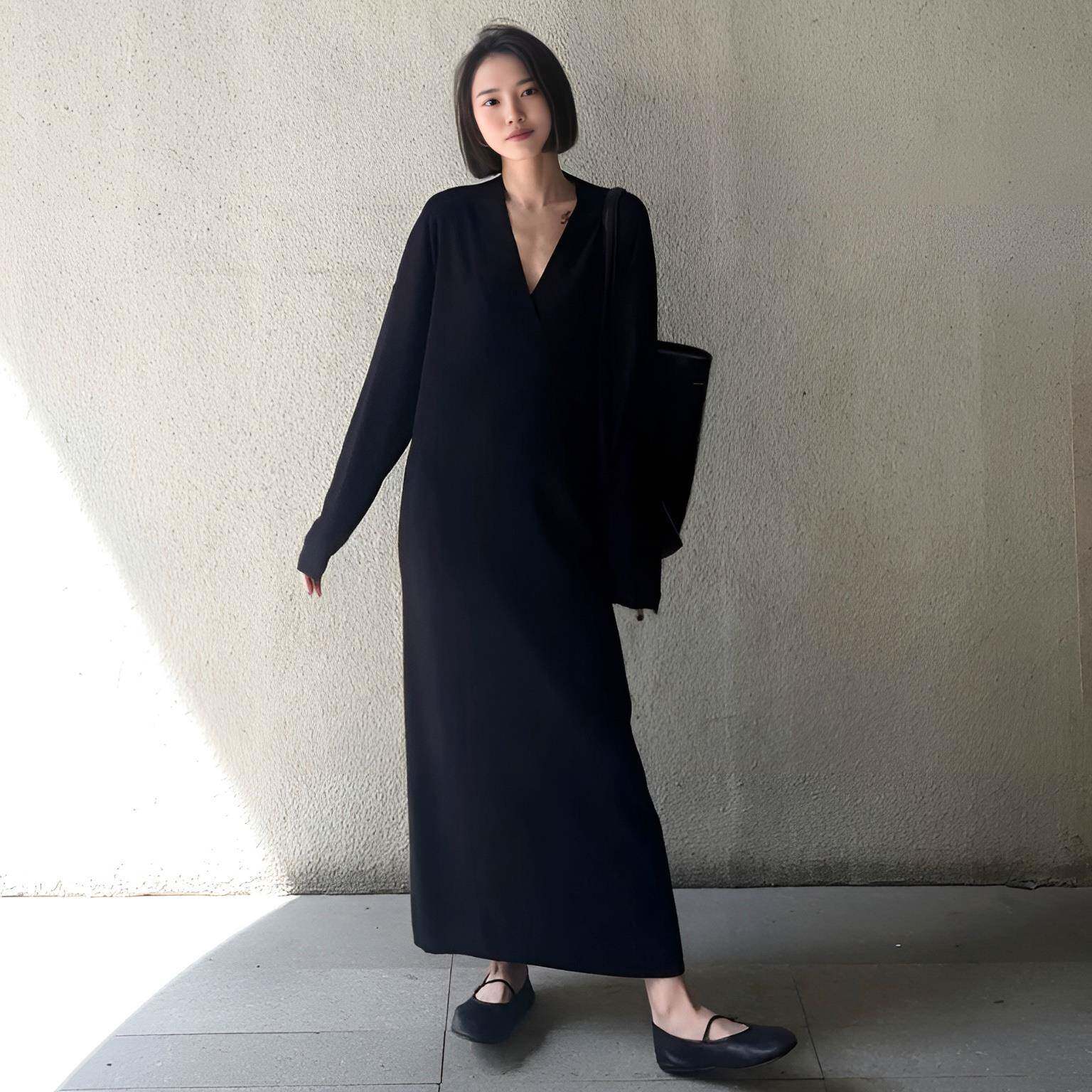 高级感慵懒风针织连衣裙女秋冬季宽松长款小黑裙冷淡风V领长裙子