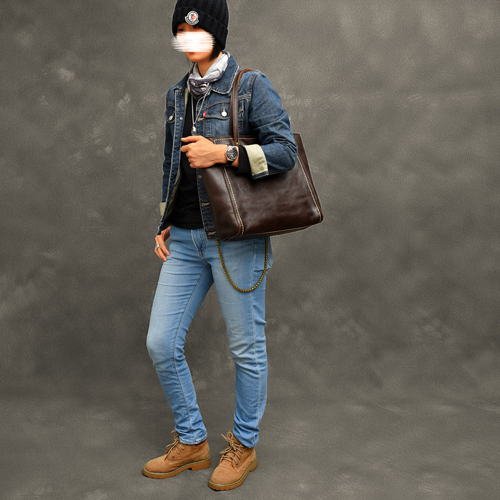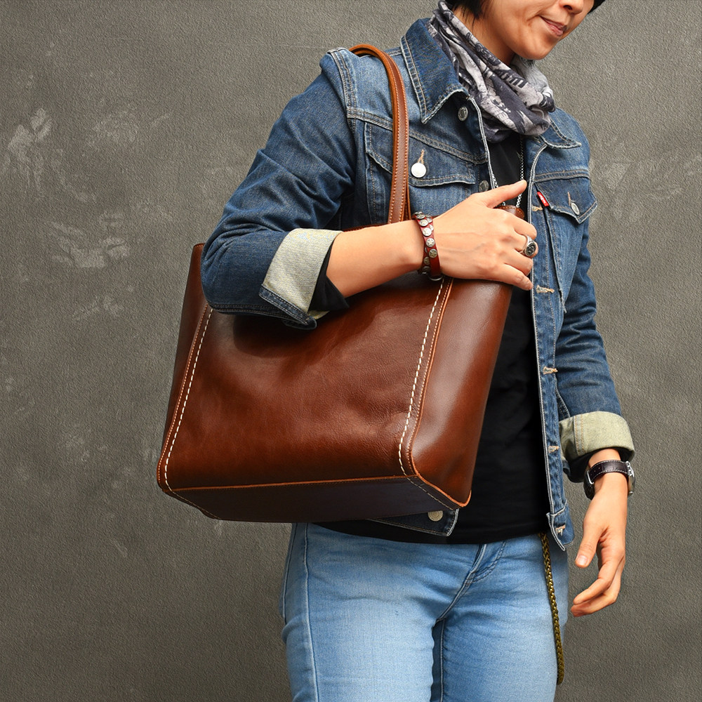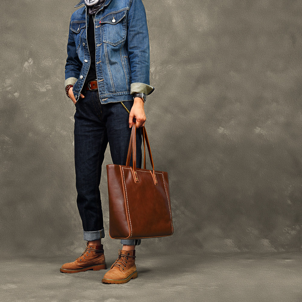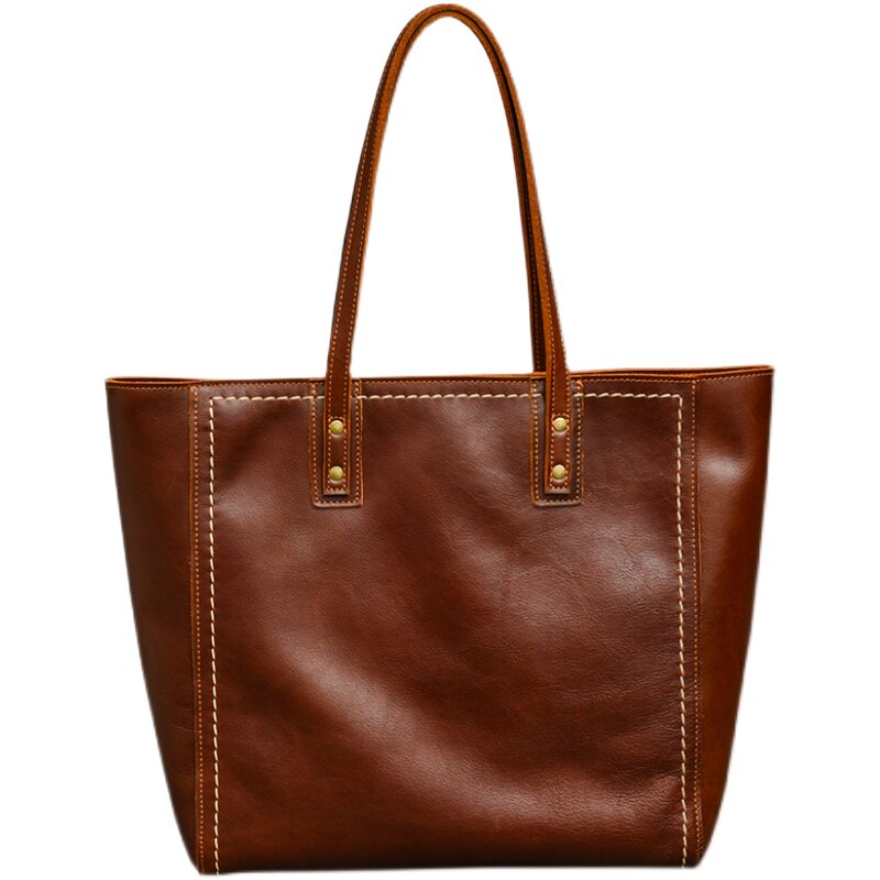 二十四街 通用牛皮横款通勤托特包复古真皮手提包单肩大包电脑包