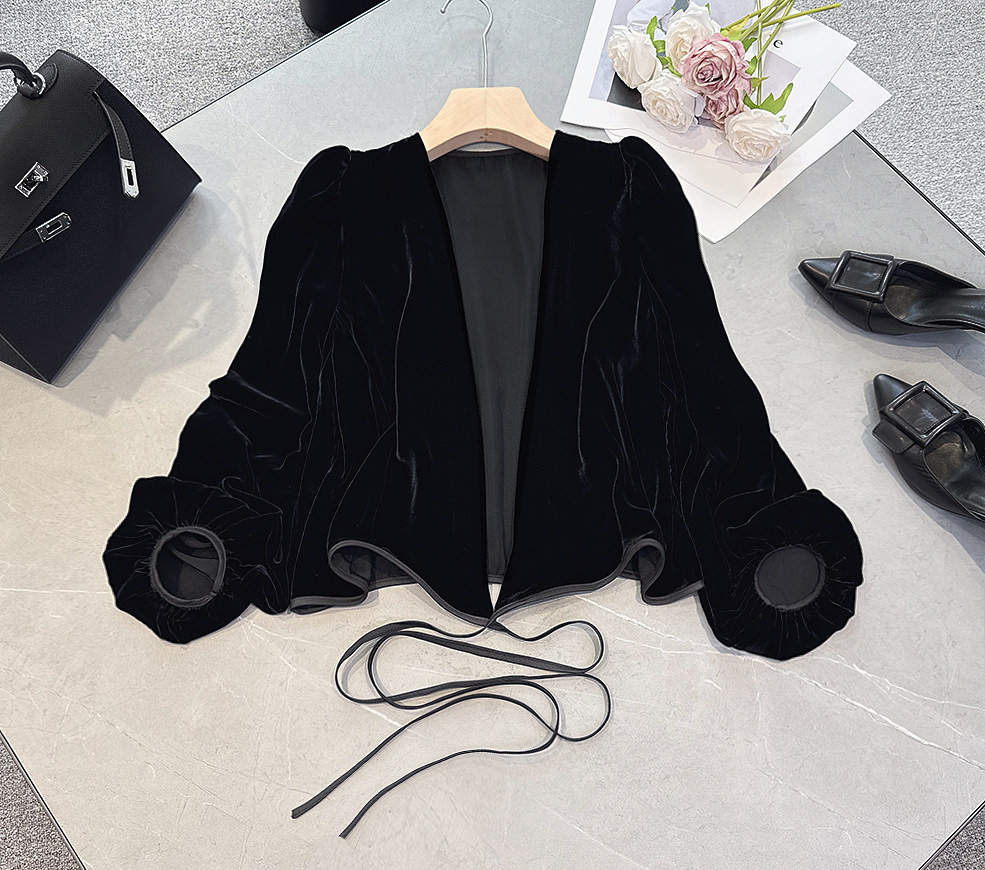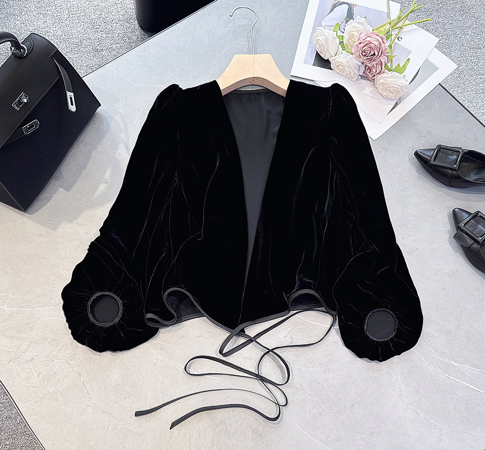 欧洲站2026新款时尚百搭休闲宽松泡泡袖桑蚕丝真丝绒开衫外套外搭