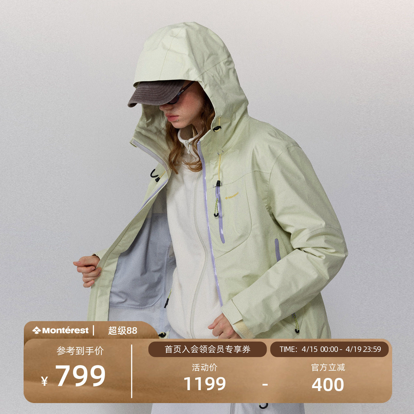 --------------------- 瞬时山野Monterest空山雨户外C6防泼水徒步登山三合一冲锋衣夹克 --------------------- --------------------- 【原价】1199元 【券后价】729元