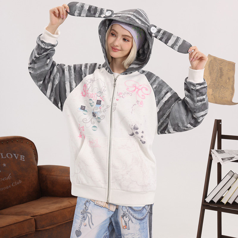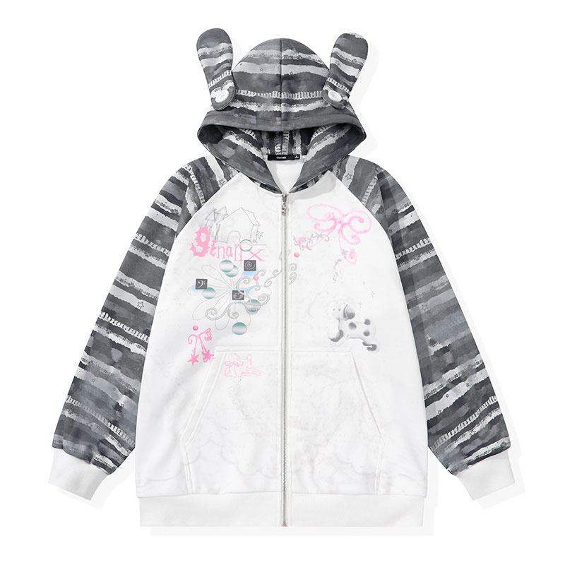 童禹坤同款GENANX闪电潮牌开衫卫衣可爱兔耳朵帽子情侣夹克外套