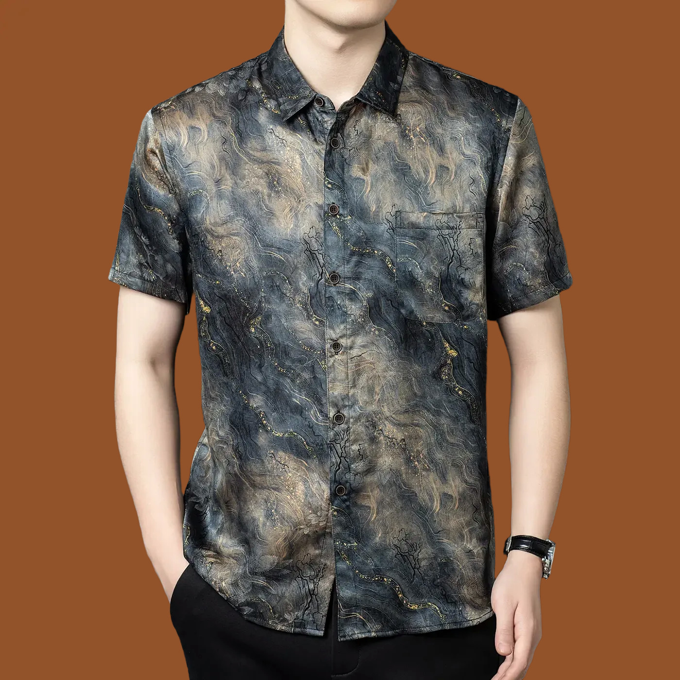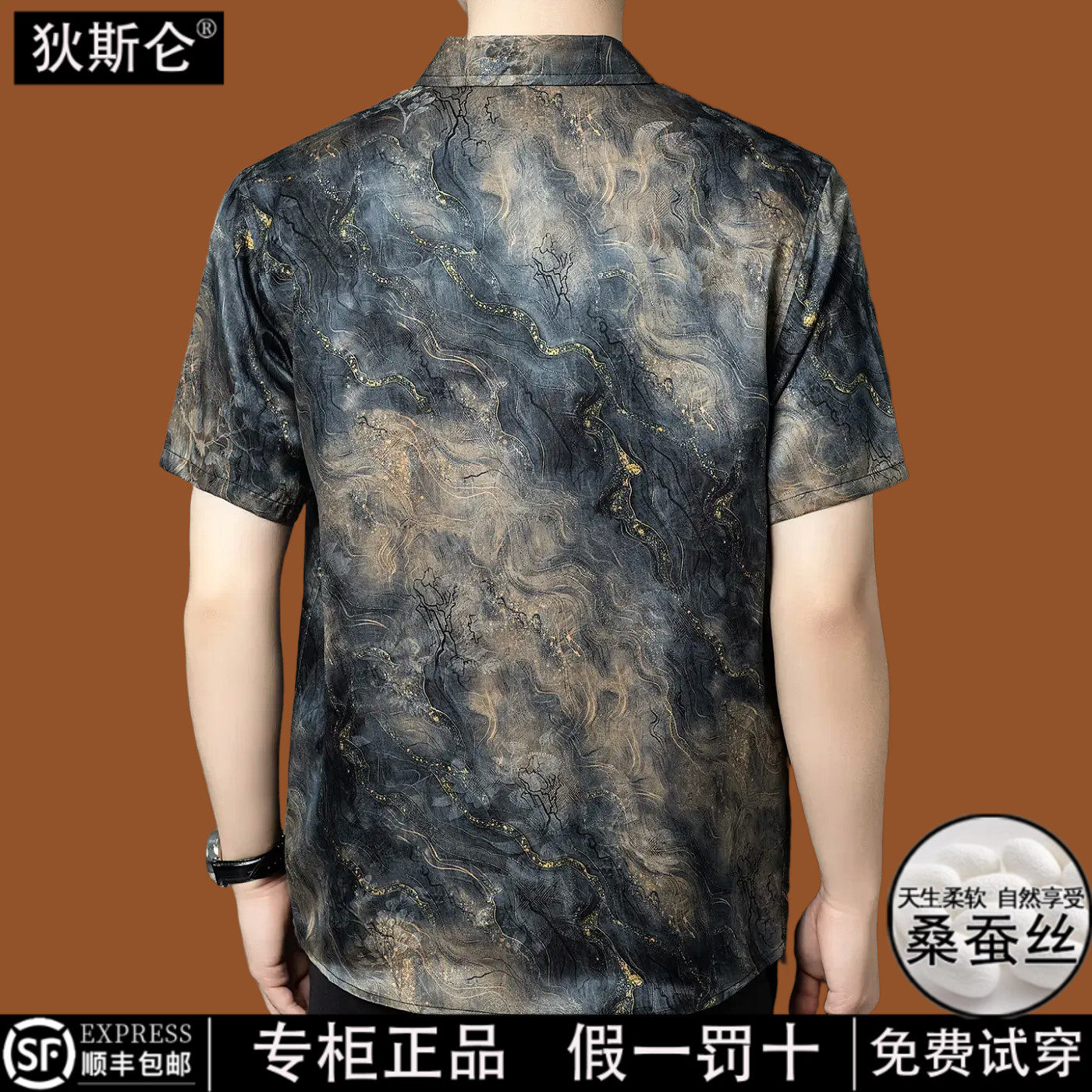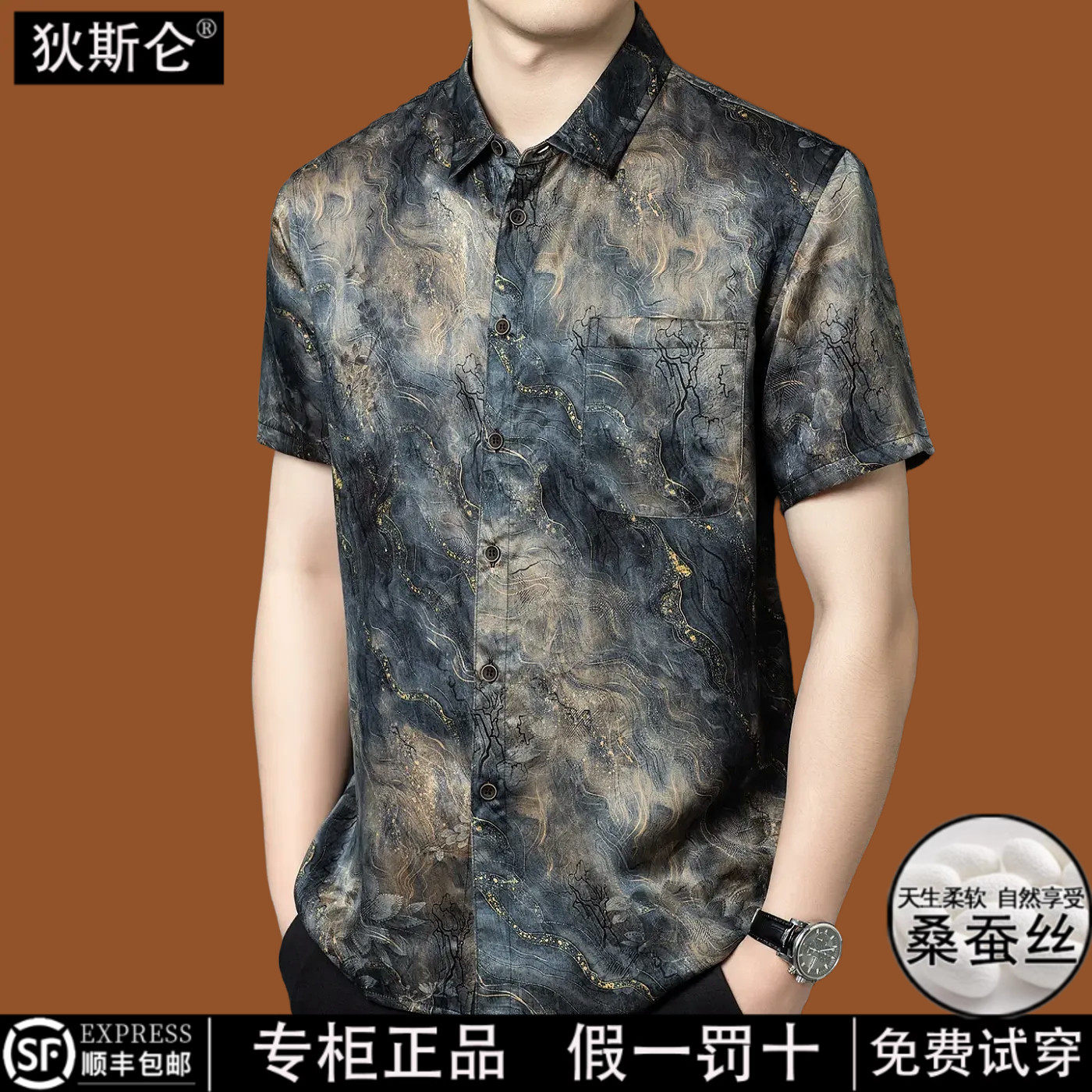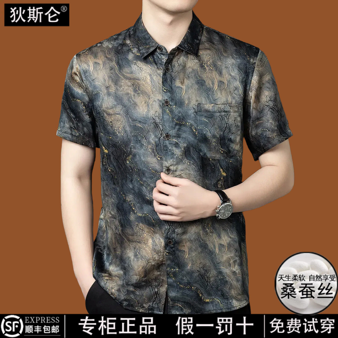 狄斯仑国潮风真丝短袖衬衫男夏季100%桑蚕丝免烫透气百搭时尚衬衣