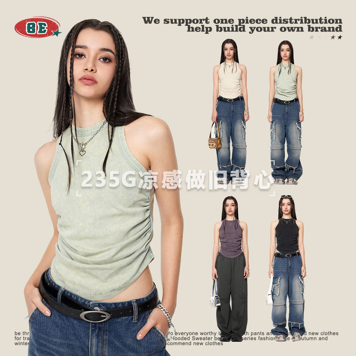 BE女装|2025春夏新款美式做旧辣妹风女款背心性感纯欲褶皱背心女