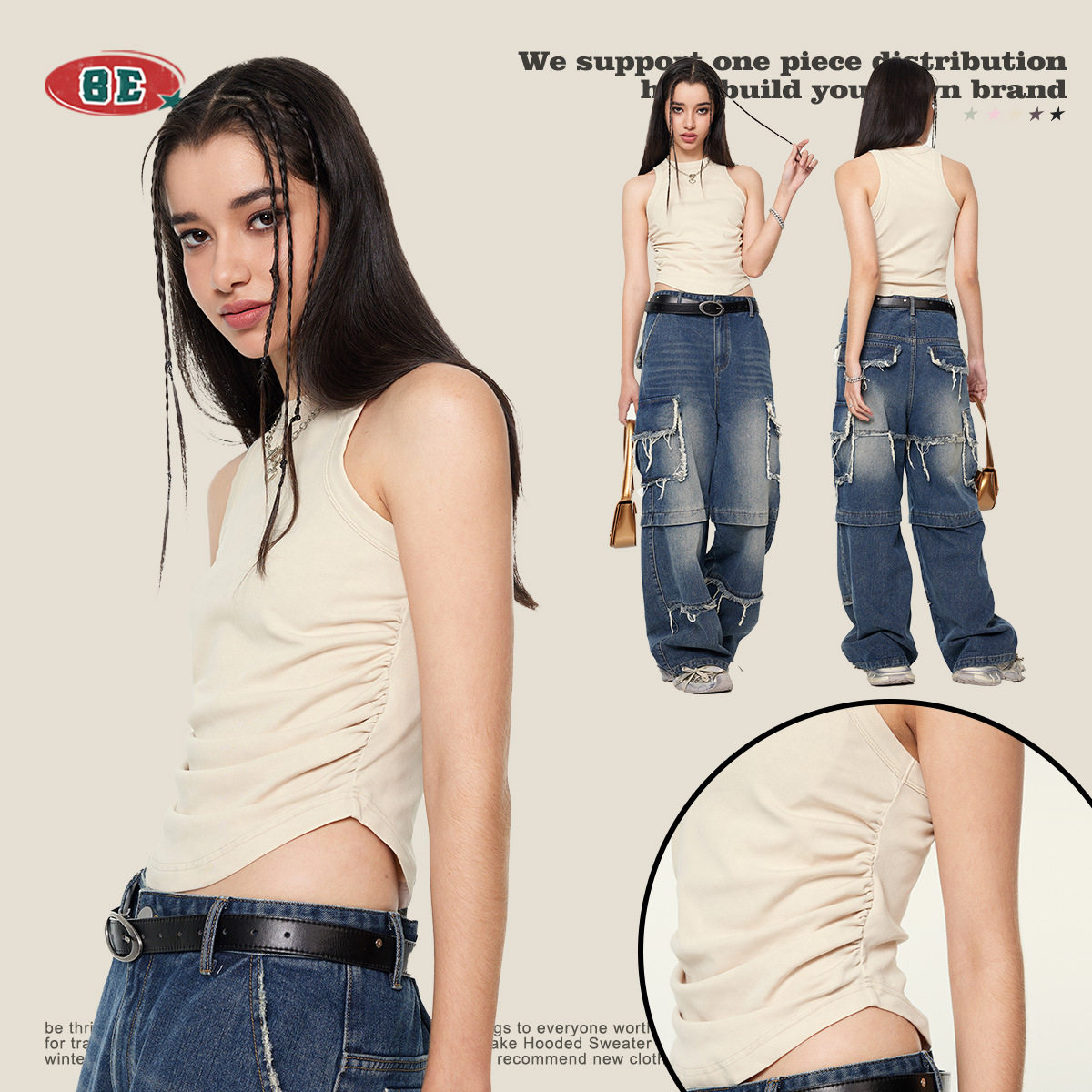 --------------------- BE女装|2025春夏新款美式做旧辣妹风女款背心性感纯欲褶皱背心女 --------------------- --------------------- 【原价】75.7元 【券后价】55.7元