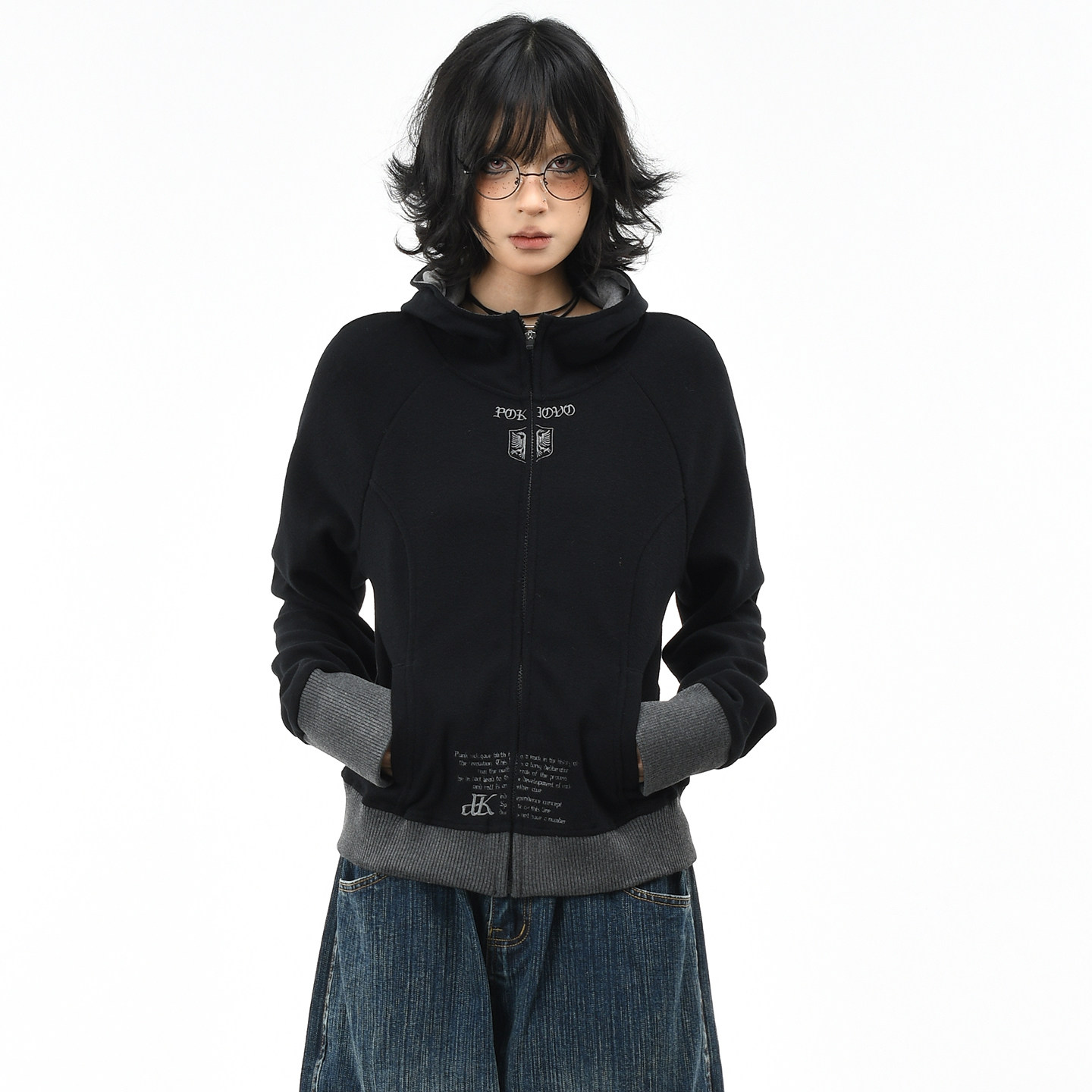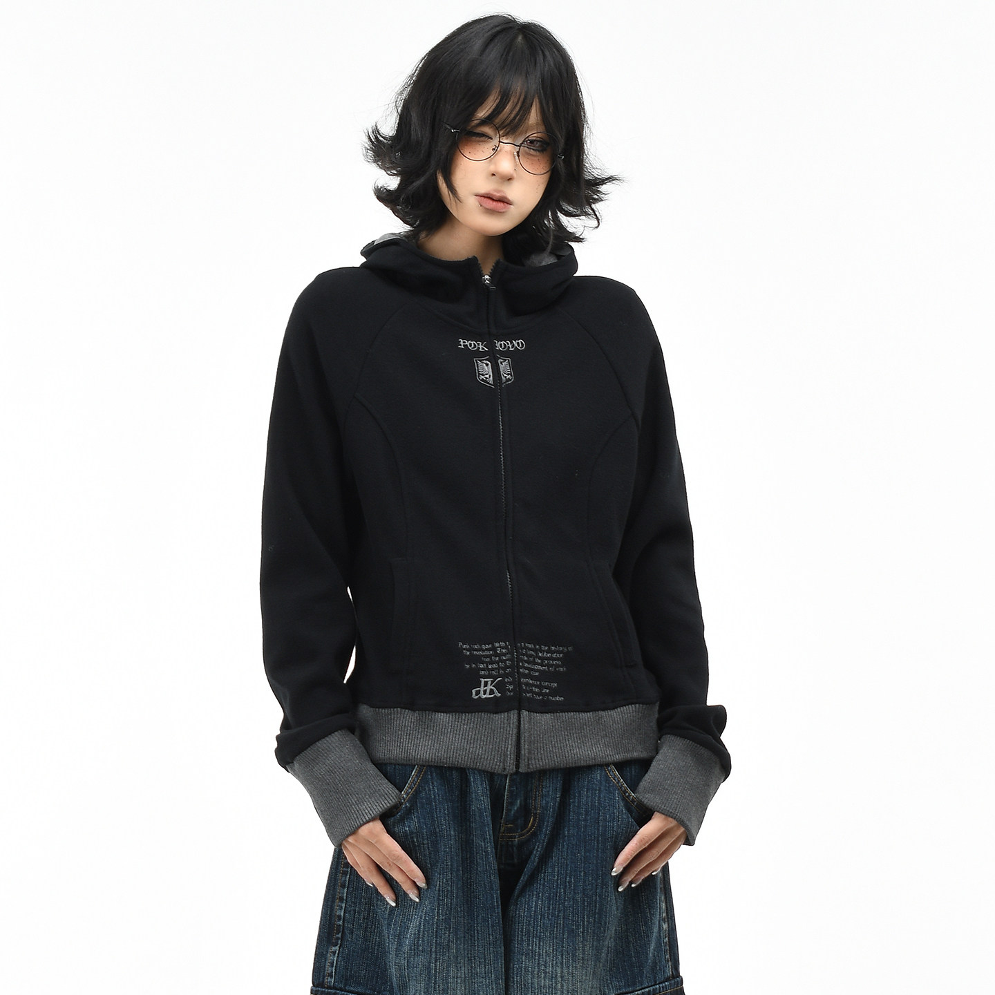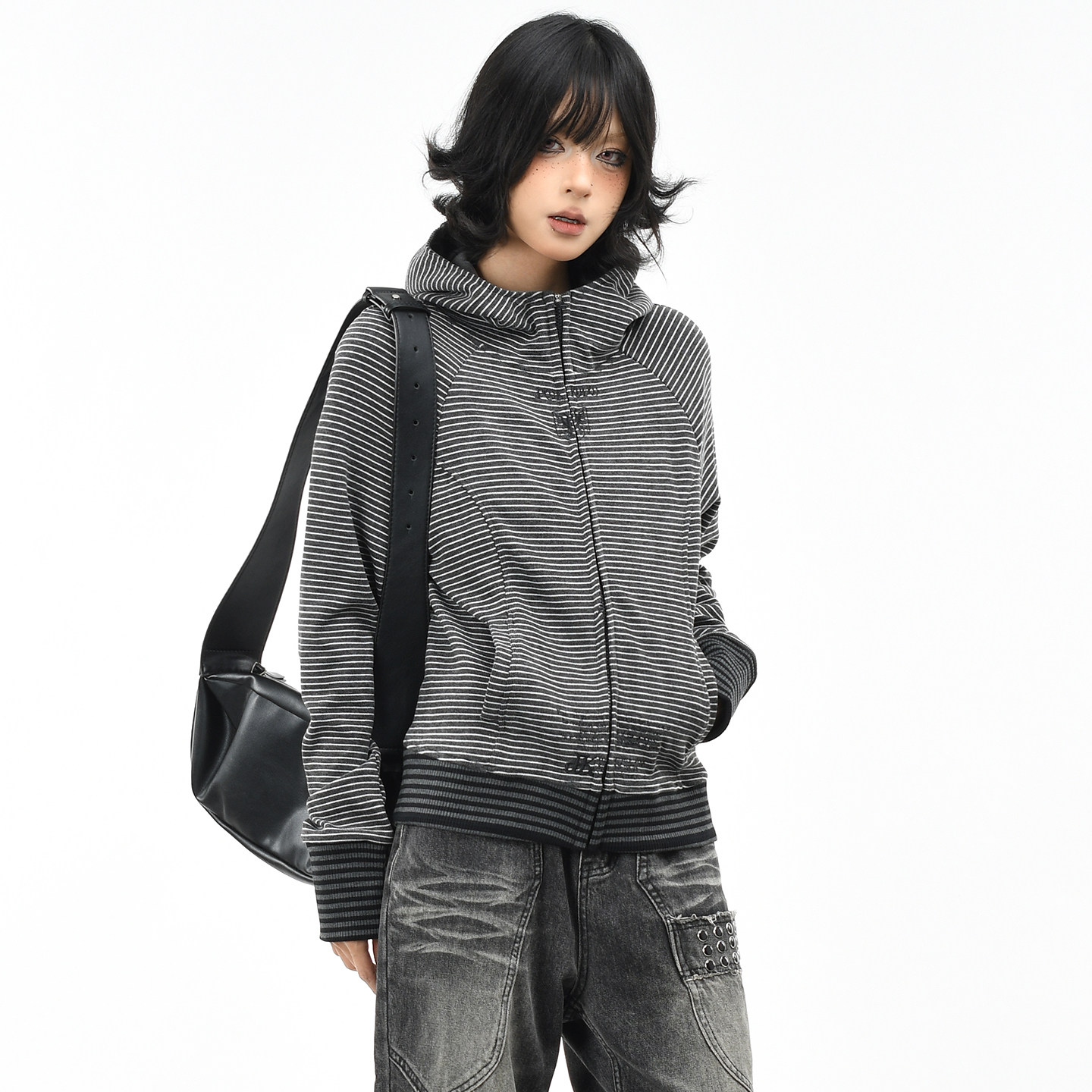 OV原创美式复古条纹修身连帽卫衣女春季街头休闲短款开衫外套上衣