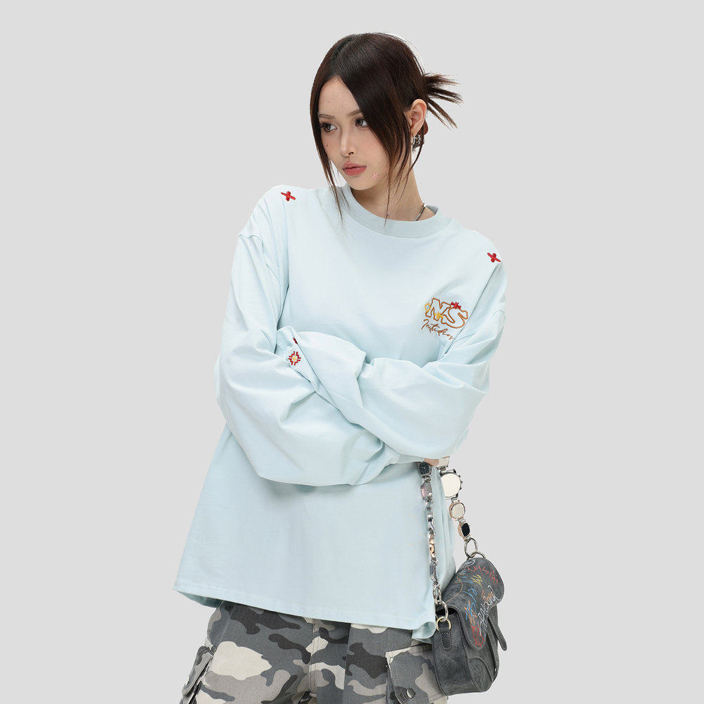 【INSKR】国潮情侣美式「几何LOGO刺绣长袖」宽松打底衫上衣T恤男