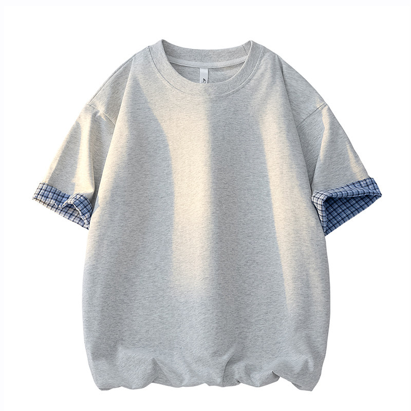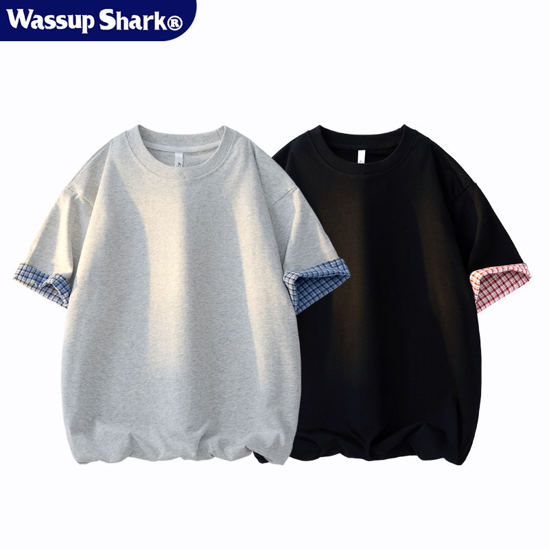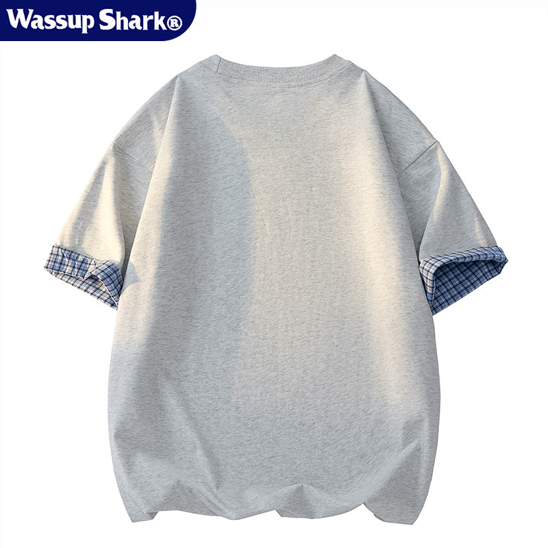 Wassup Shark日系格子翻边纯棉短袖T恤男女夏季拼接撞色休闲上衣