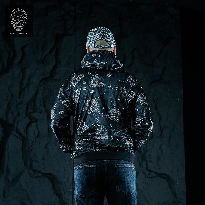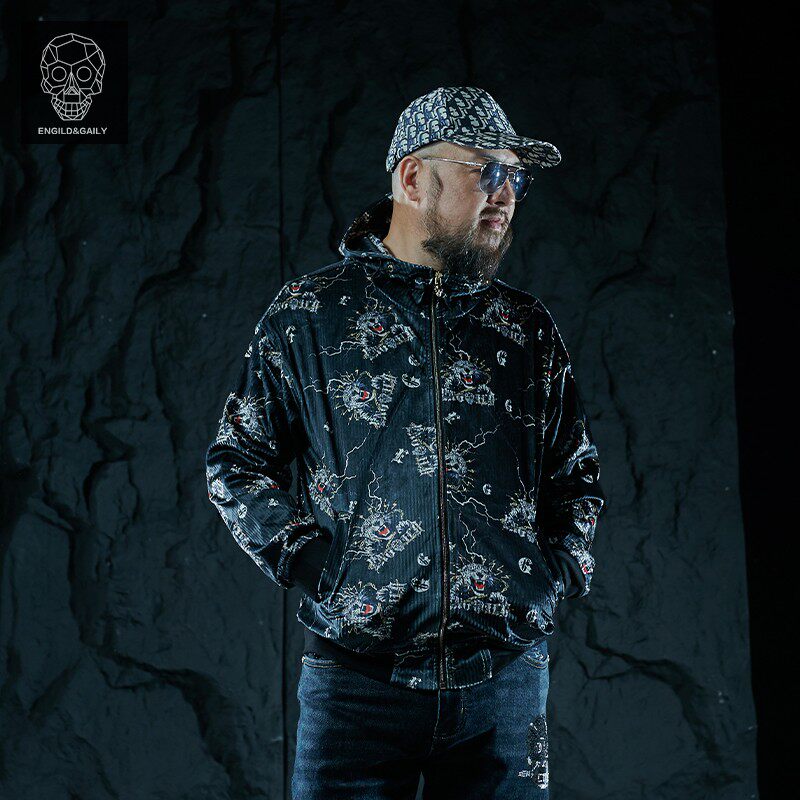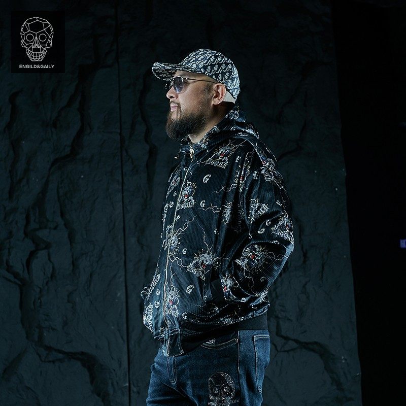 金刚铁甲骷髅头原创潮牌拉链连帽豹子头印花外套夹克男亮面棒球服