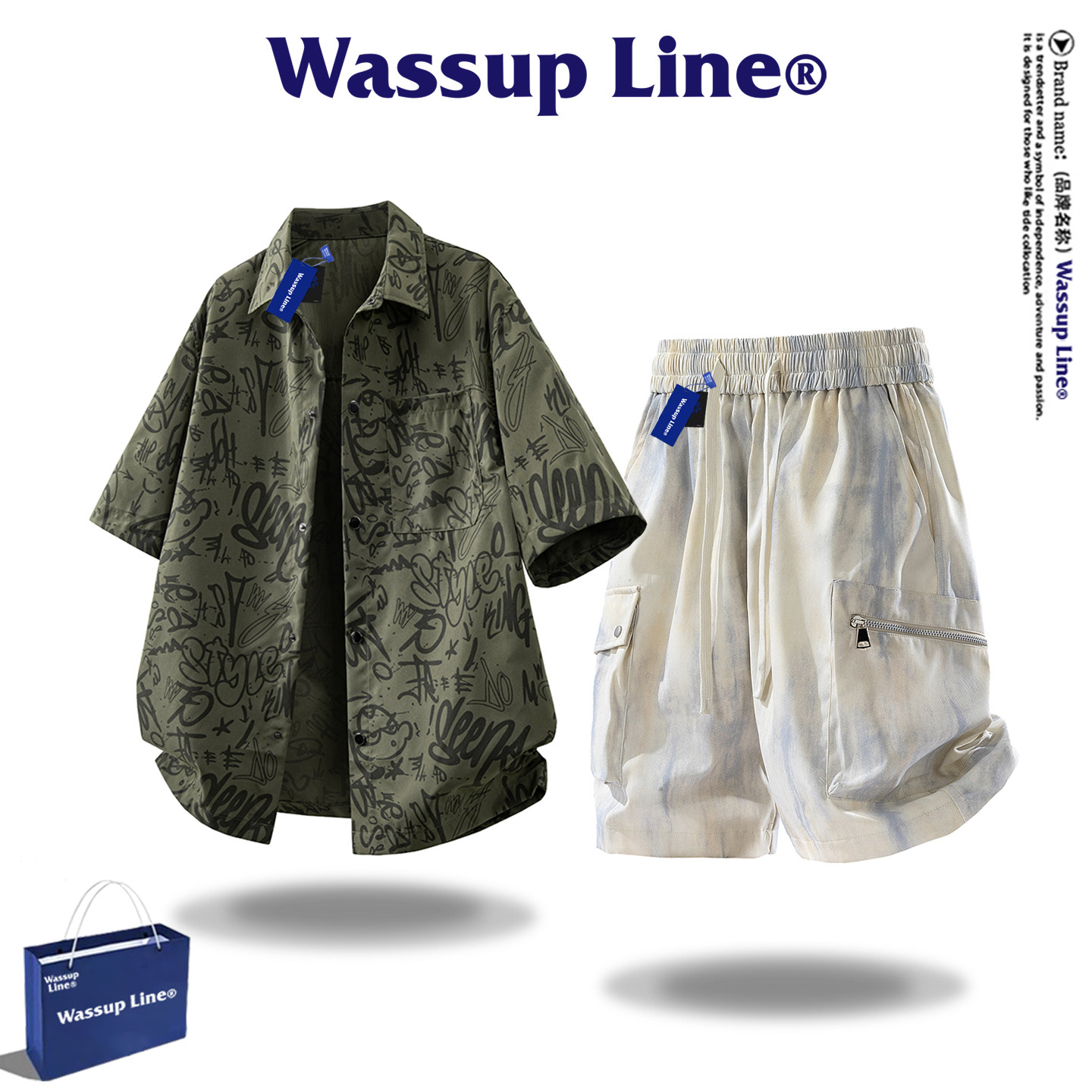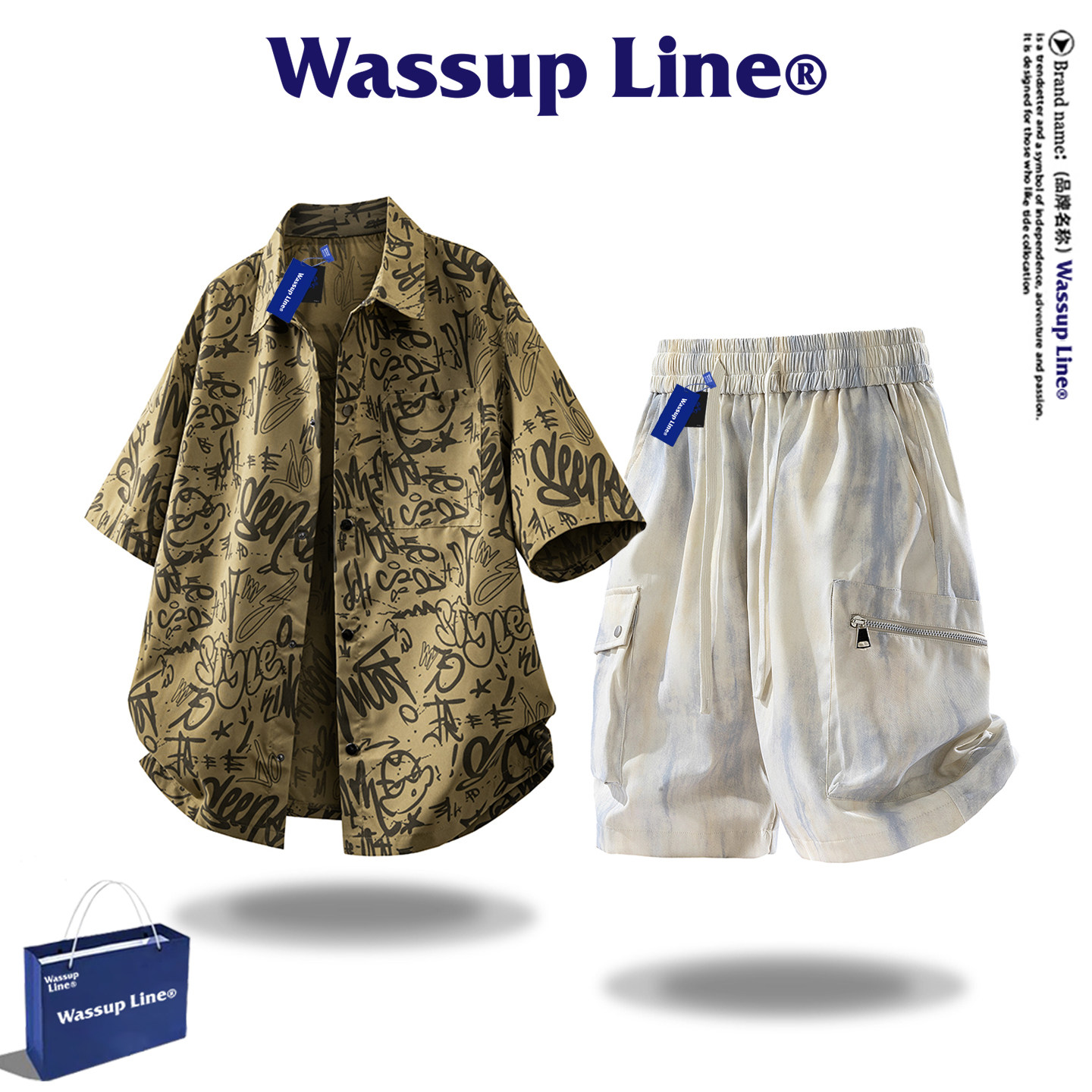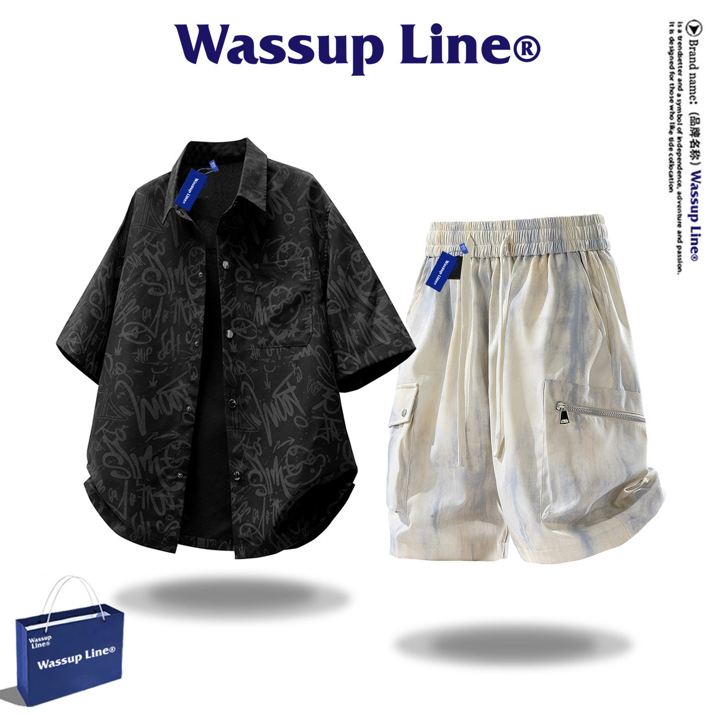 --------------------- WASSUP Line潮牌美式套装男款短袖衬衫外套衬衣五分裤两件套夏季 【原售价】398元 【现售价】68.6元 【推荐理由】