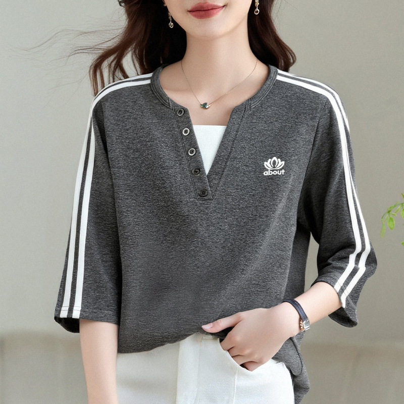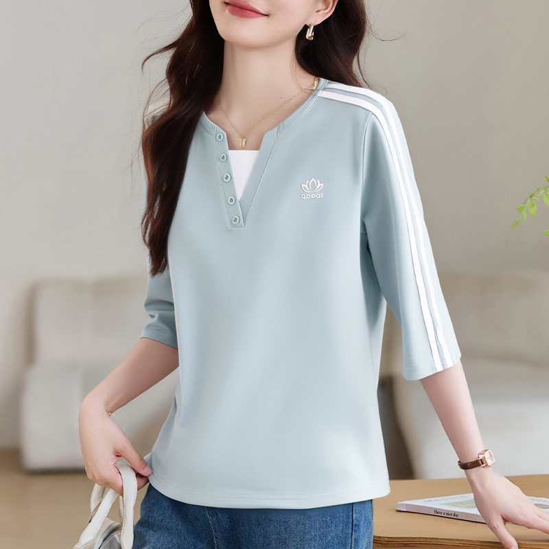 正肩宽松洋气七分袖遮肉显瘦假两件2025年夏季上衣时尚龄女装