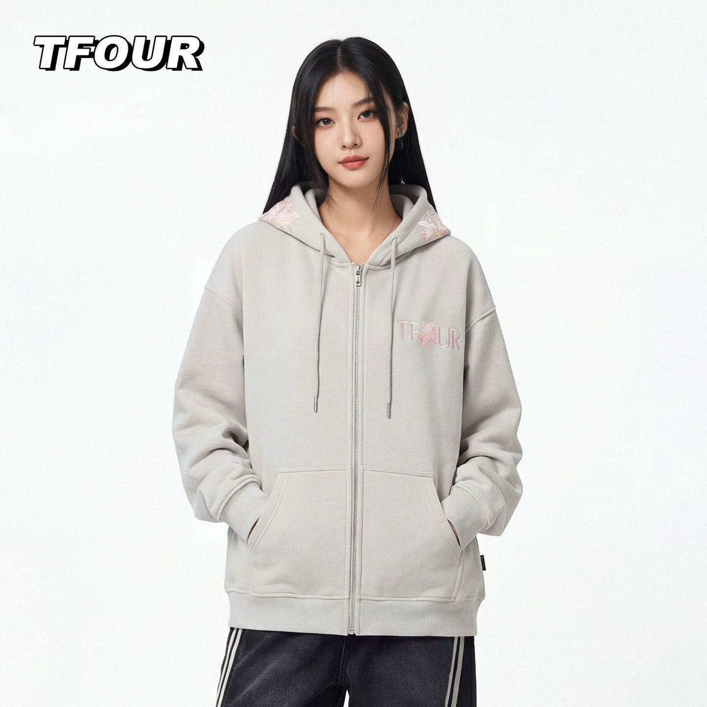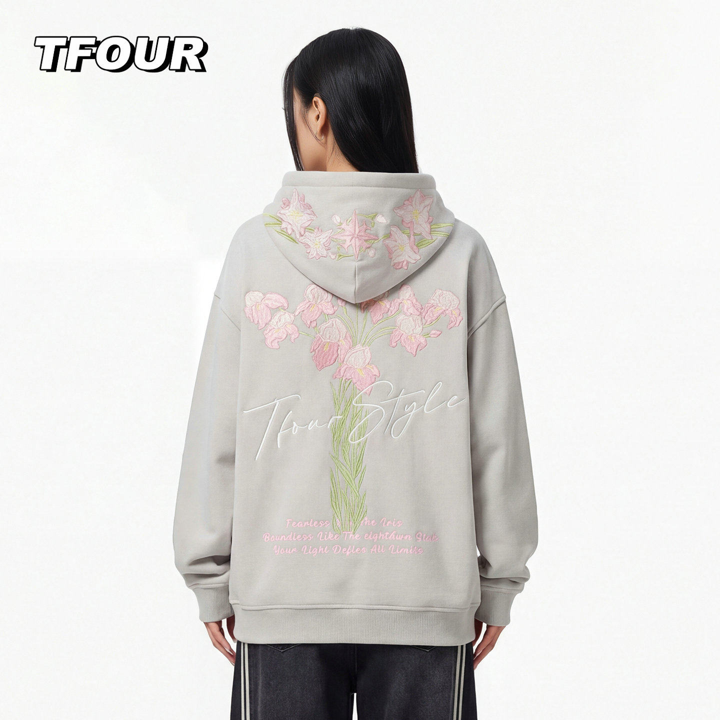 TFOUR 2026美式重磅花卉刺绣卫衣男女春秋季潮牌宽松情侣薄绒外套