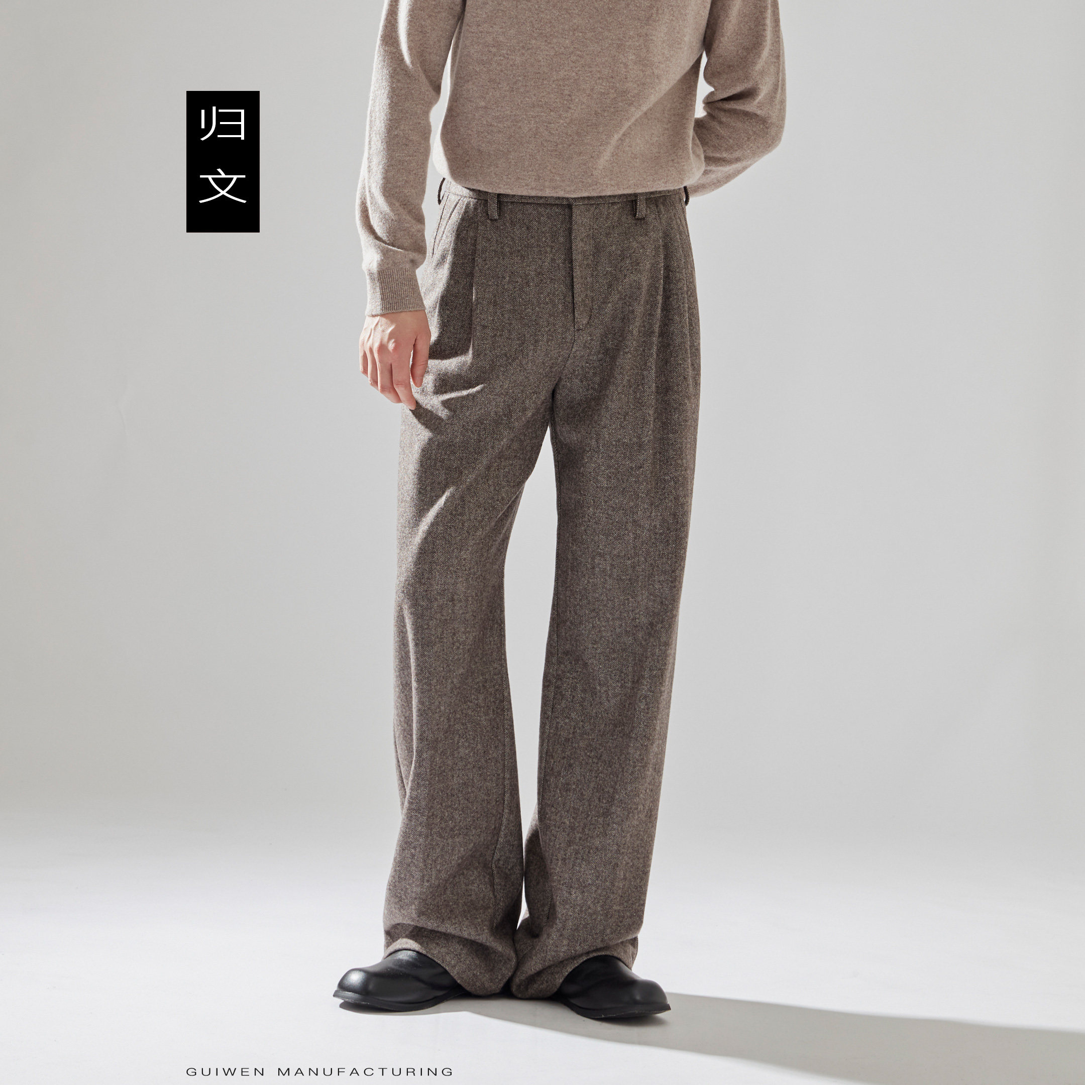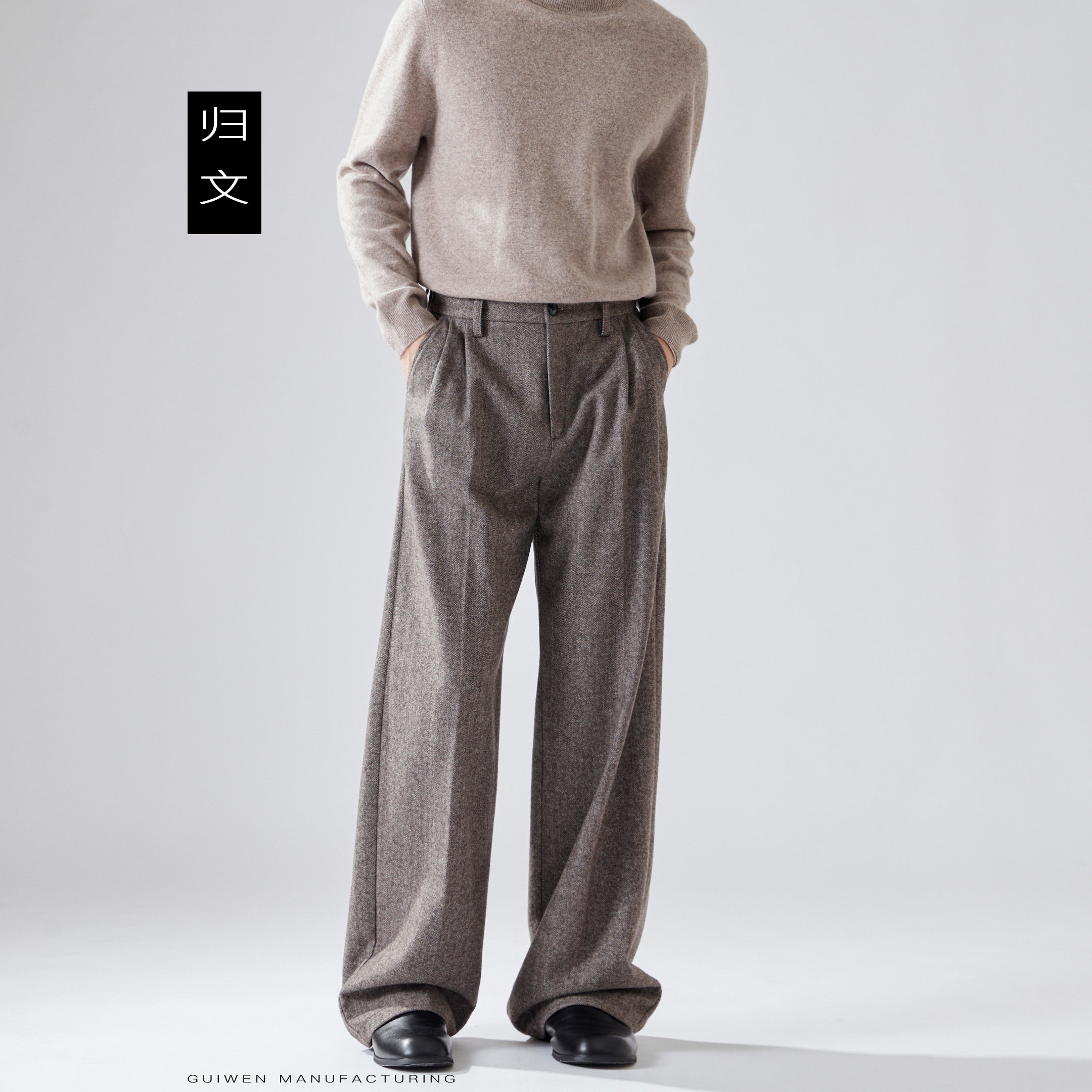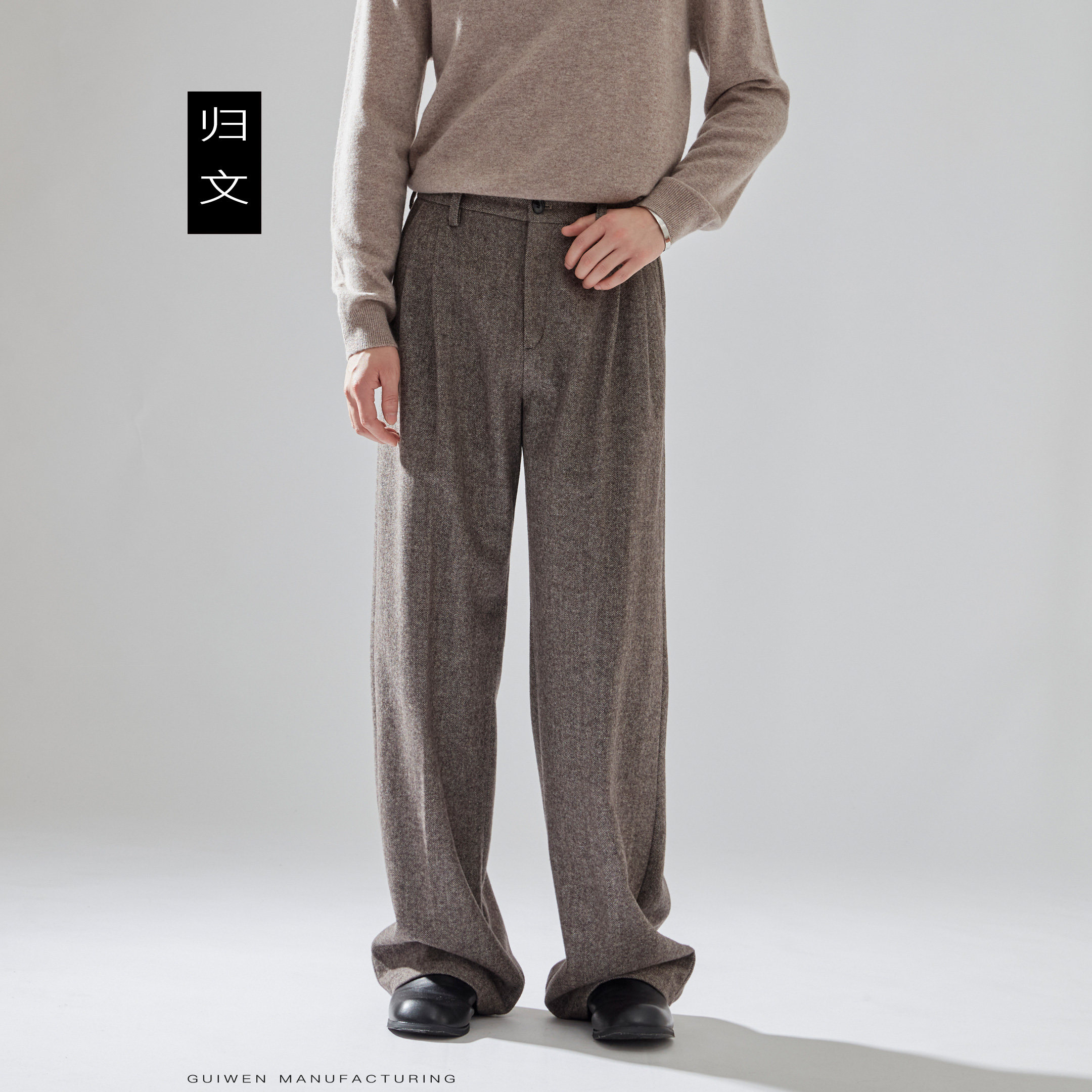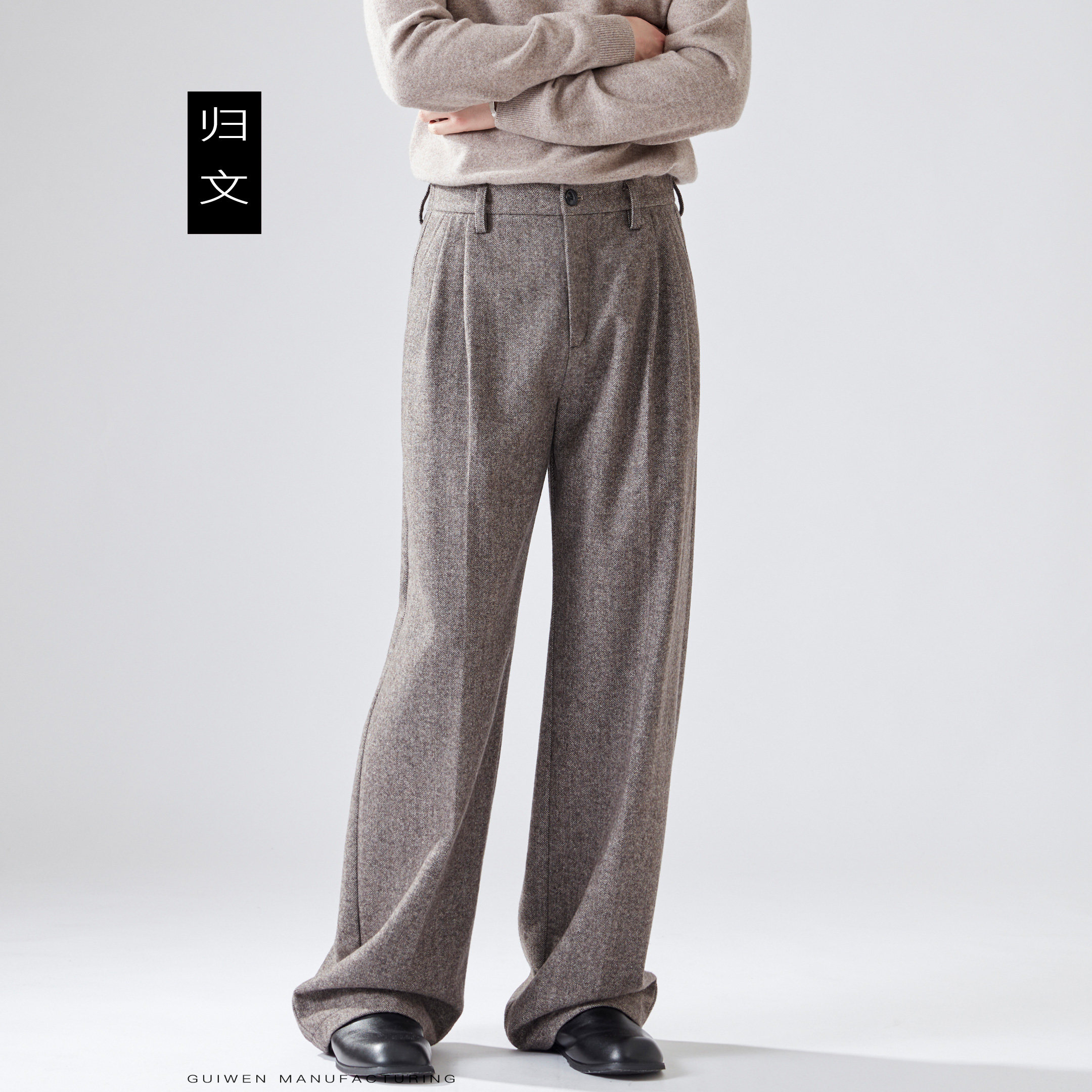 棕色人字纹毛呢裤男秋冬新款加厚裤子男咖色羊毛西装裤宽松直筒裤