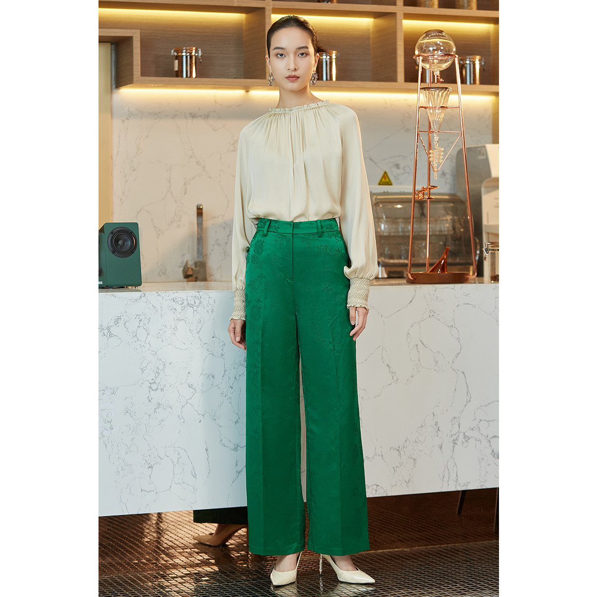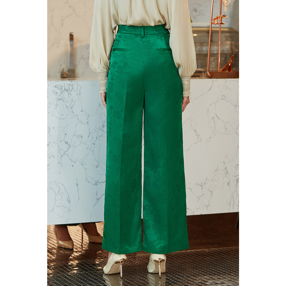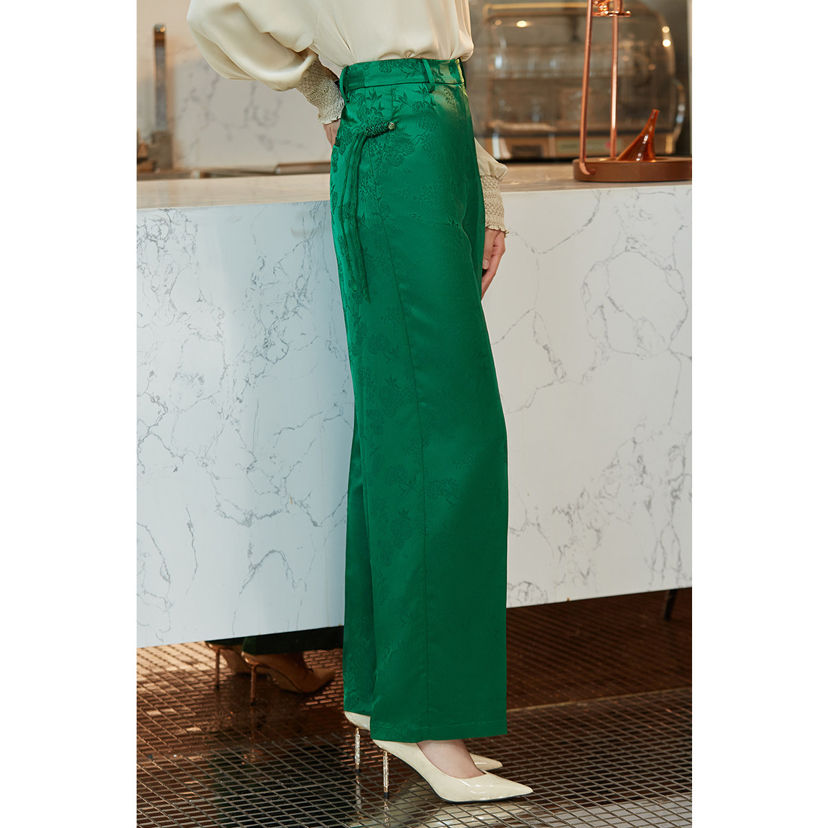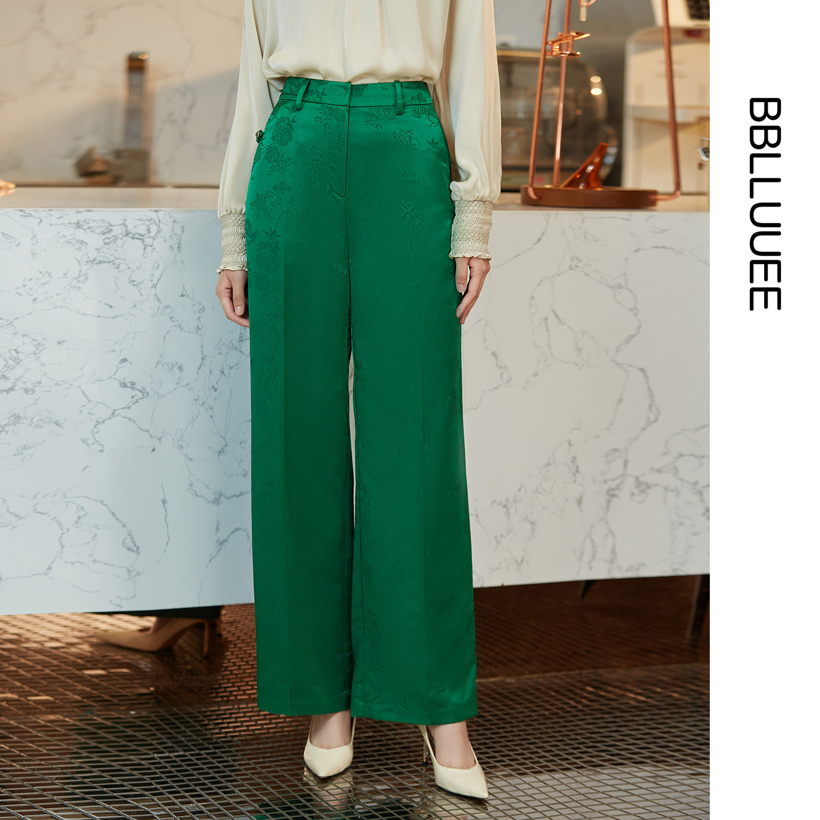 --------------------- BBLLUUEE粉蓝衣橱新中式复古国潮提花直筒裤女2023秋装绿色休闲裤 【原售价】1780元 【现售价】549元 【推荐理由】
