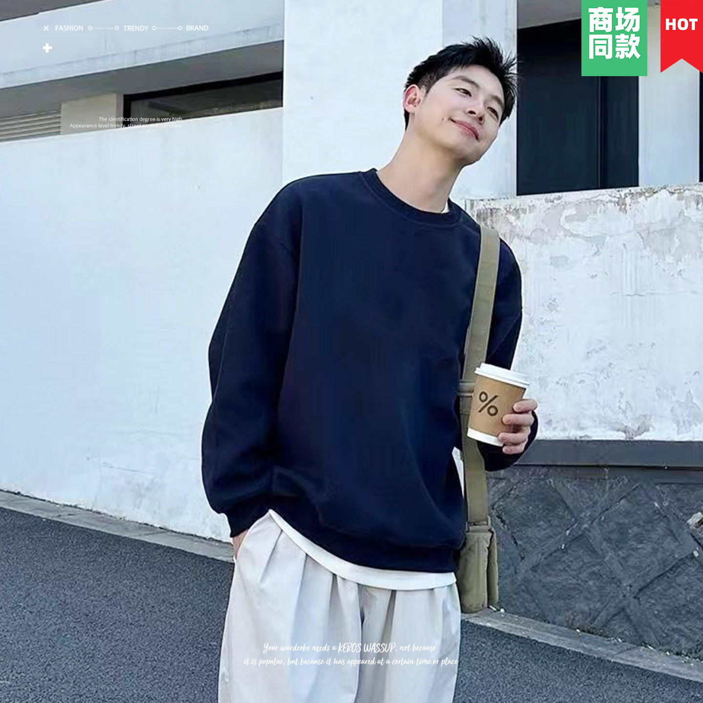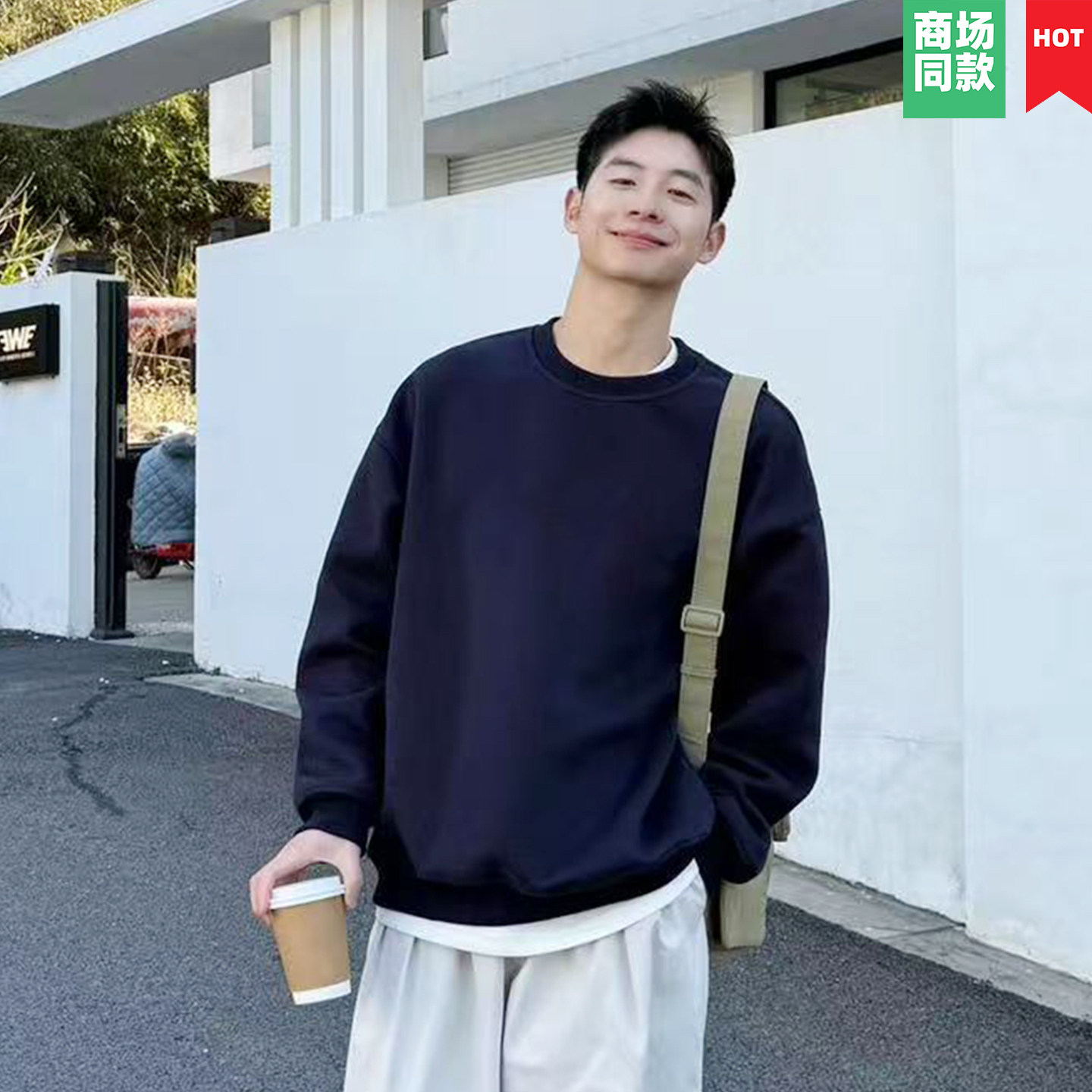 日系复古纯色圆领男士卫衣宽松休闲无帽重磅加厚秋冬内搭长袖上衣
