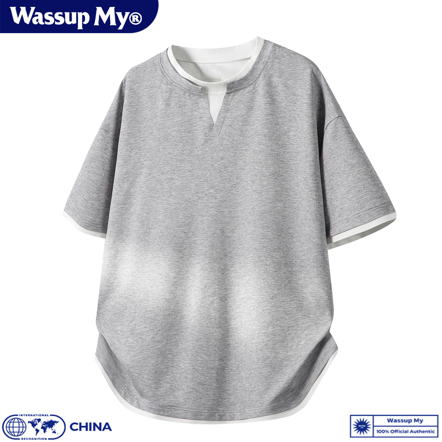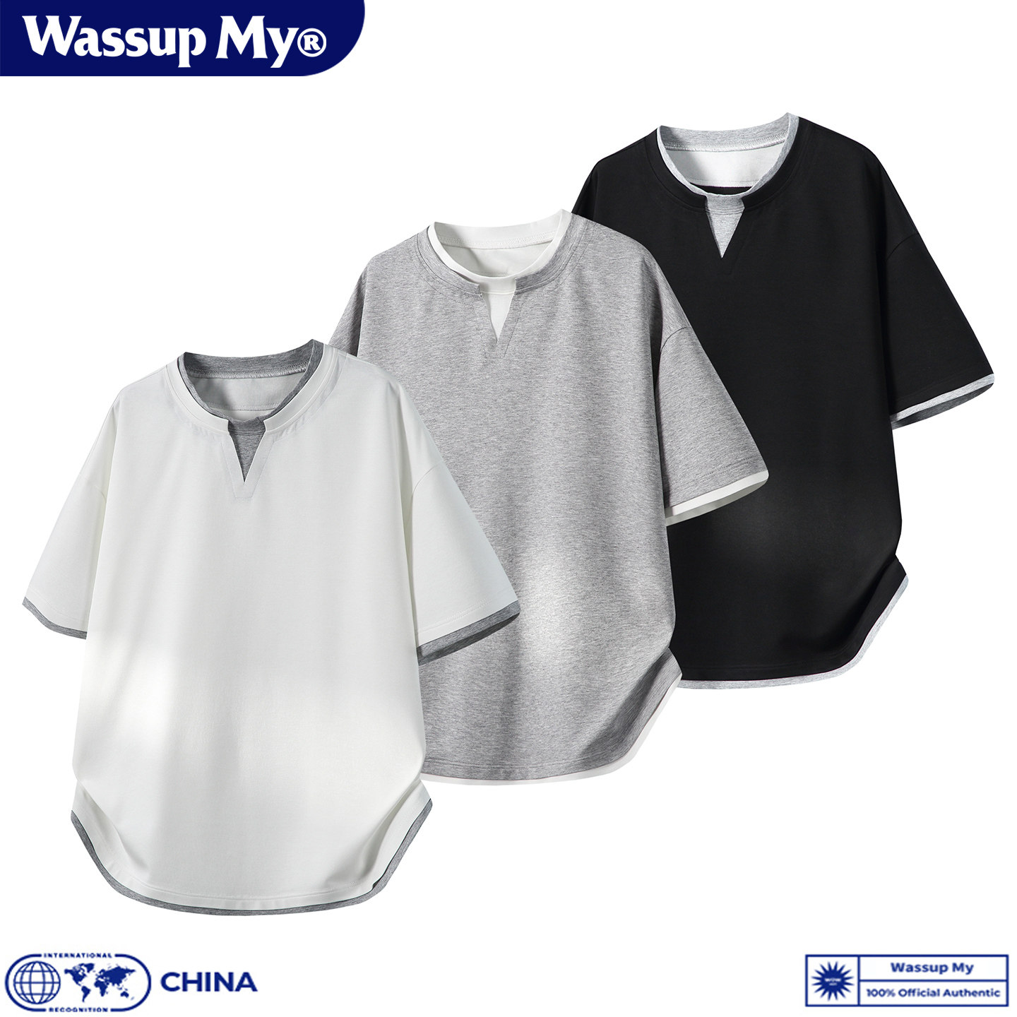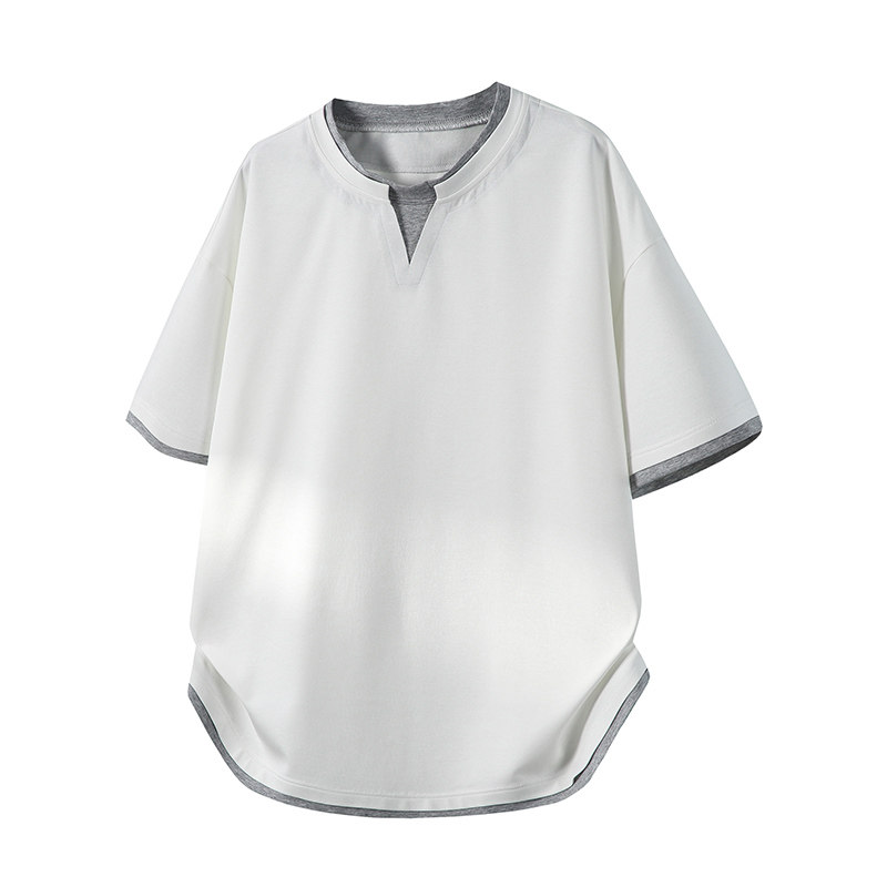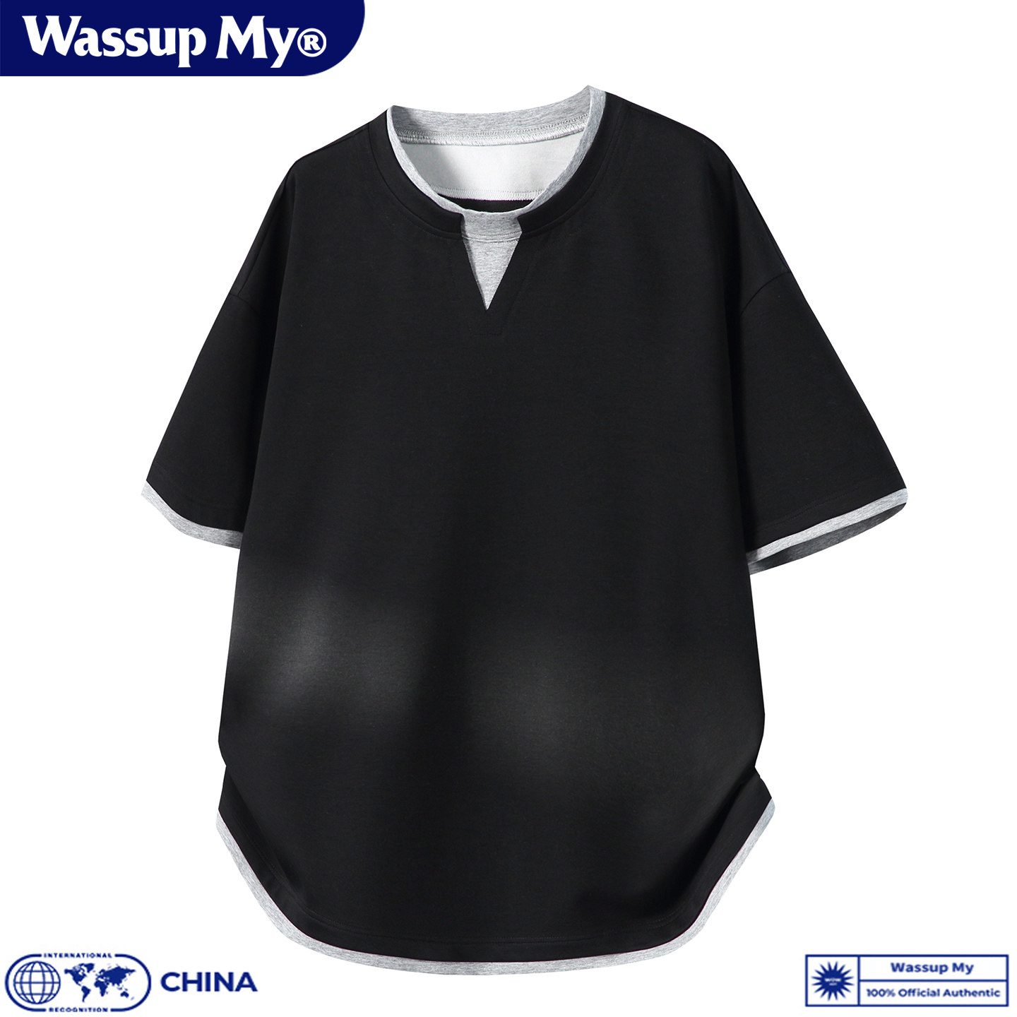 WASSUP MY假两件短袖T恤男夏季宽松休闲简约圆领撞色松弛感上衣潮
