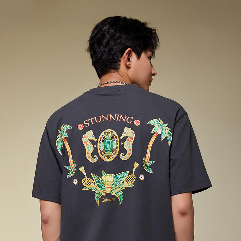 【索罗娜凉感】卡宾男装 印花刺绣国潮风短袖T恤夏季烫钻设计
