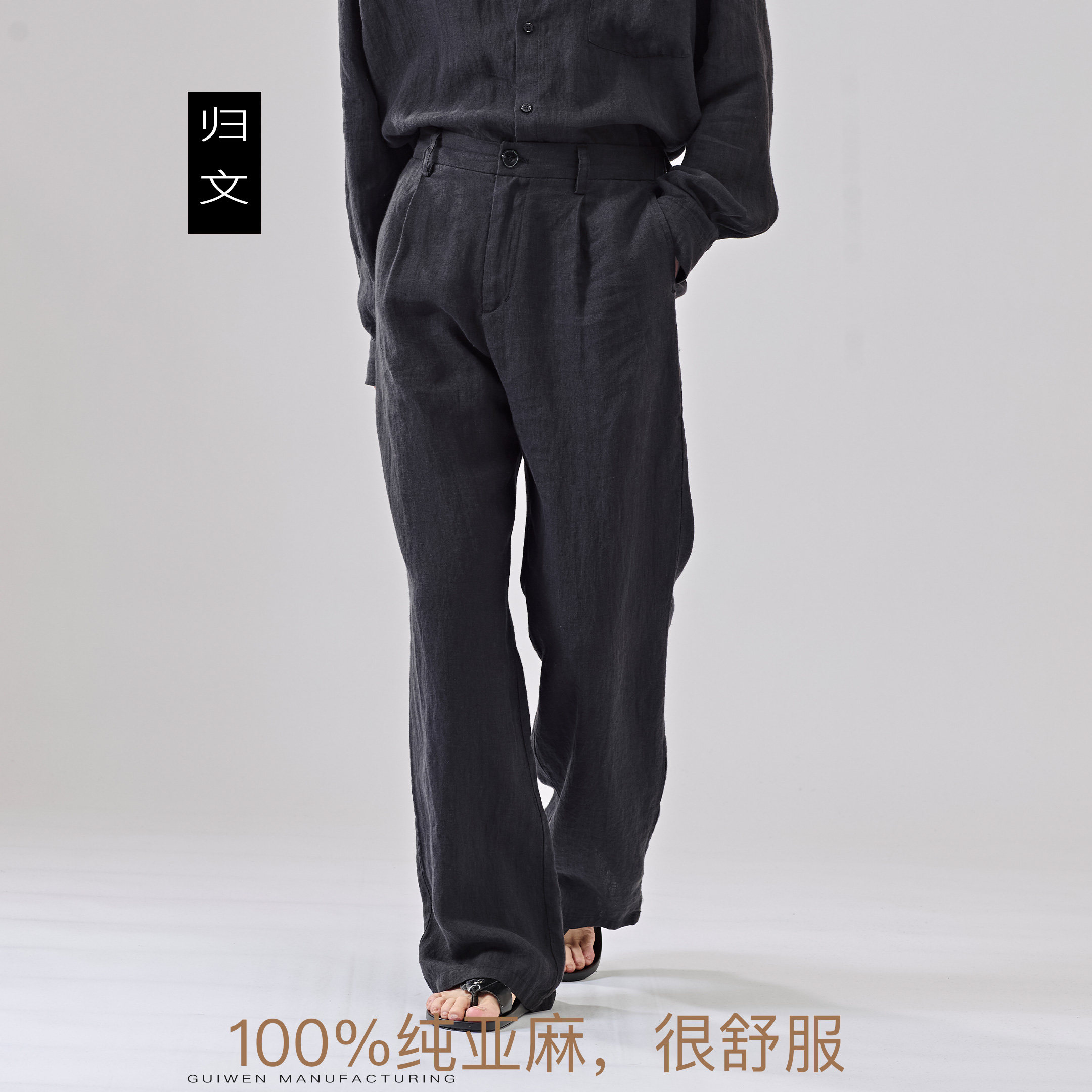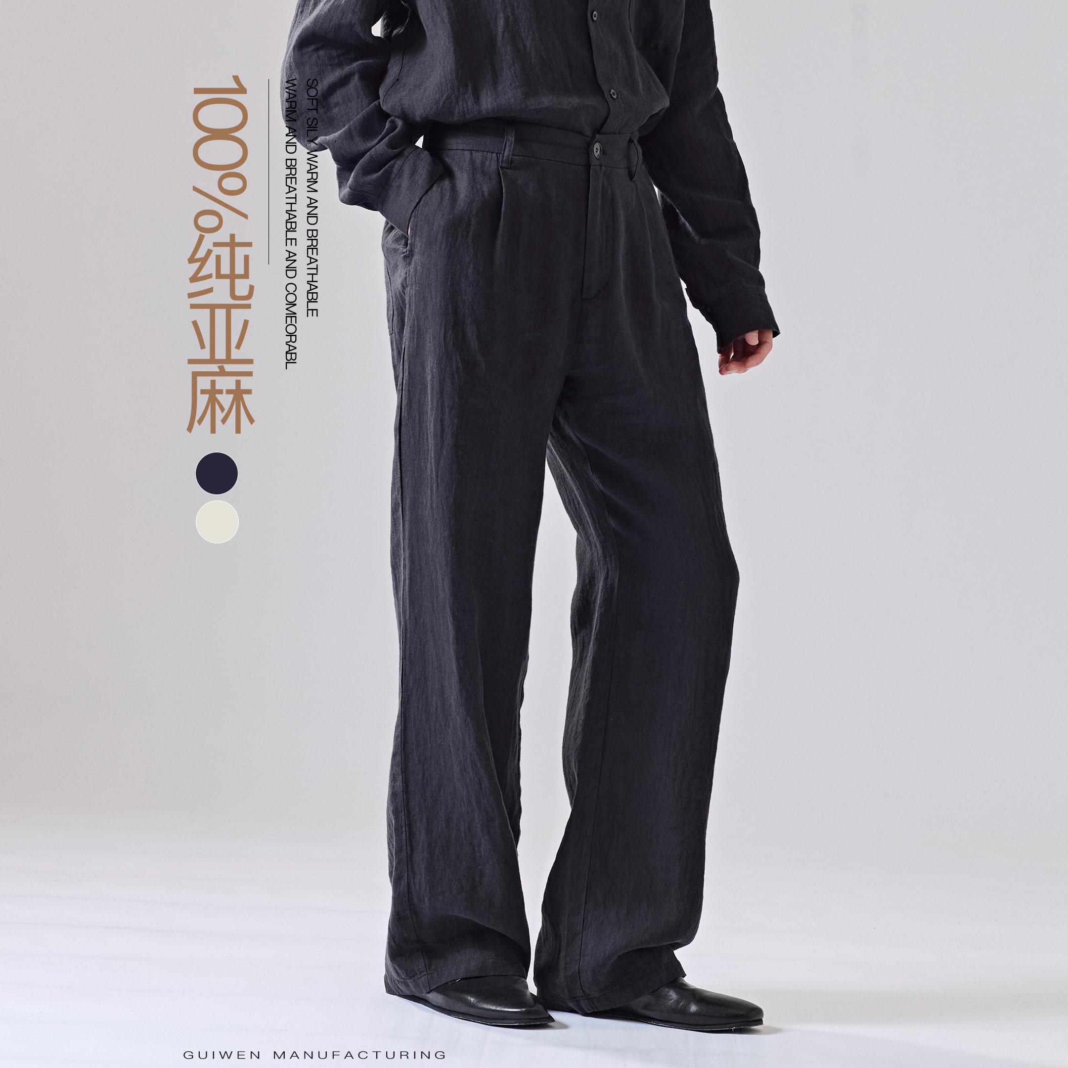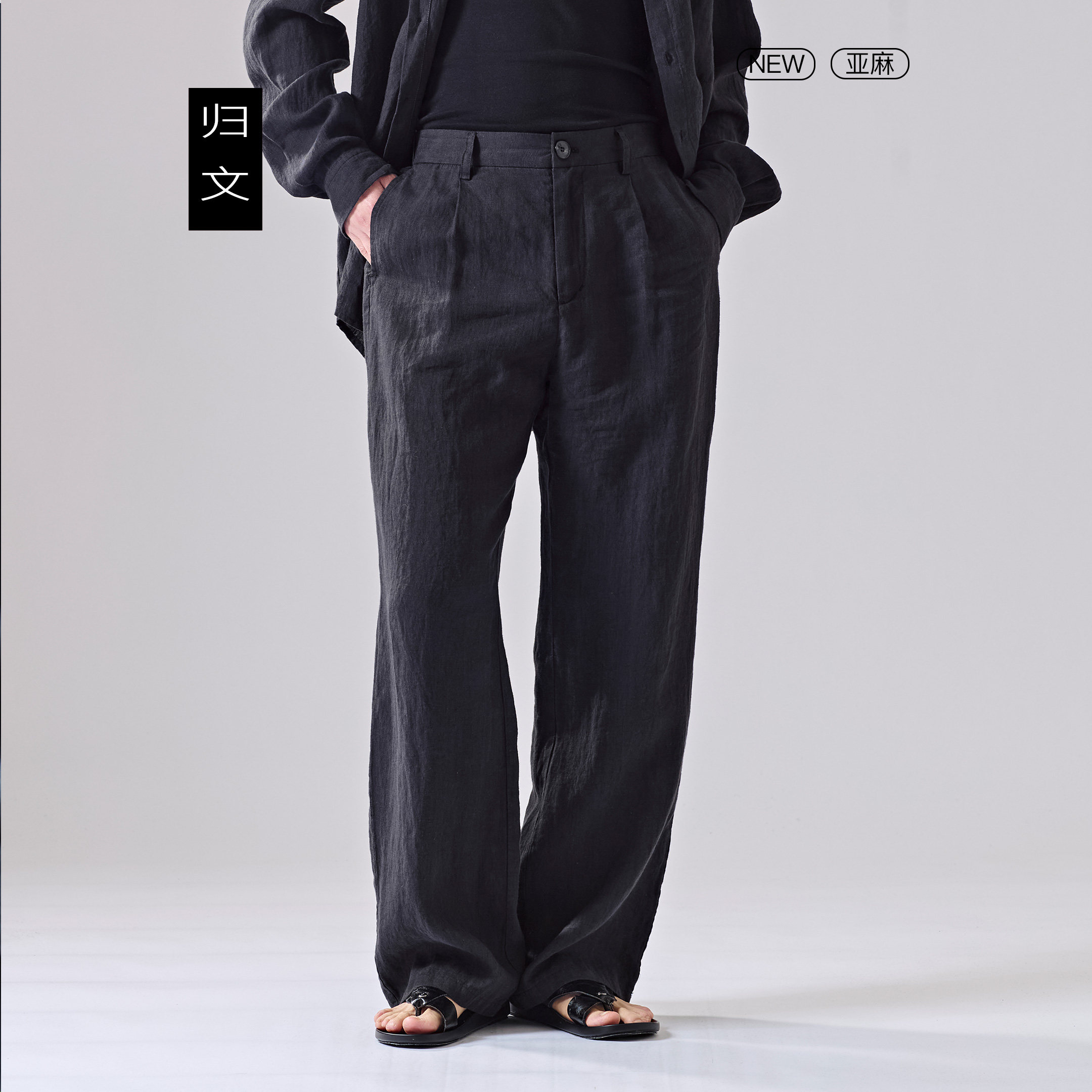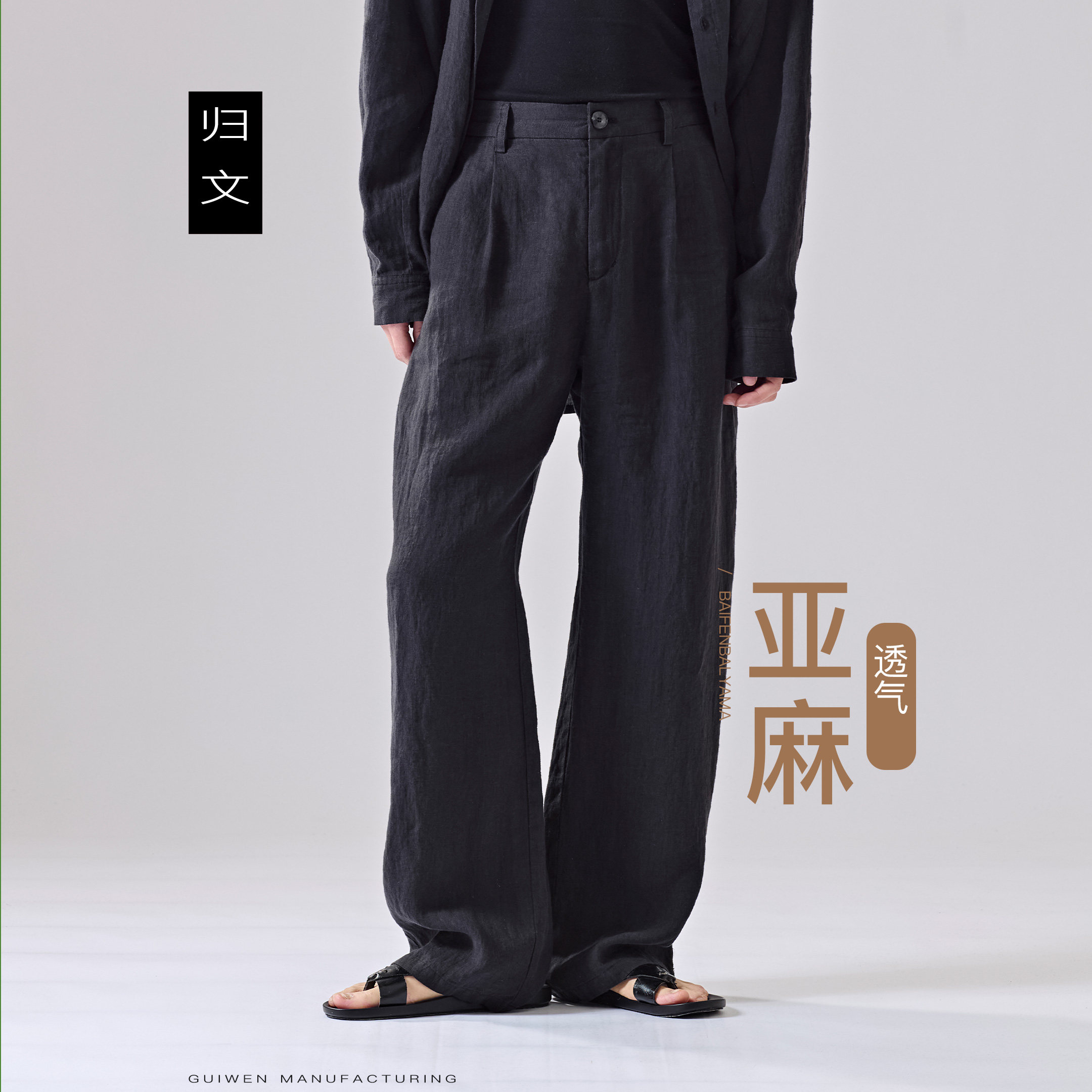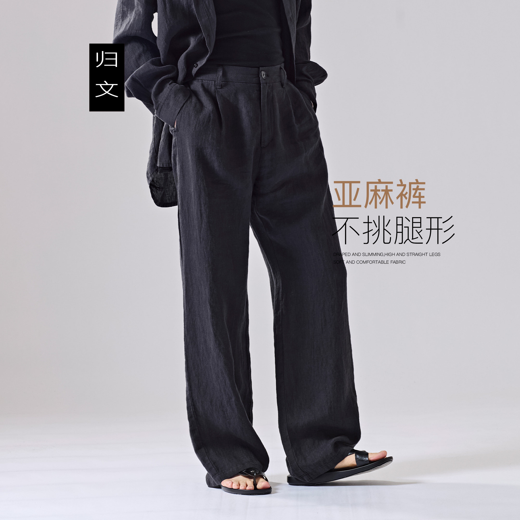 100%纯亚麻裤子裤男黑色宽松直筒裤老钱风通勤休闲裤透气时尚长裤
