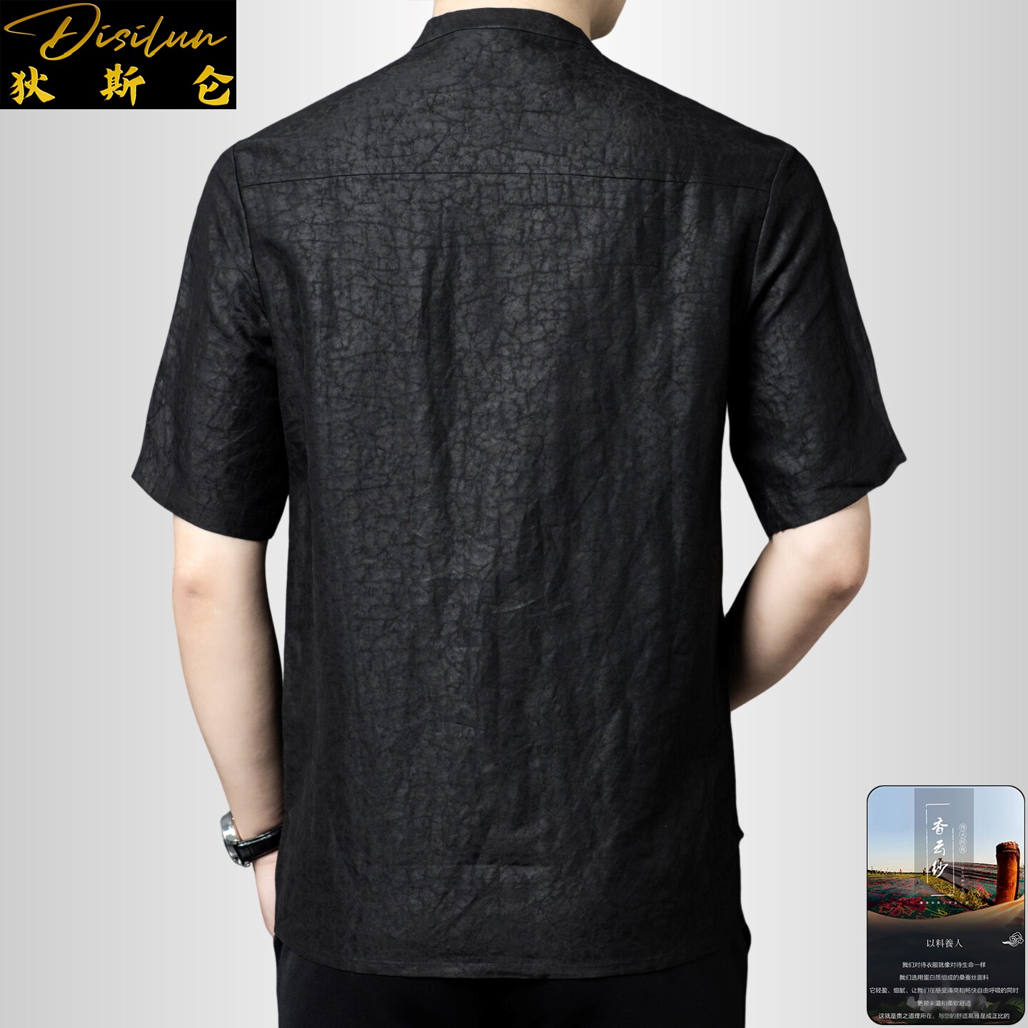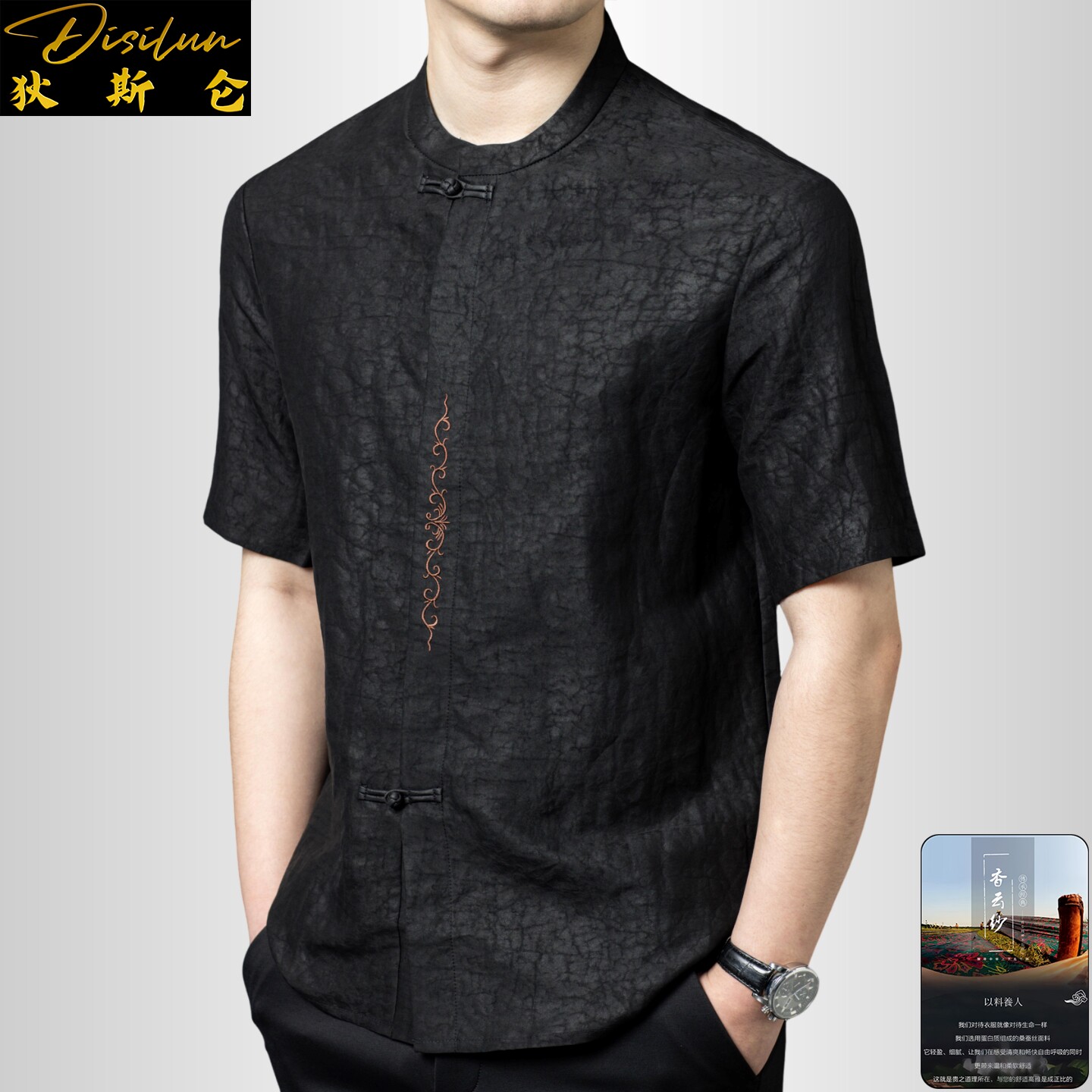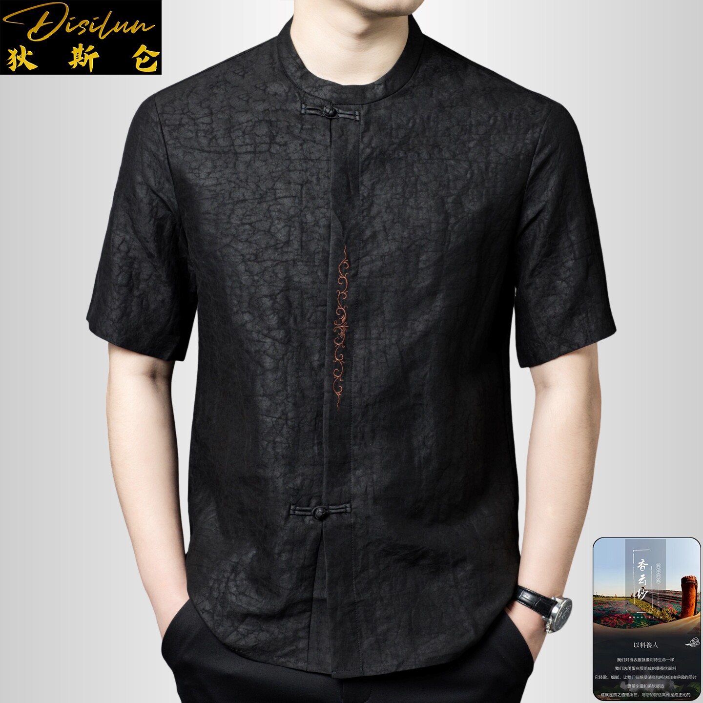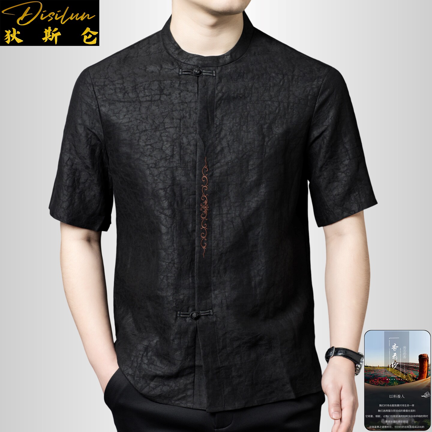 --------------------- 狄斯仑中国风香云纱龟裂纹立领短袖唐装男士夏季桑蚕丝新中式T恤 【原售价】1290元 【现售价】1161元 【推荐理由】