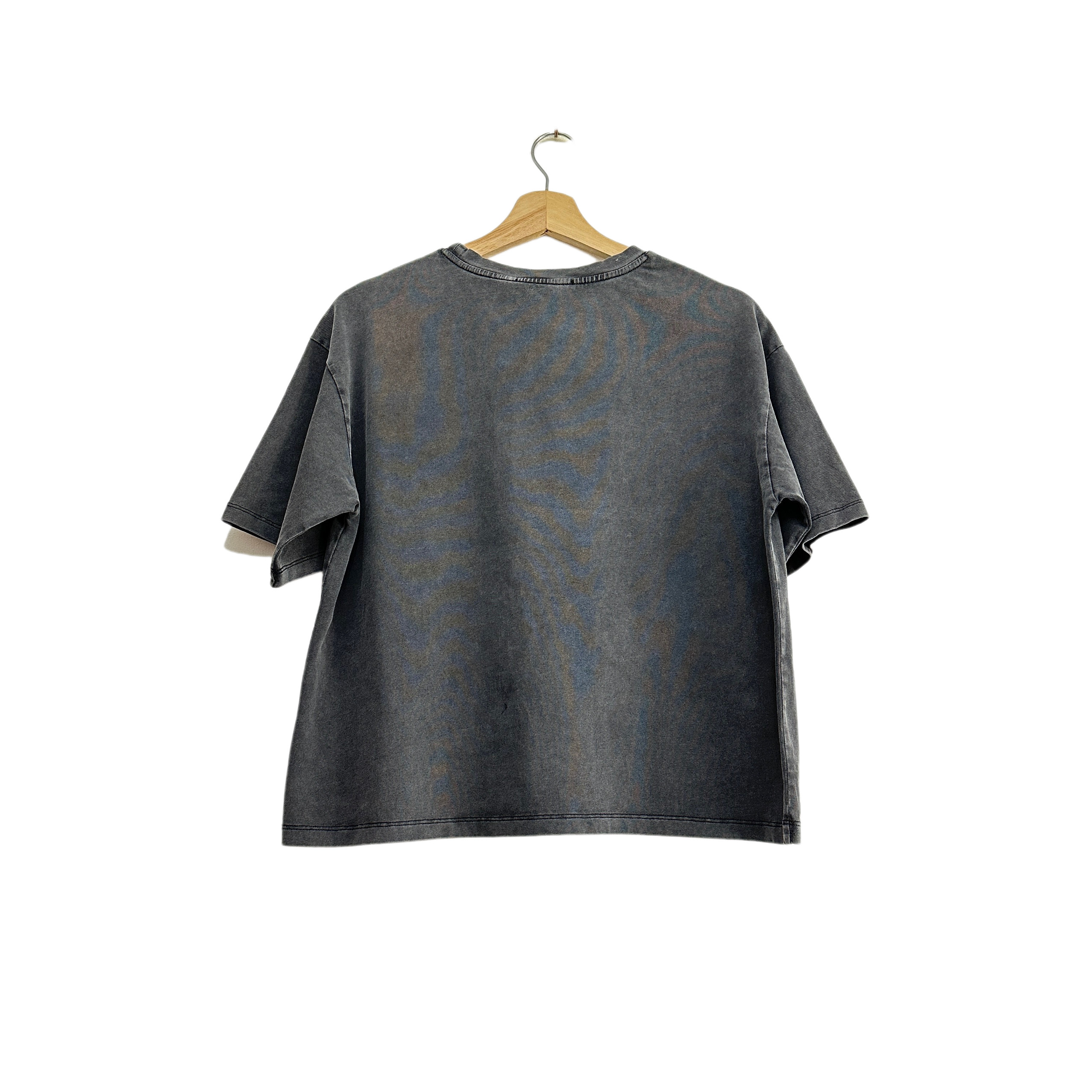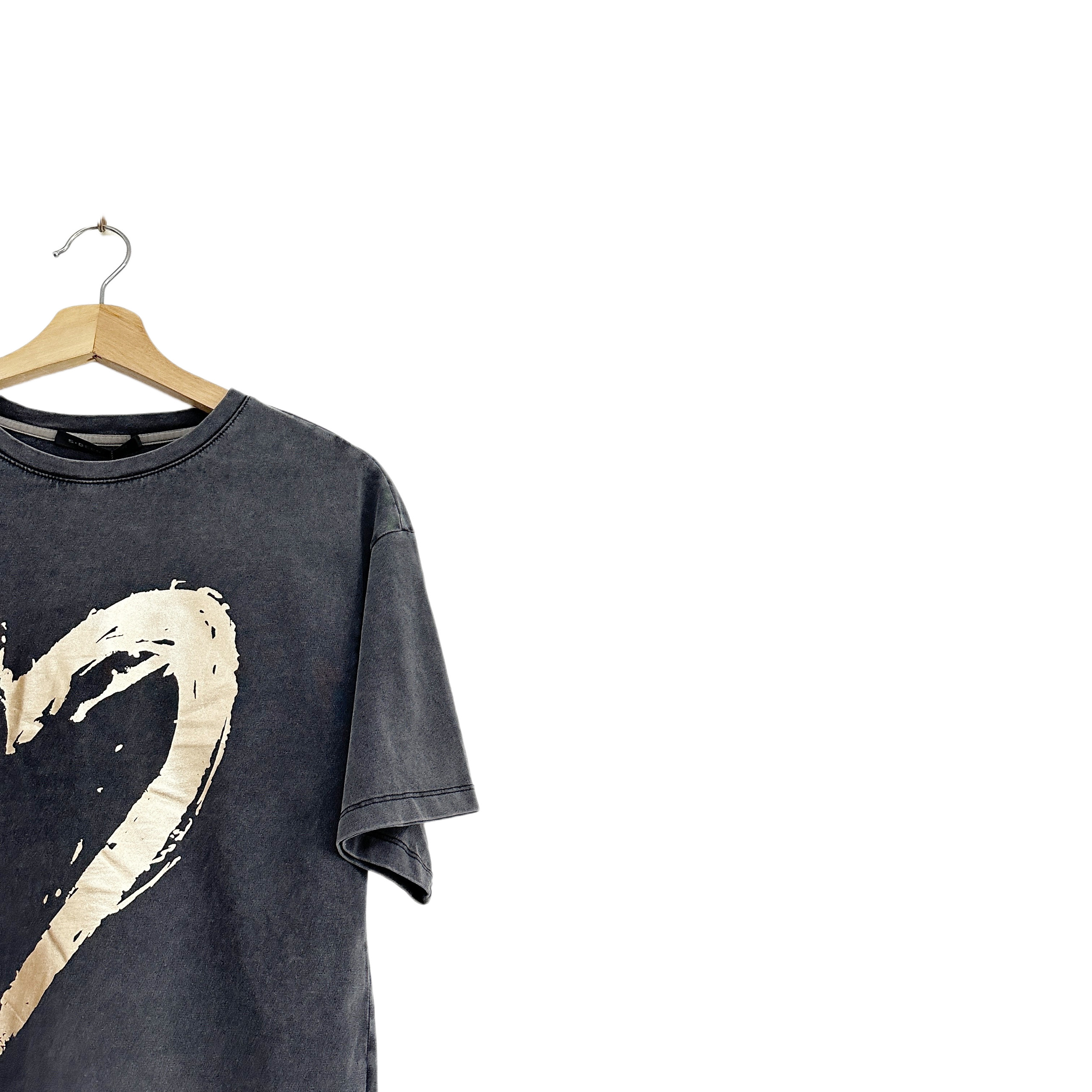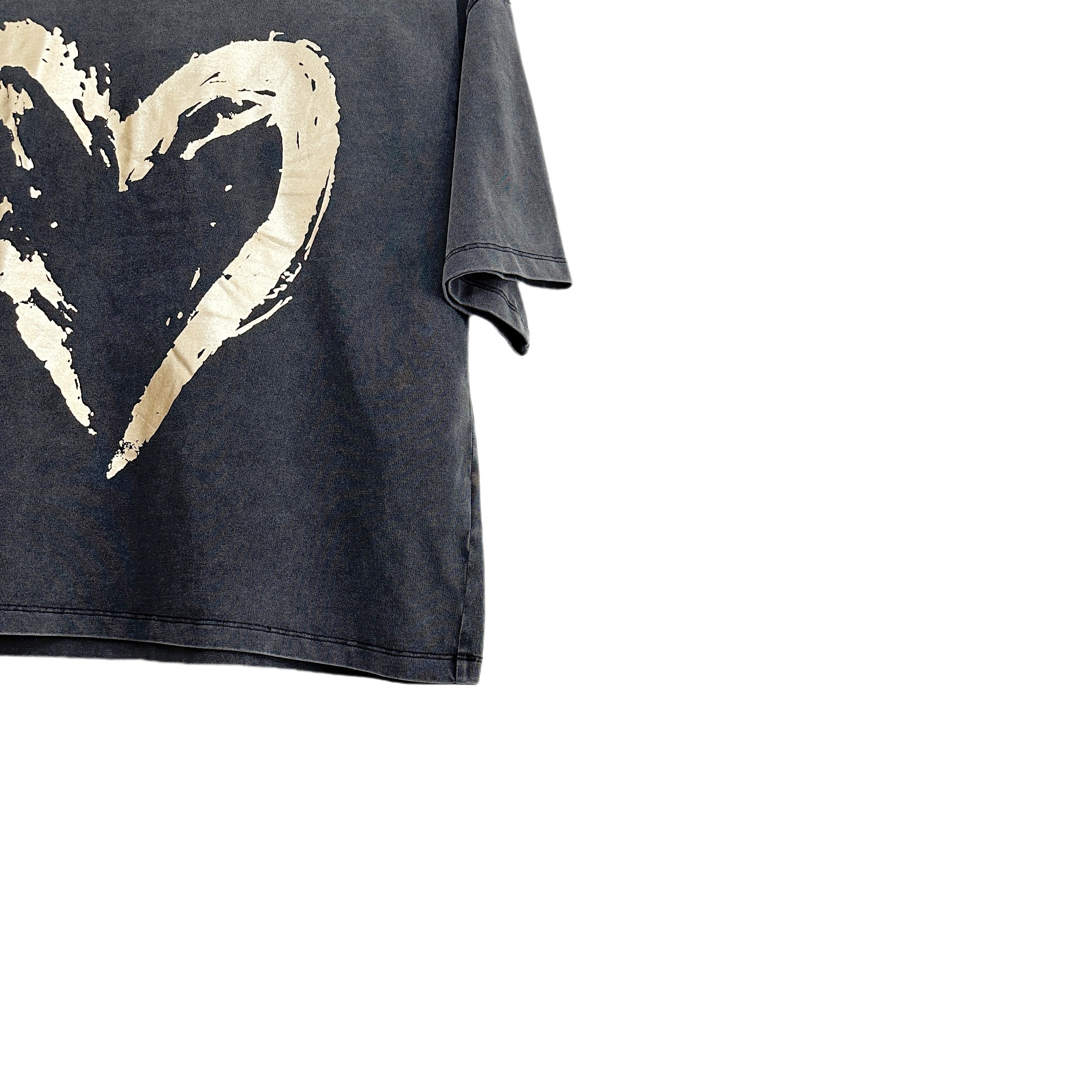 圣迪折扣女装 夏季复古做旧灰调心型烫金印花宽松短袖棉T恤