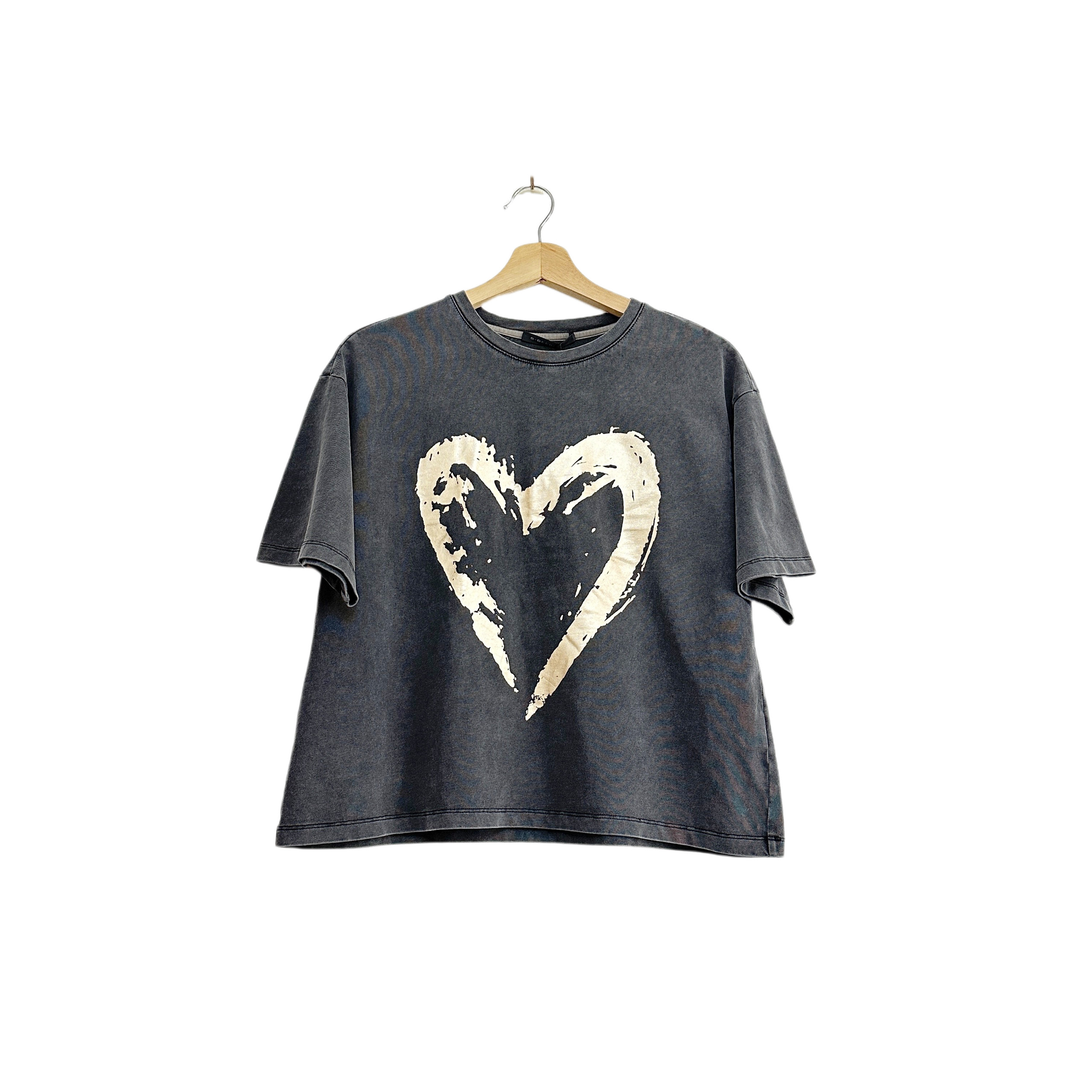 --------------------- 圣迪折扣女装 夏季复古做旧灰调心型烫金印花宽松短袖棉T恤 【原售价】135元 【现售价】118元 【推荐理由】