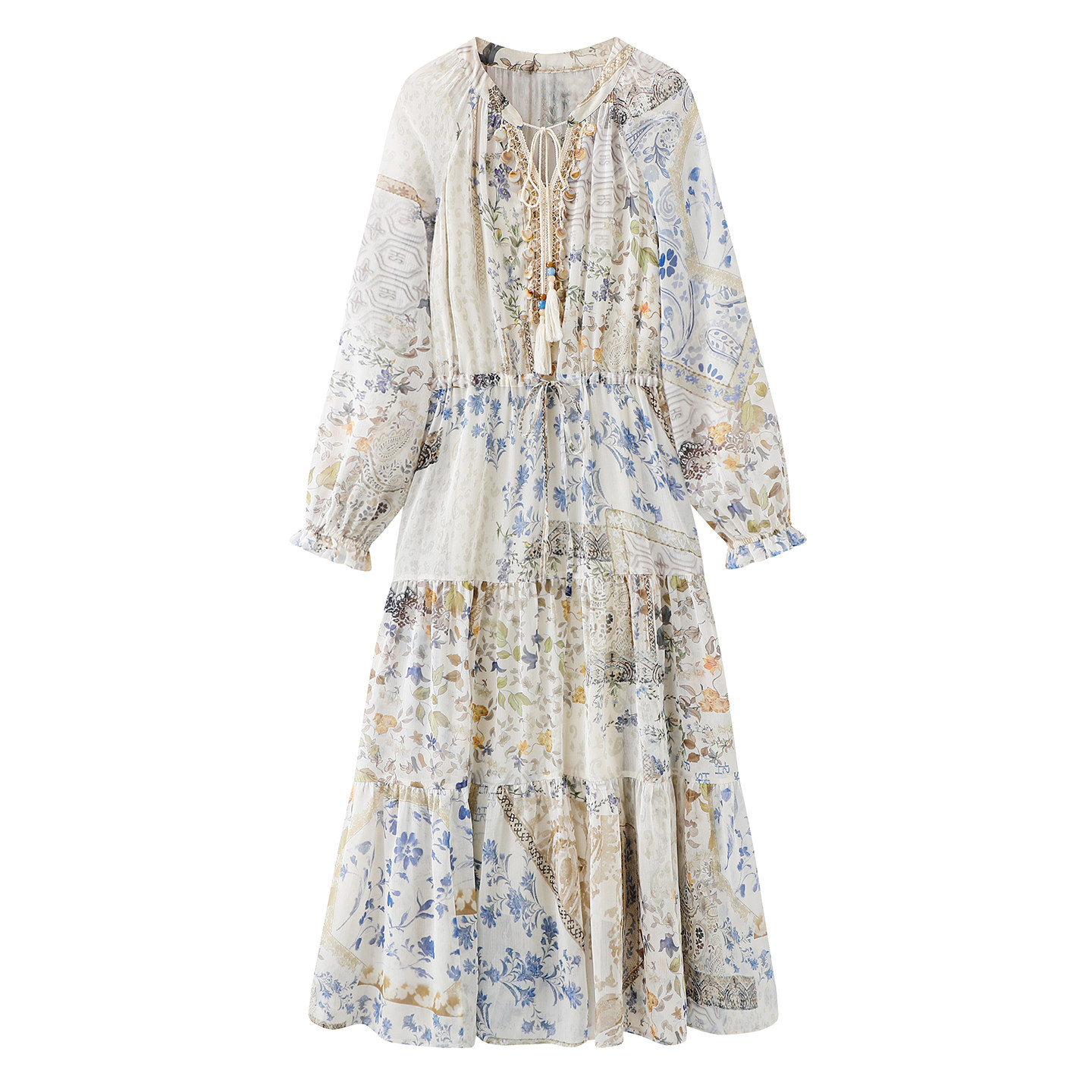 --------------------- 艾格海边度假连衣裙女2026春夏新款流苏系带串珠抽绳碎花雪纺裙 【原售价】198元 【现售价】112元 【推荐理由】