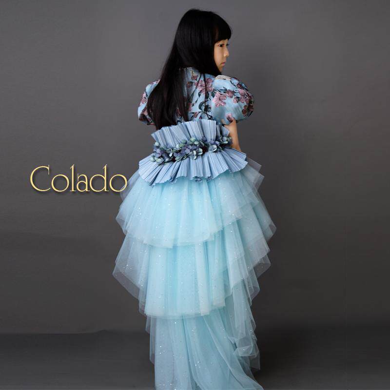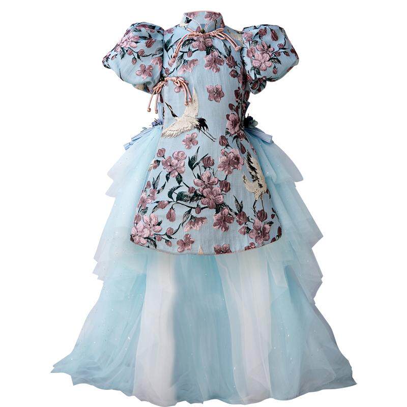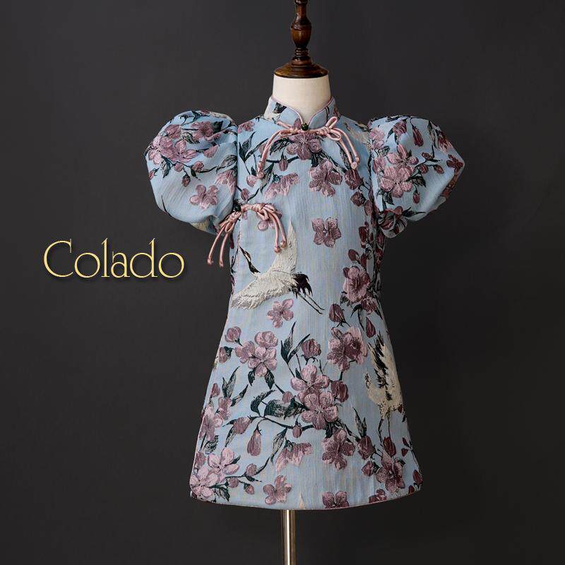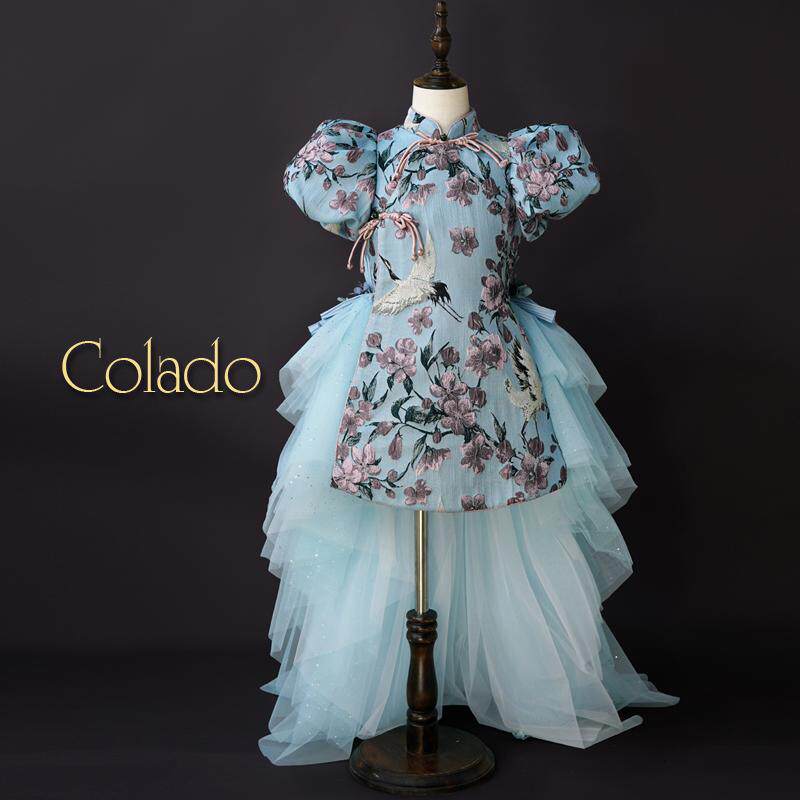 Colado扣诺国潮儿童礼服可脱卸拖尾模特走秀演出中国风长复古旗袍
