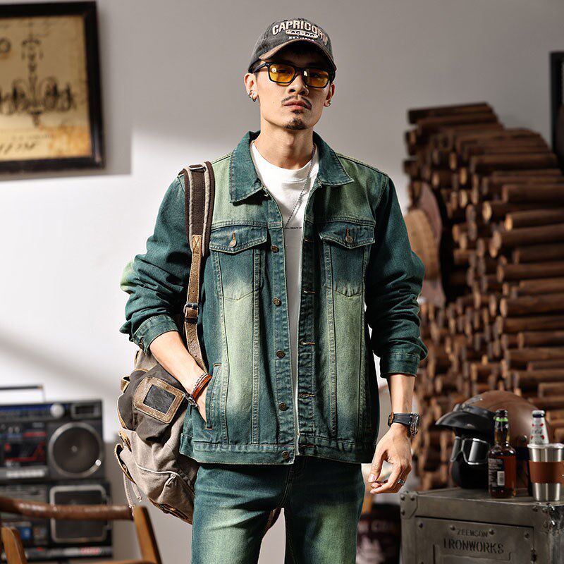 高端复古牛仔套装男款潮牌春秋季水洗怀旧工装夹克修身小脚长裤子