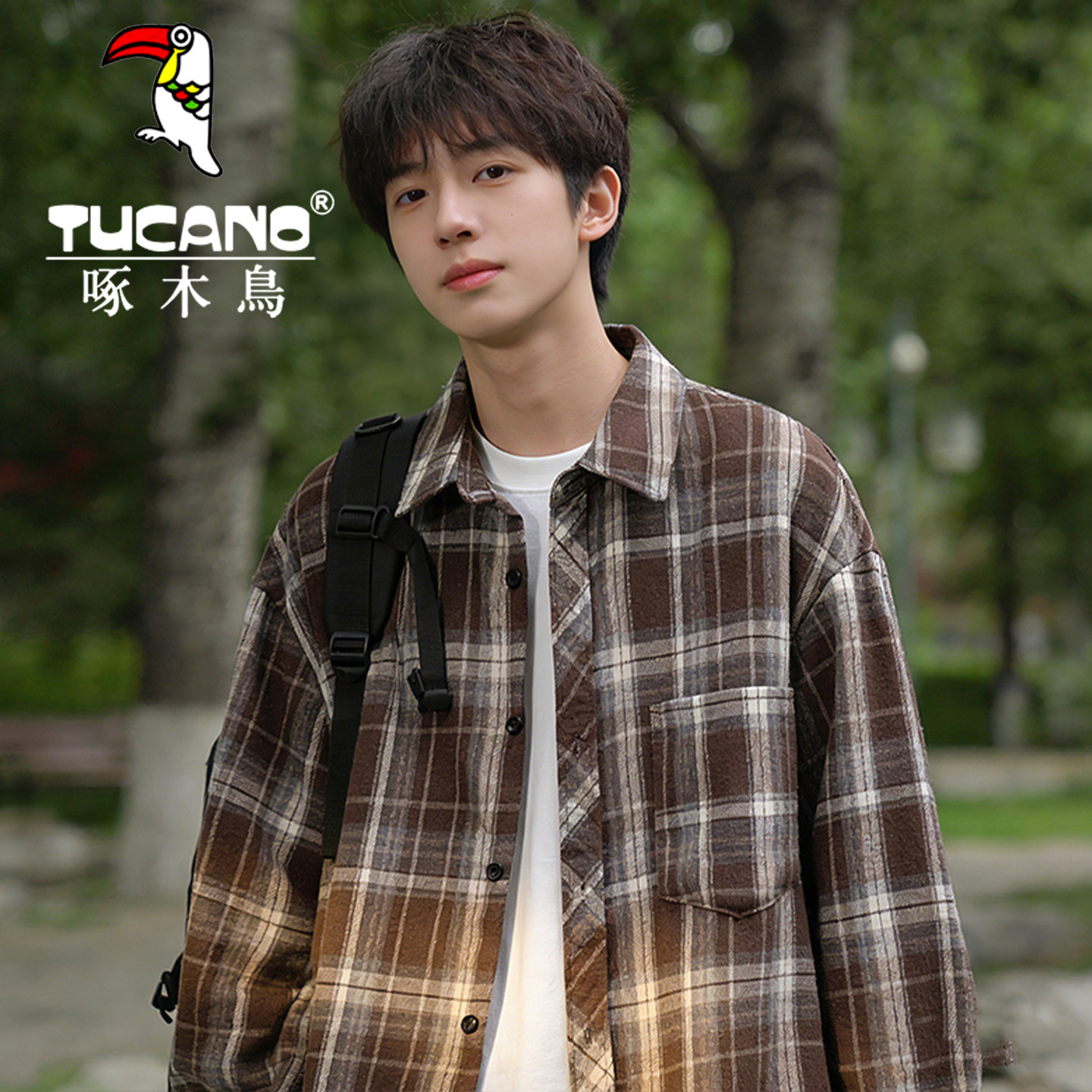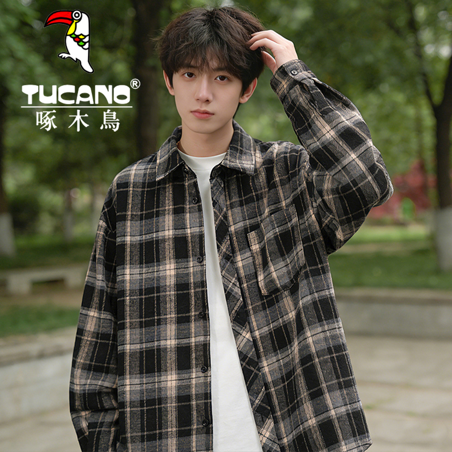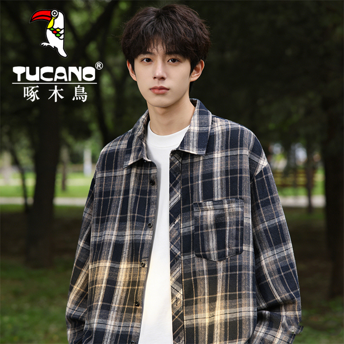 啄木鸟美式复古格子翻领衬衫男年春秋季宽松百搭休闲长袖衬衣外套
