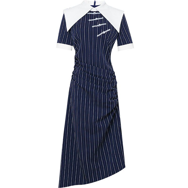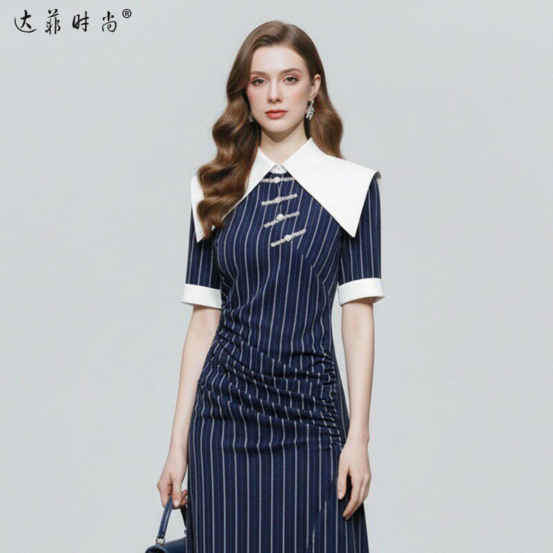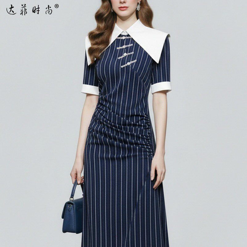 2026夏季新款国潮气质复古大翻领拼接修身中长款鱼尾连衣裙女装L