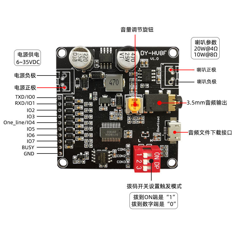 12V/24V语音播放模块一对一触发串口控制播放10W/20W语音模块HV8F