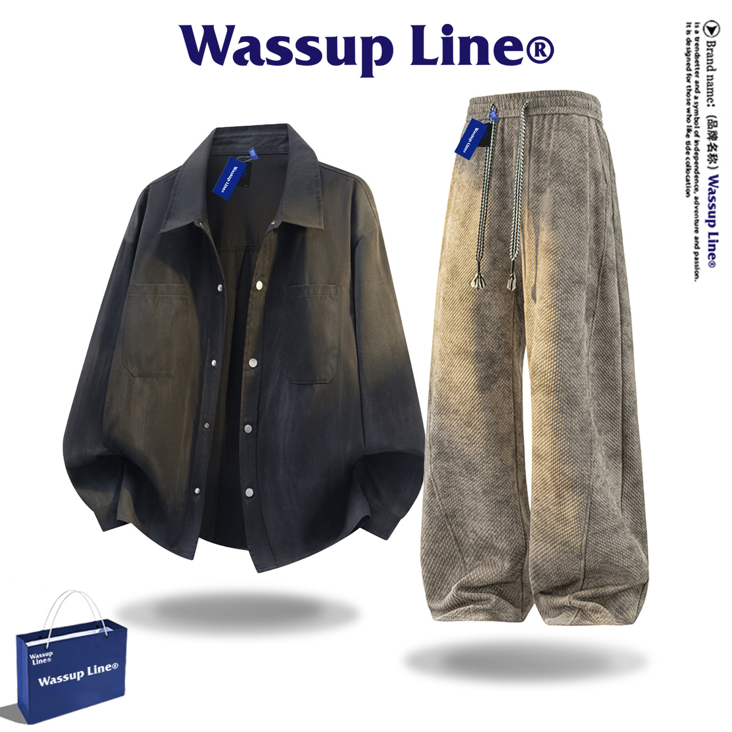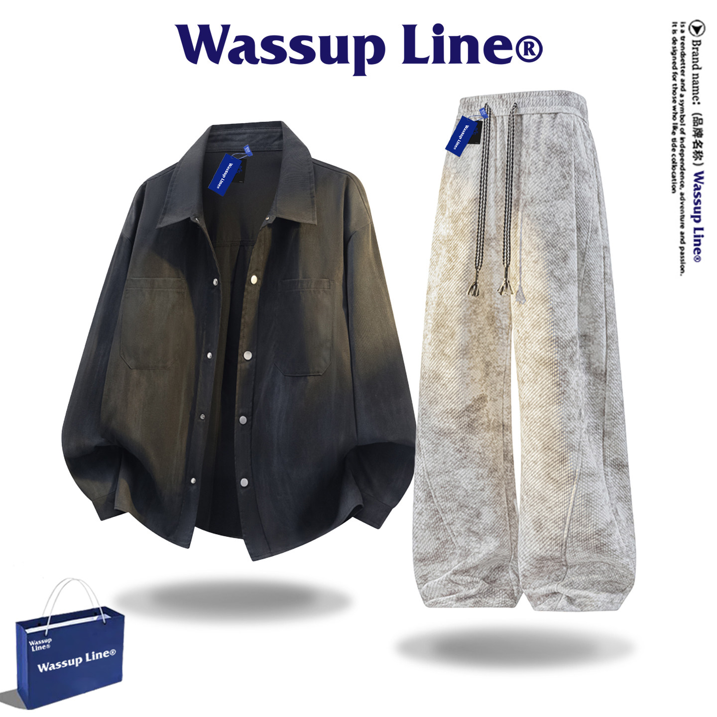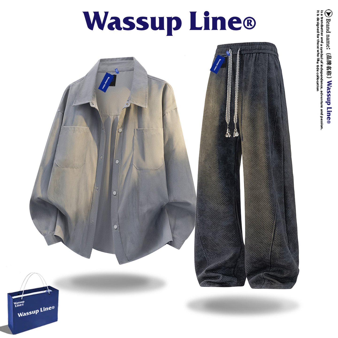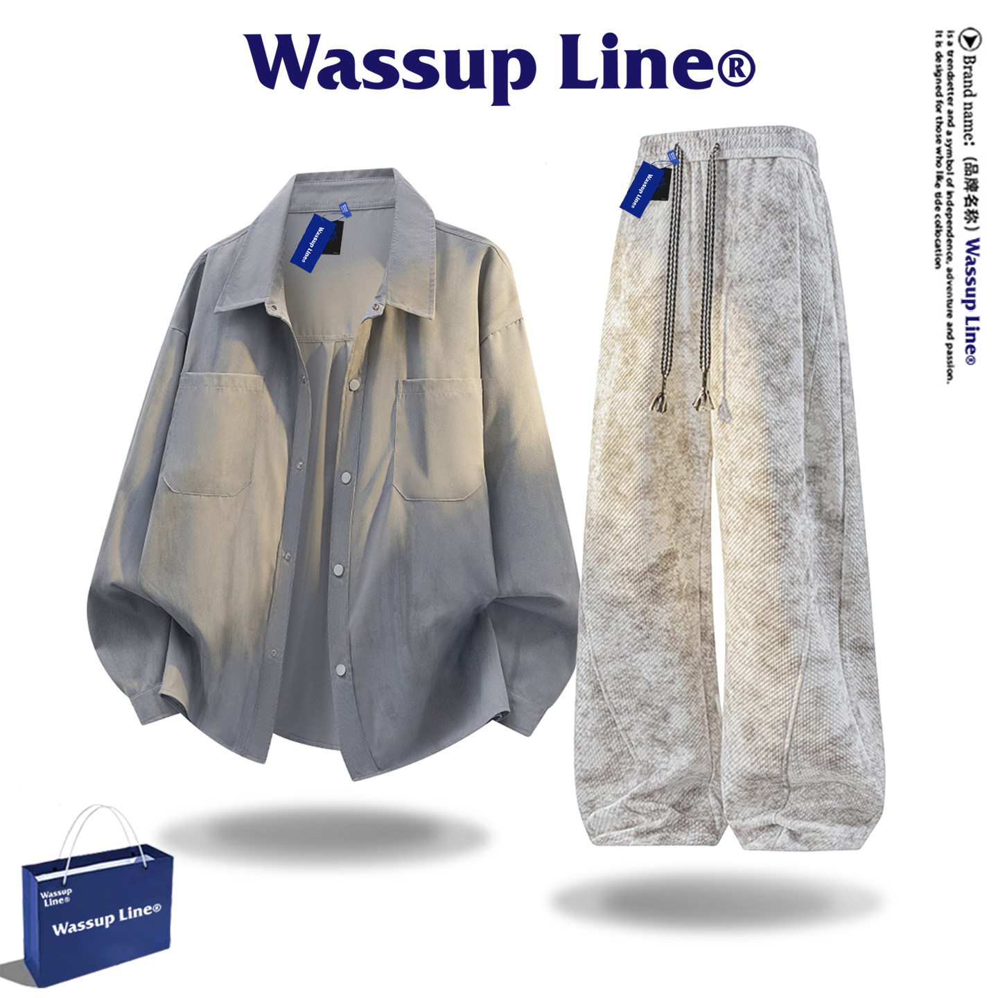 WASSUP Line潮牌扎染衬衫套装男春季美式复古宽松长袖休闲两件套