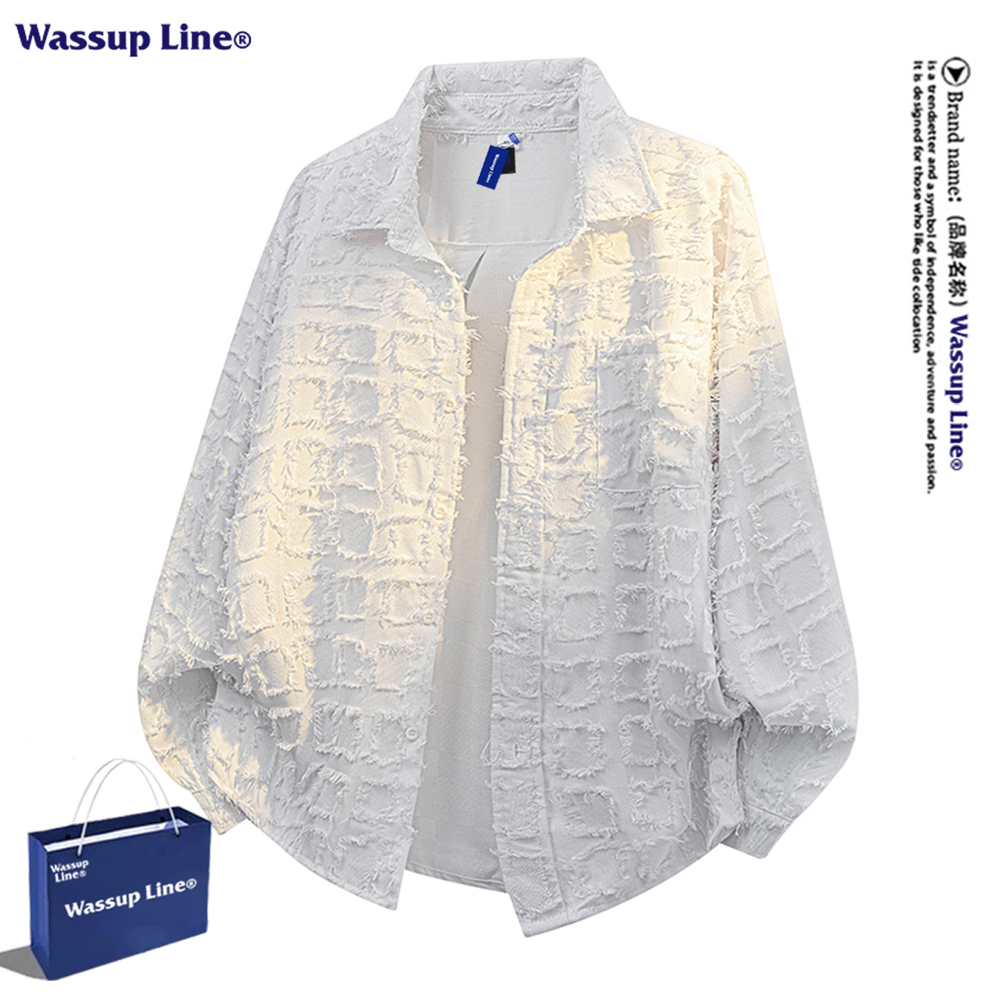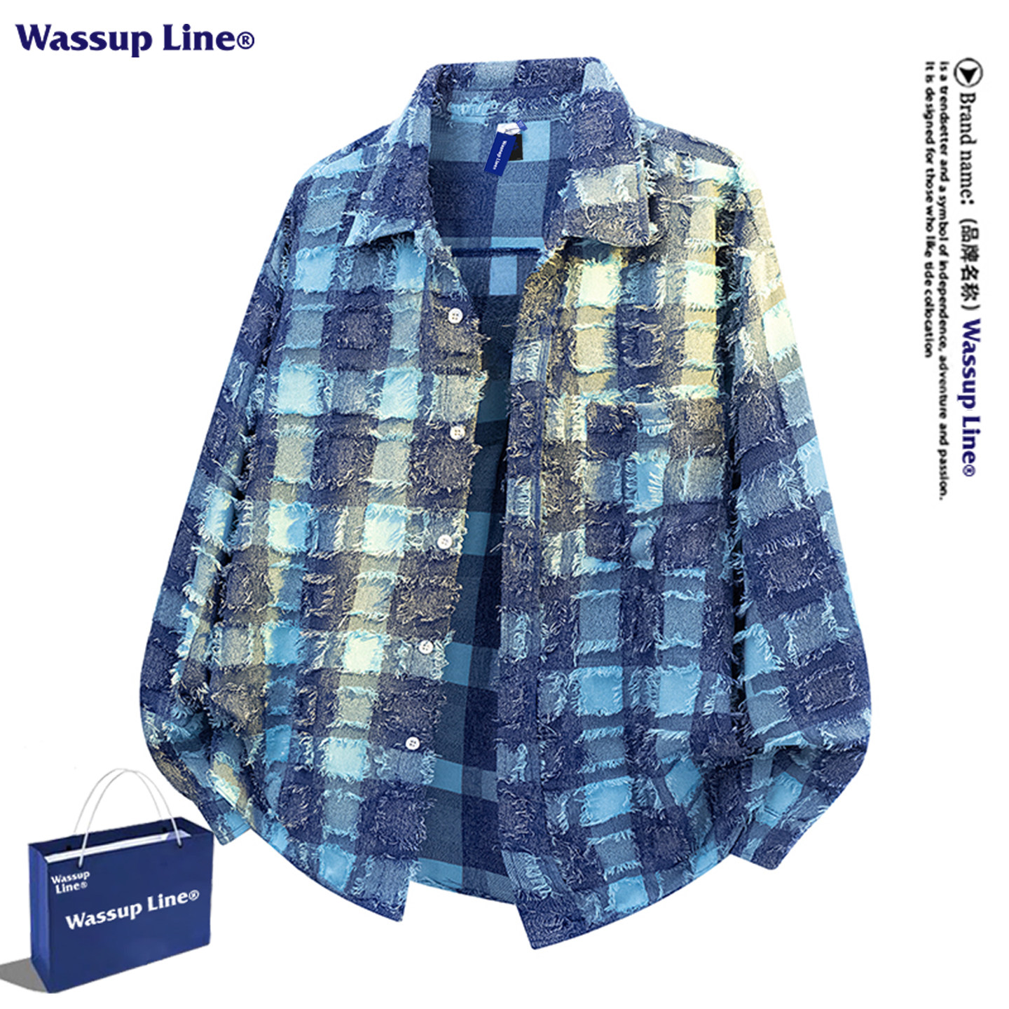 WASSUP Line潮牌美式格子长袖衬衫男春秋季毛边流苏复古宽松衬衣