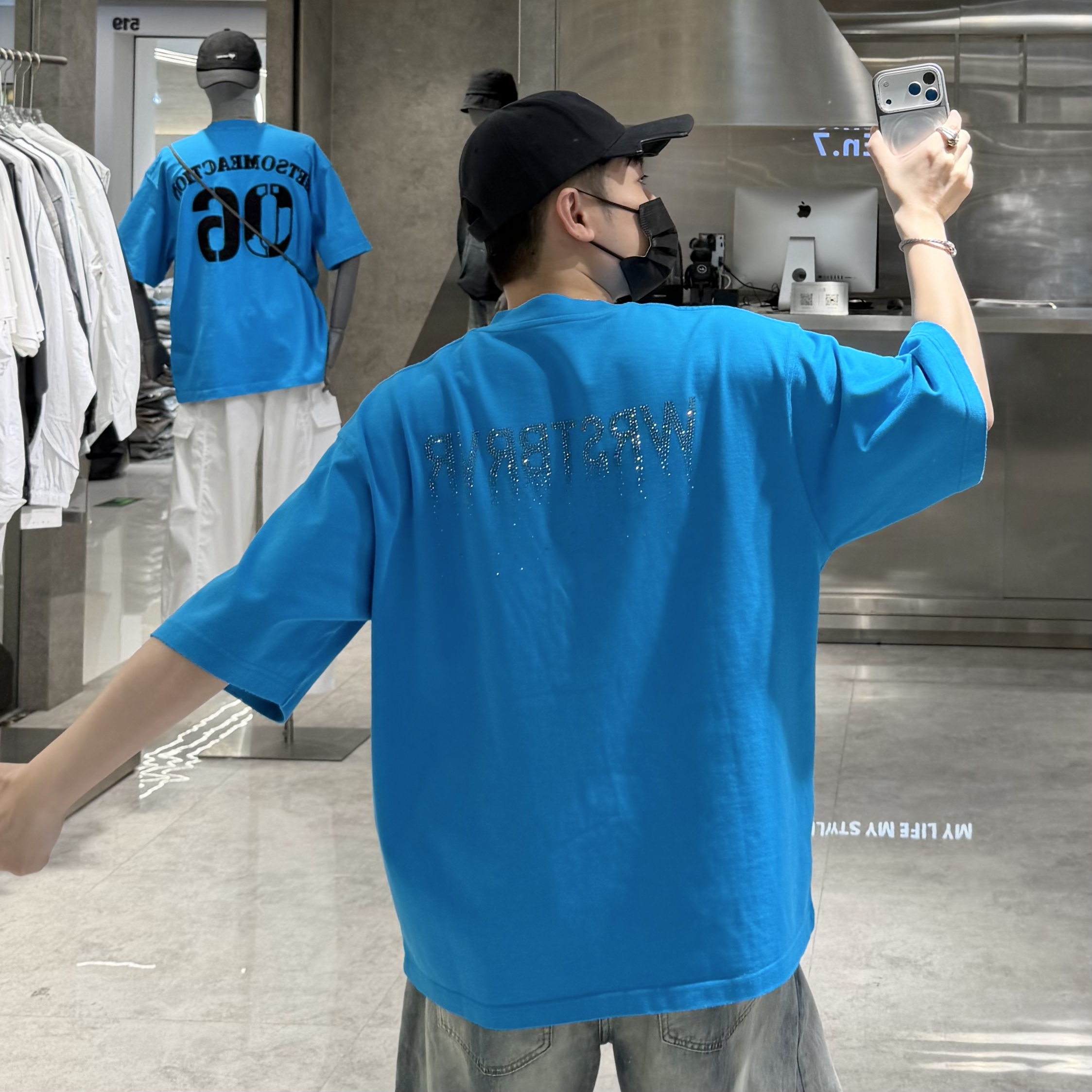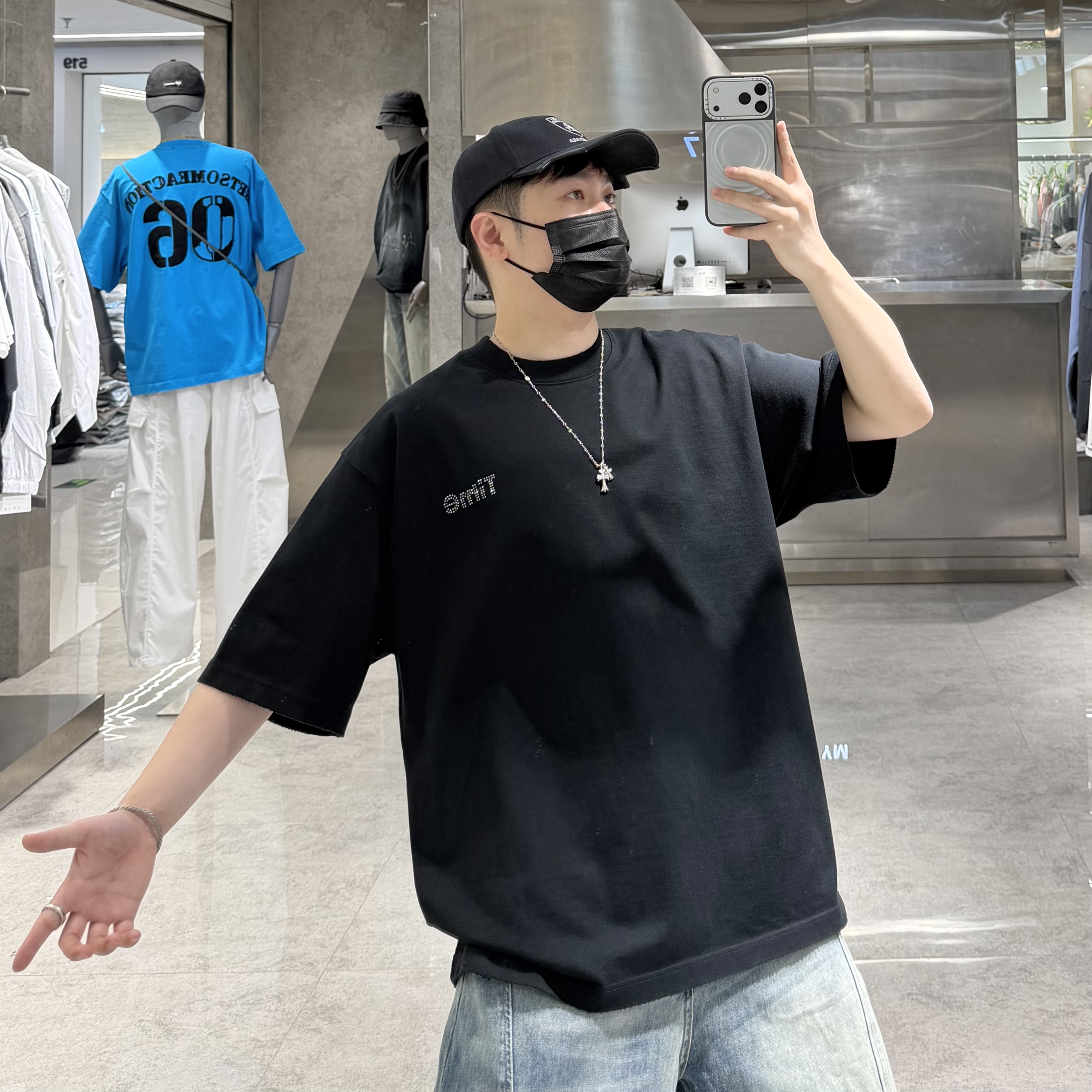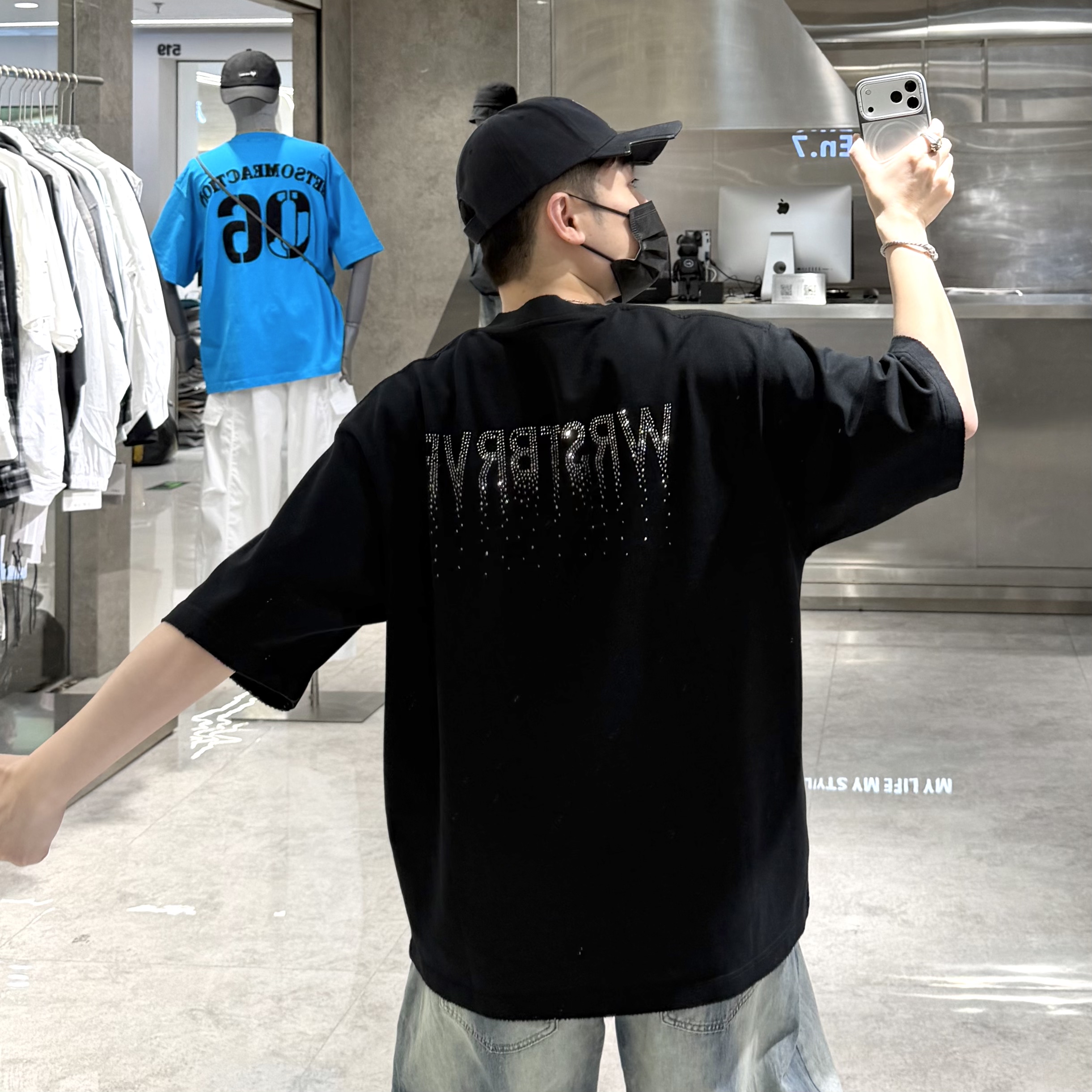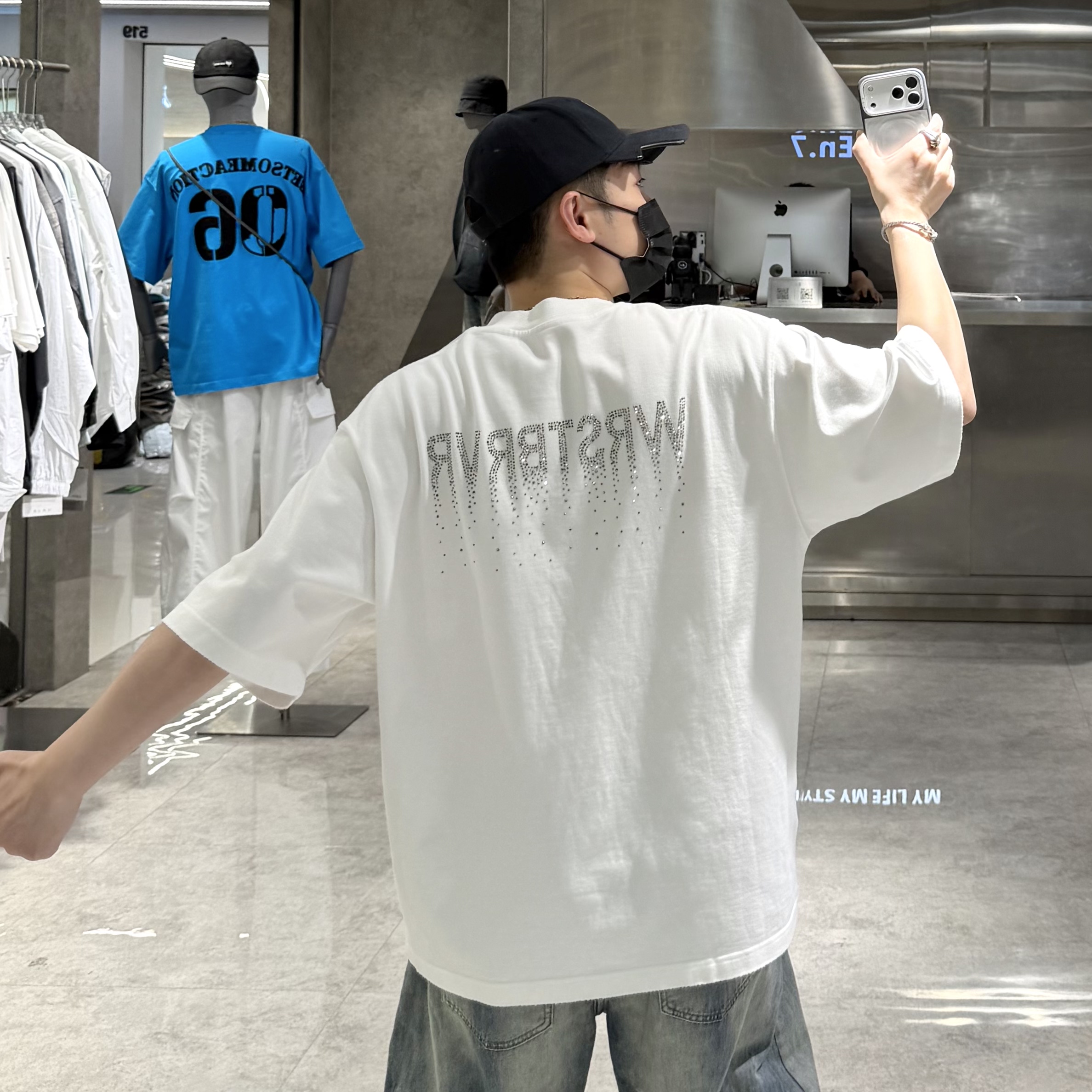 --------------------- 潮牌夏季重磅短袖T恤男ins国潮字母烫钻宽松青年帅气落肩情侣半袖 【原售价】268元 【现售价】231元 【推荐理由】