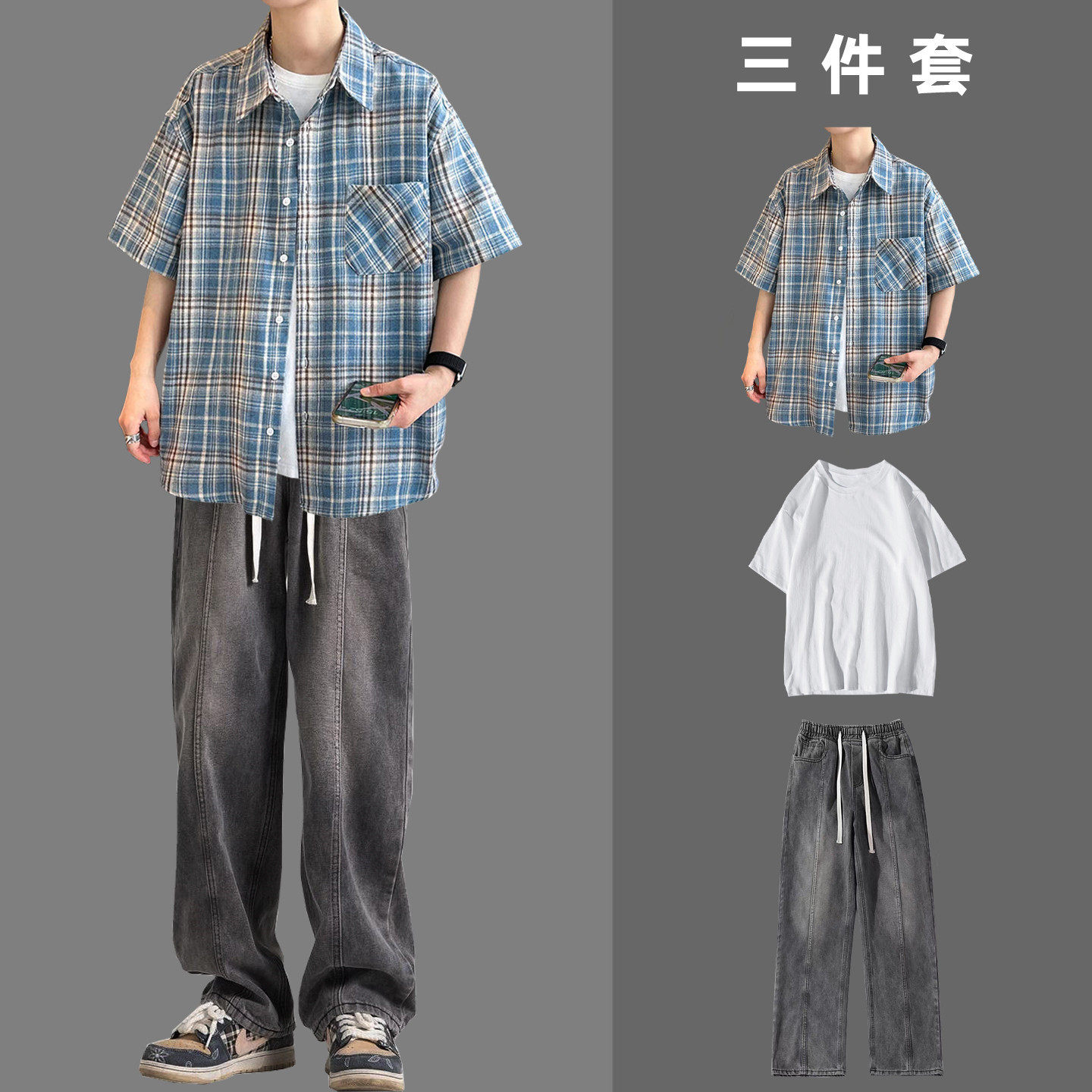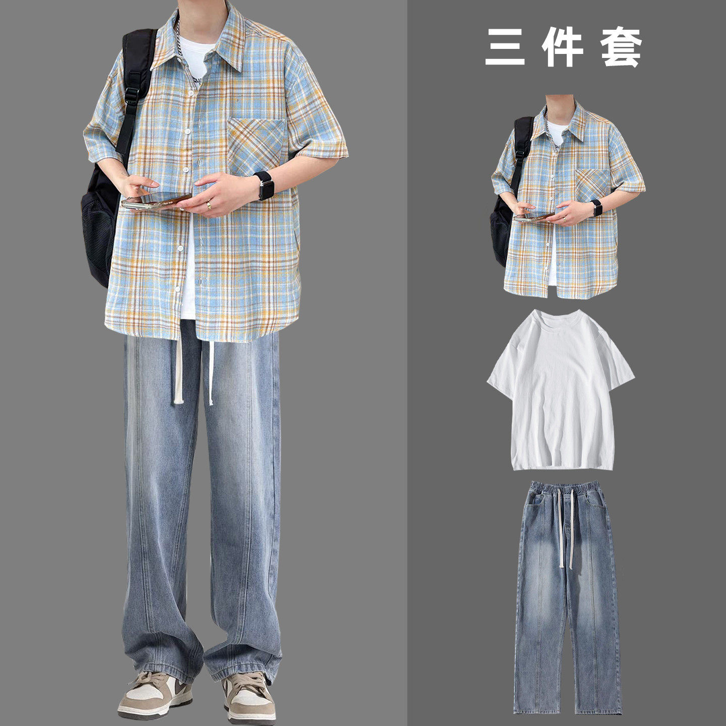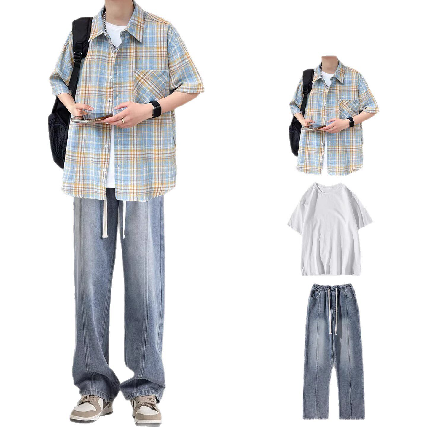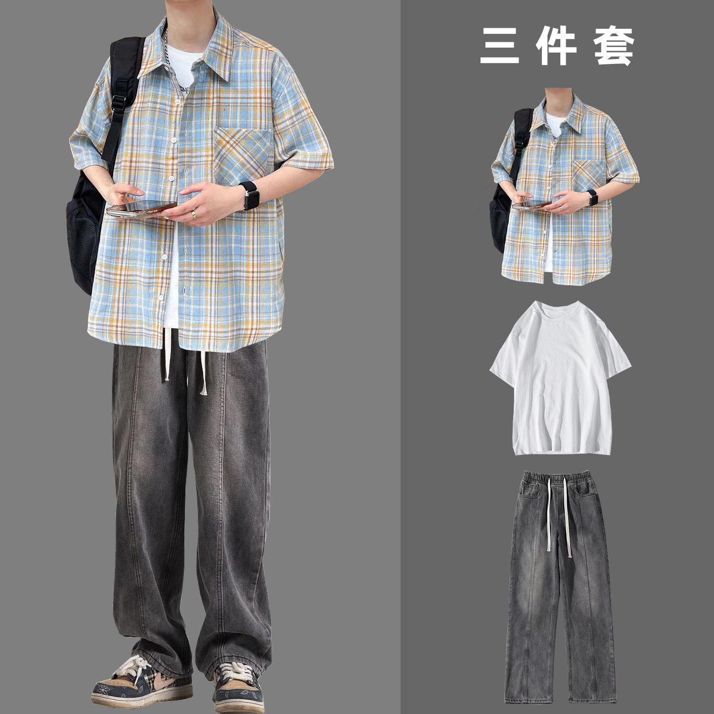 --------------------- BENTIDEA 夏季港风穿搭撞色黄蓝格纹短袖衬衫套装男生衬衣搭配 【原售价】180元 【现售价】99元 【推荐理由】