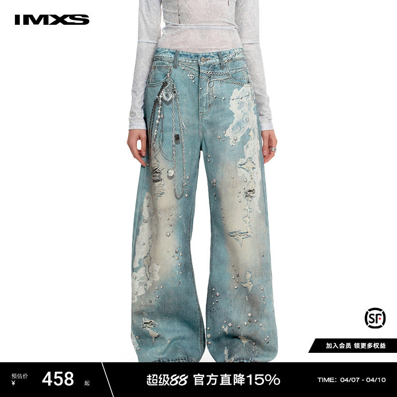 --------------------- IMXS【明星同款】蕾丝印花牛仔裤脏脏复古微喇阔腿休闲长裤2025年 【原售价】539元 【现售价】458元 【推荐理由】