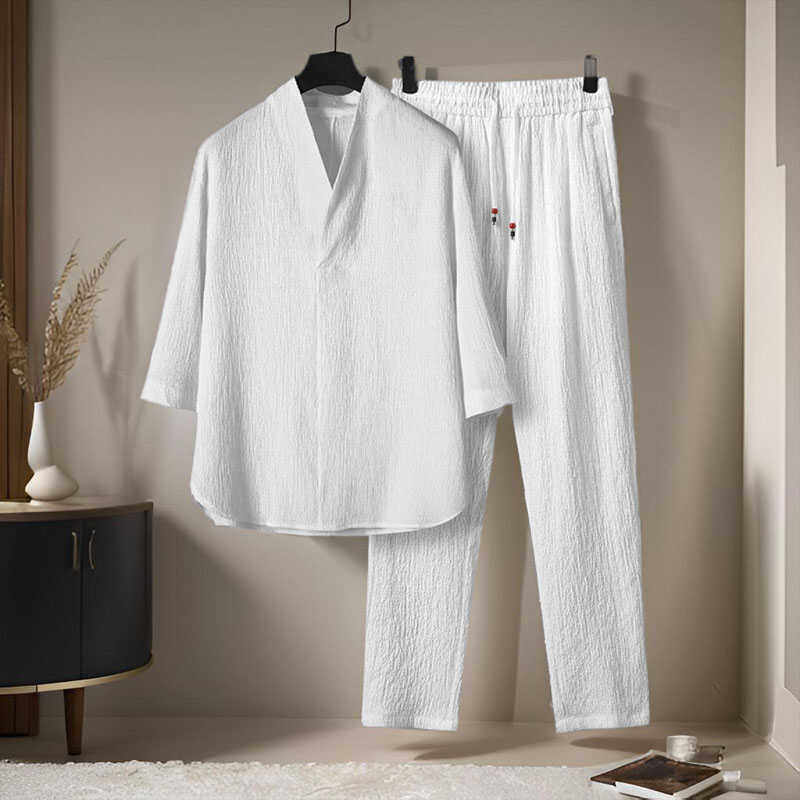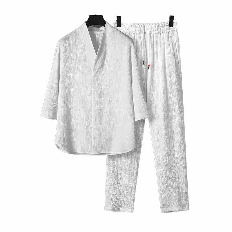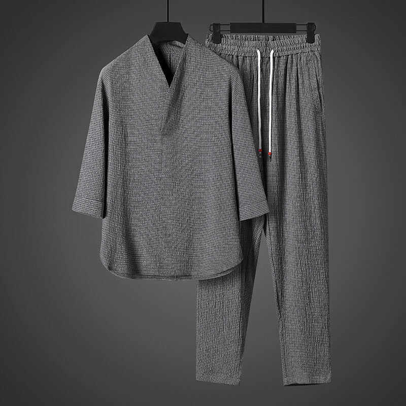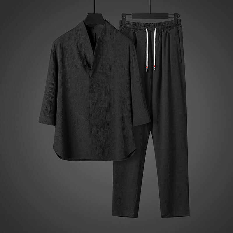 潮牌亚麻套装男士夏季短袖休闲宽松冰丝中国风运动大码棉麻两件套