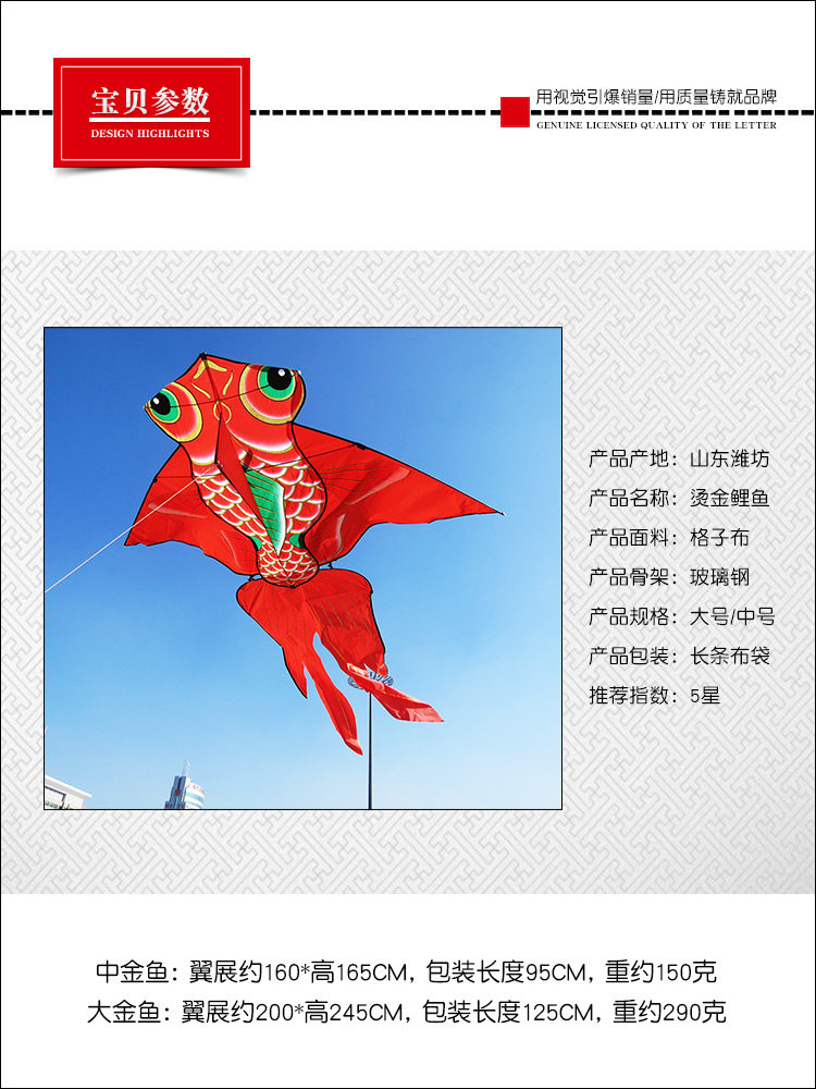 --------------------- 新款潍坊烫金大金鱼鲤鱼儿童卡通大型成人微风易飞国潮中国风风筝 【原售价】19.9元 【现售价】19.9元 【推荐理由】