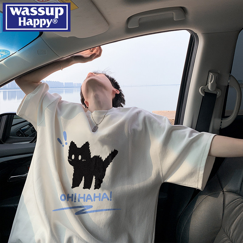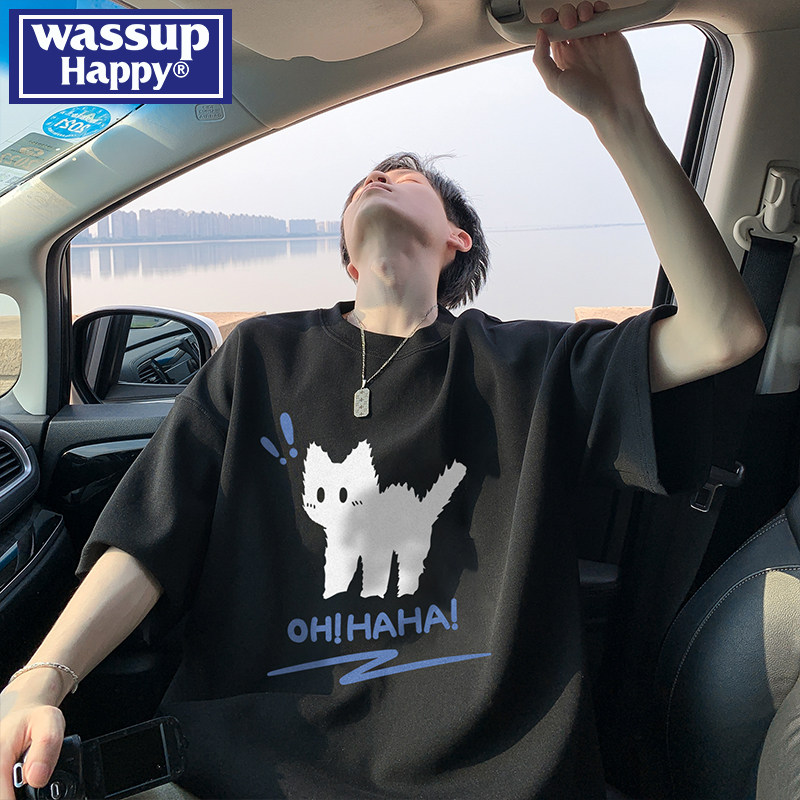 wassup happy高街潮牌圆领短袖t恤男夏季情侣潮流百搭休闲五分袖