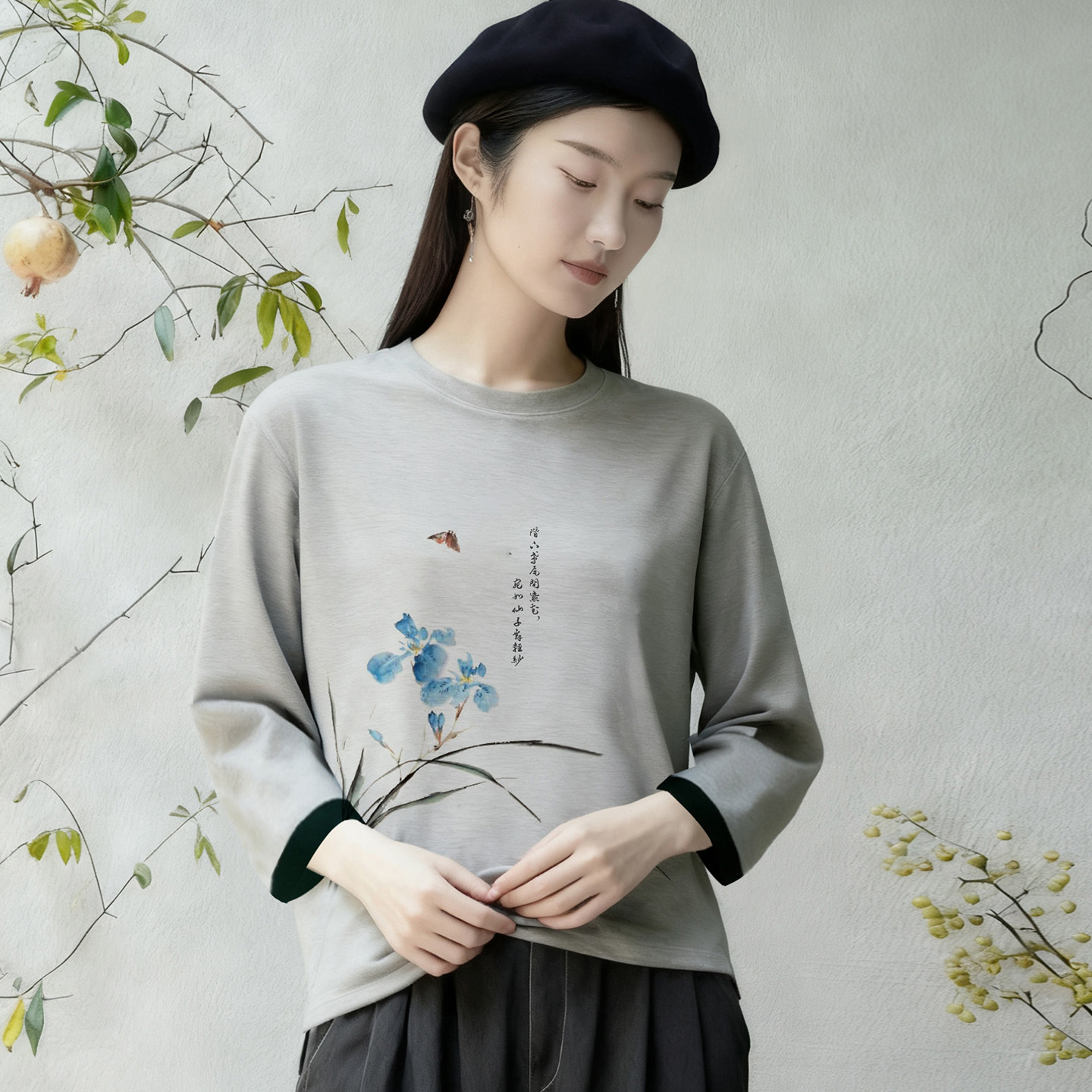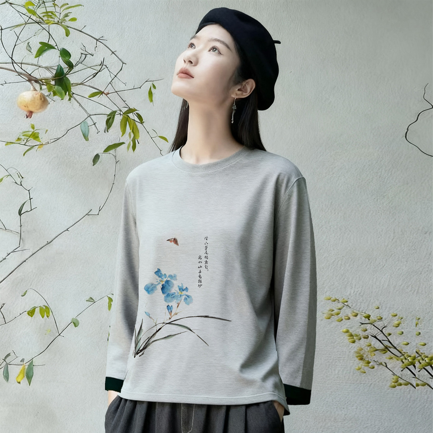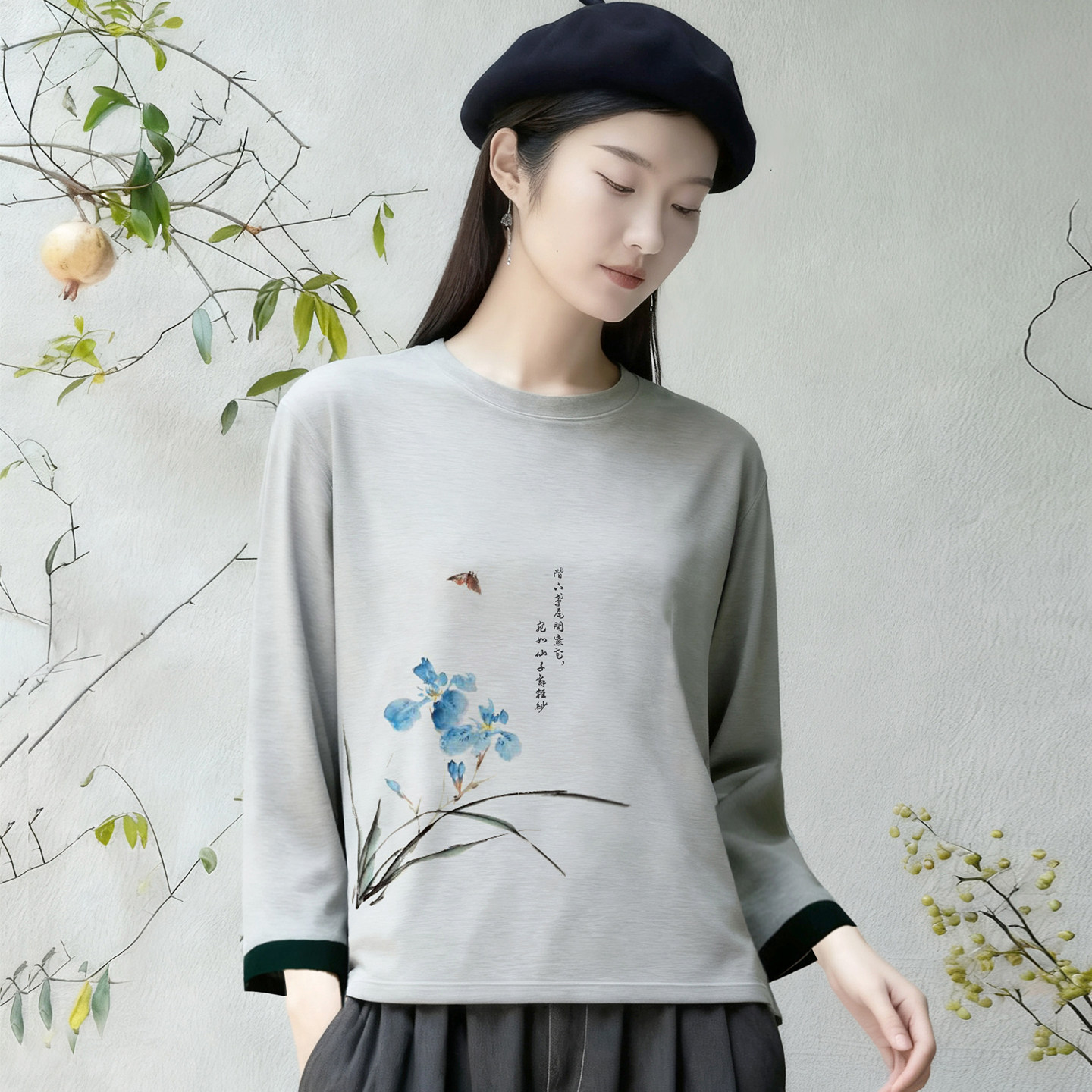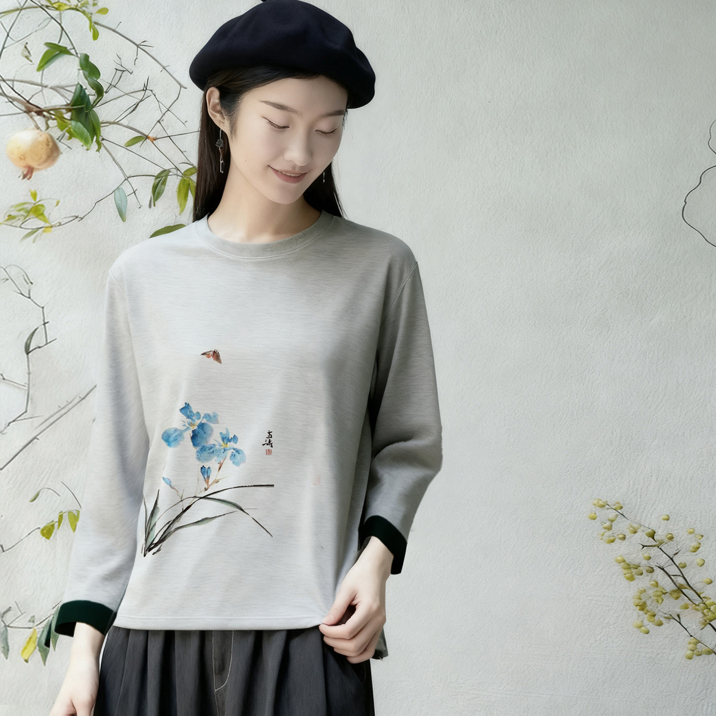 淘宝水墨沐暖春秋100%棉国风手绘鸢尾花长袖打底衫宽松大码新中式上衣
