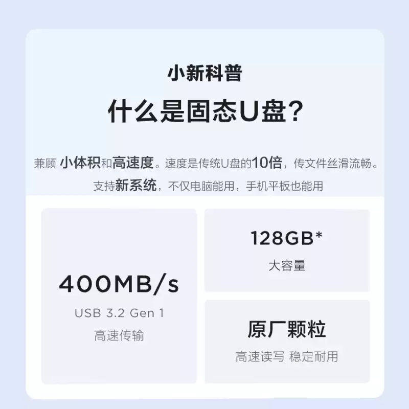 --------------------- 联想小新滑板限定款U盘 USB3.2固态U盘128G金属双接口手机电脑U盘 【原售价】139元 【现售价】129元 【推荐理由】