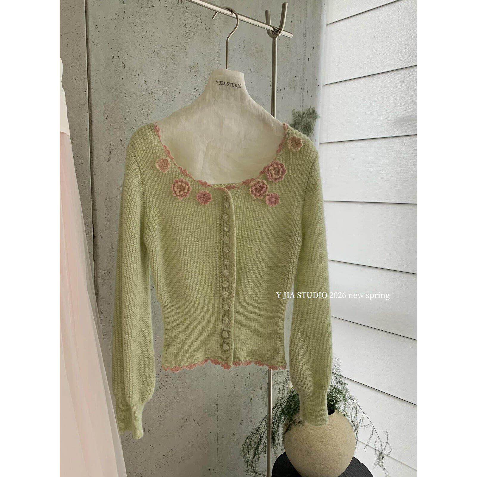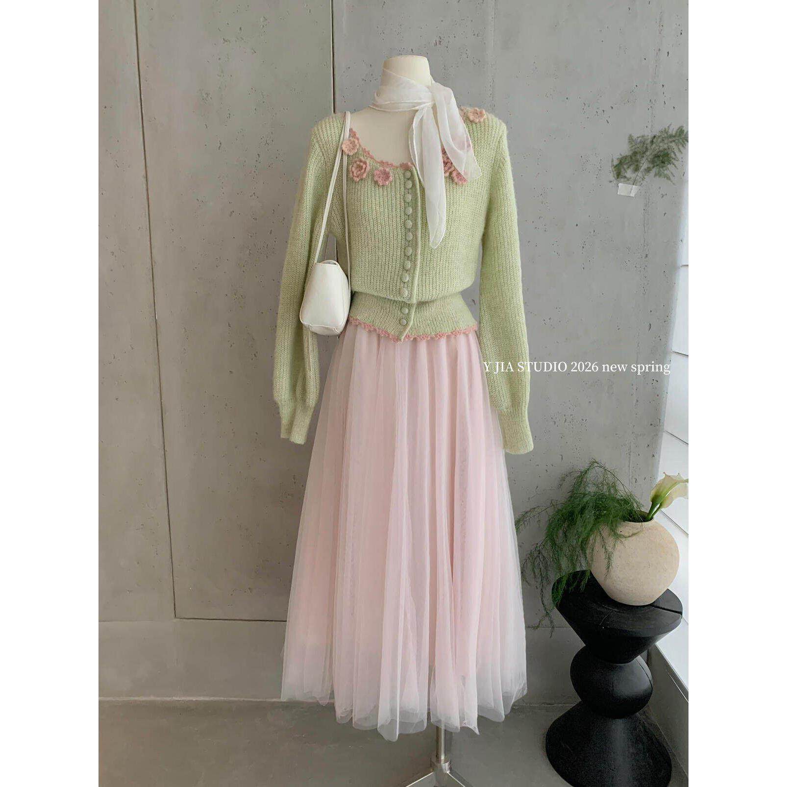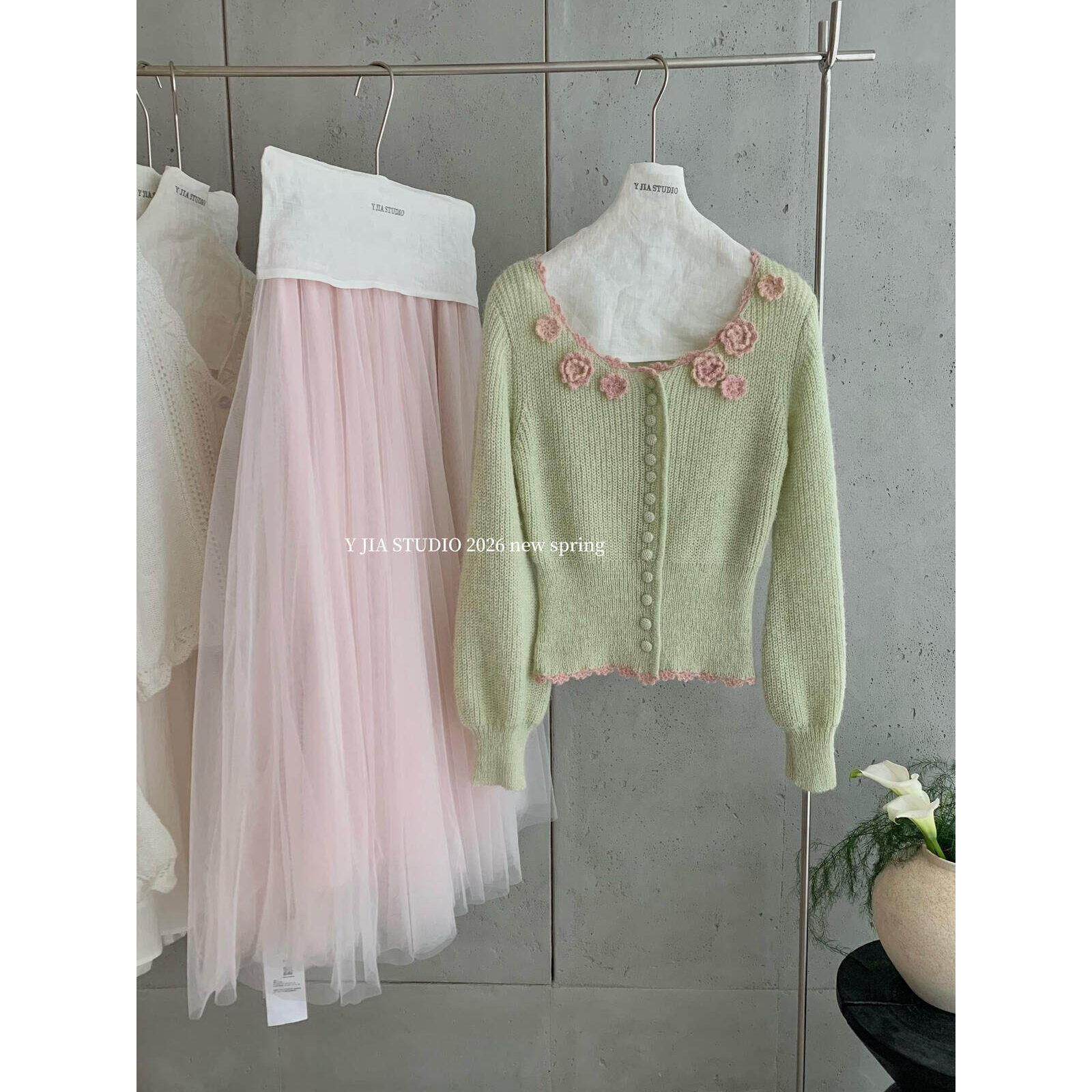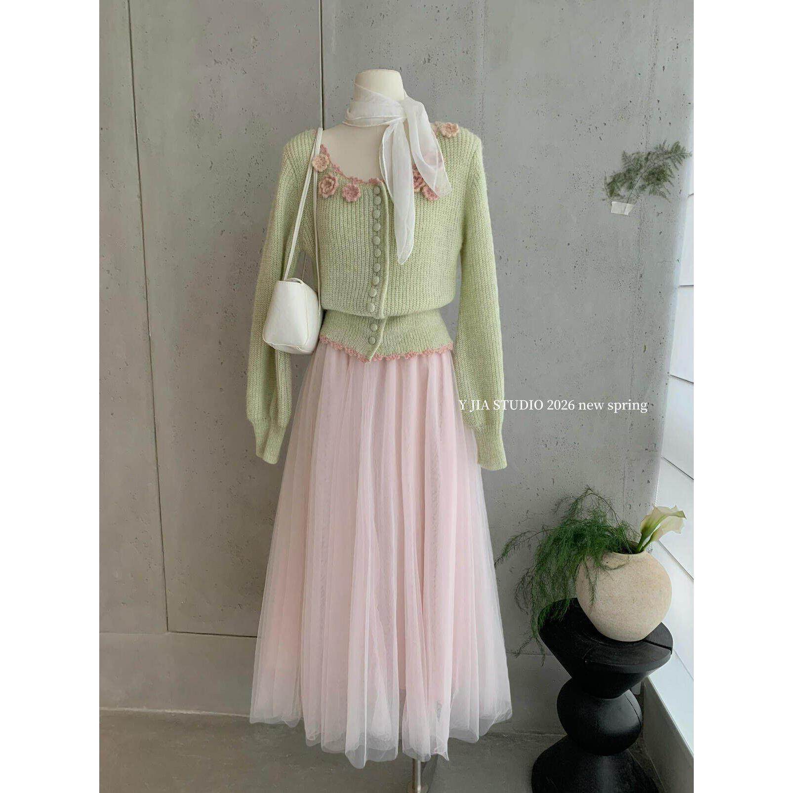 Y.JIA 伊嘉 温柔风立体花朵钩花针织开衫+粉色网纱蓬蓬半身裙套装