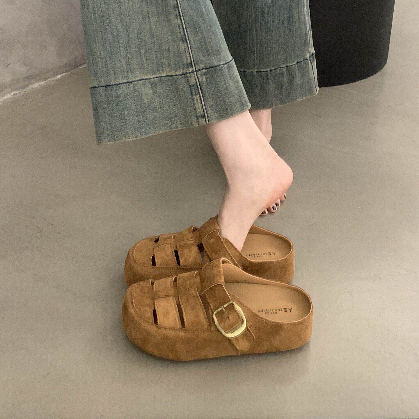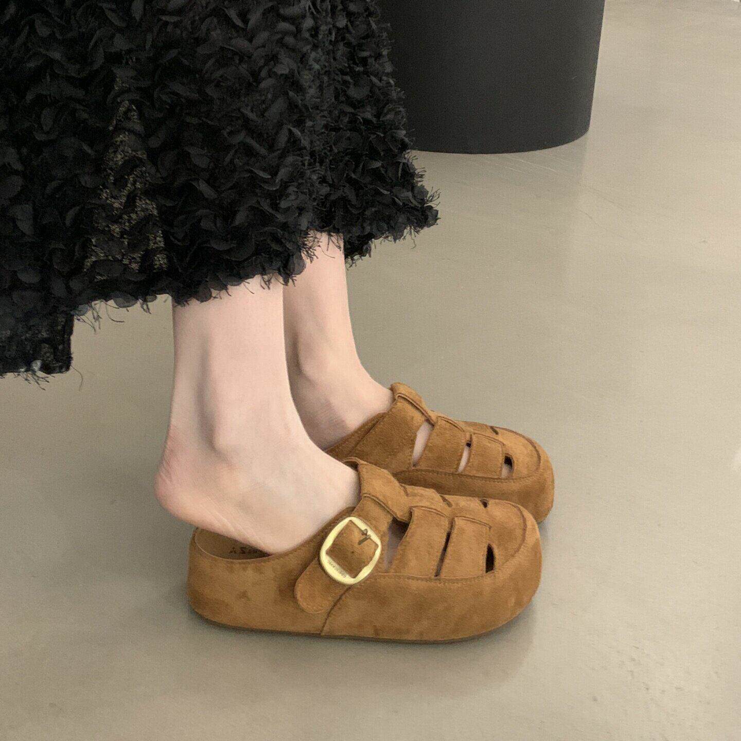 英国真皮厚底勃肯包头半拖女外穿2026新款夏季增高镂空搭扣凉拖鞋