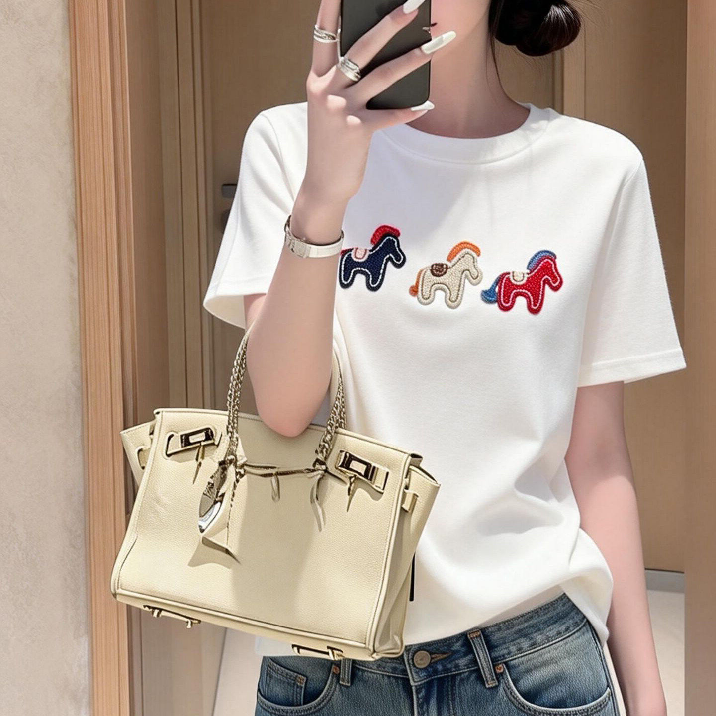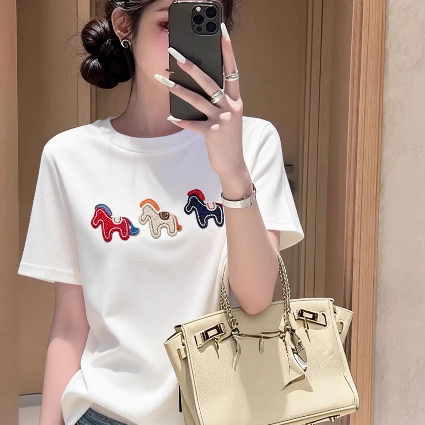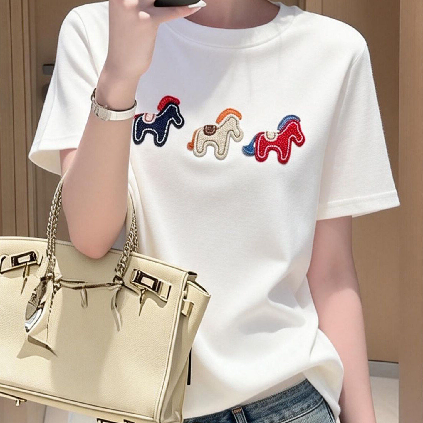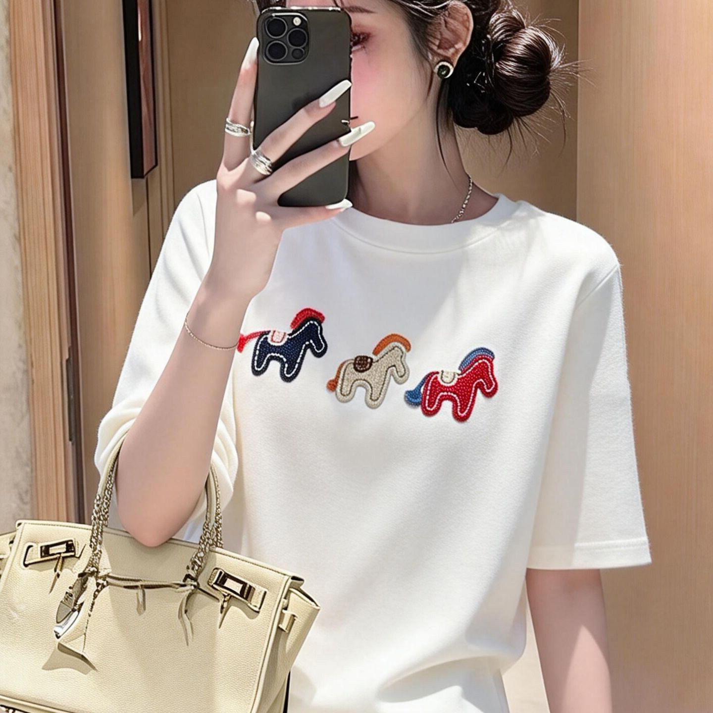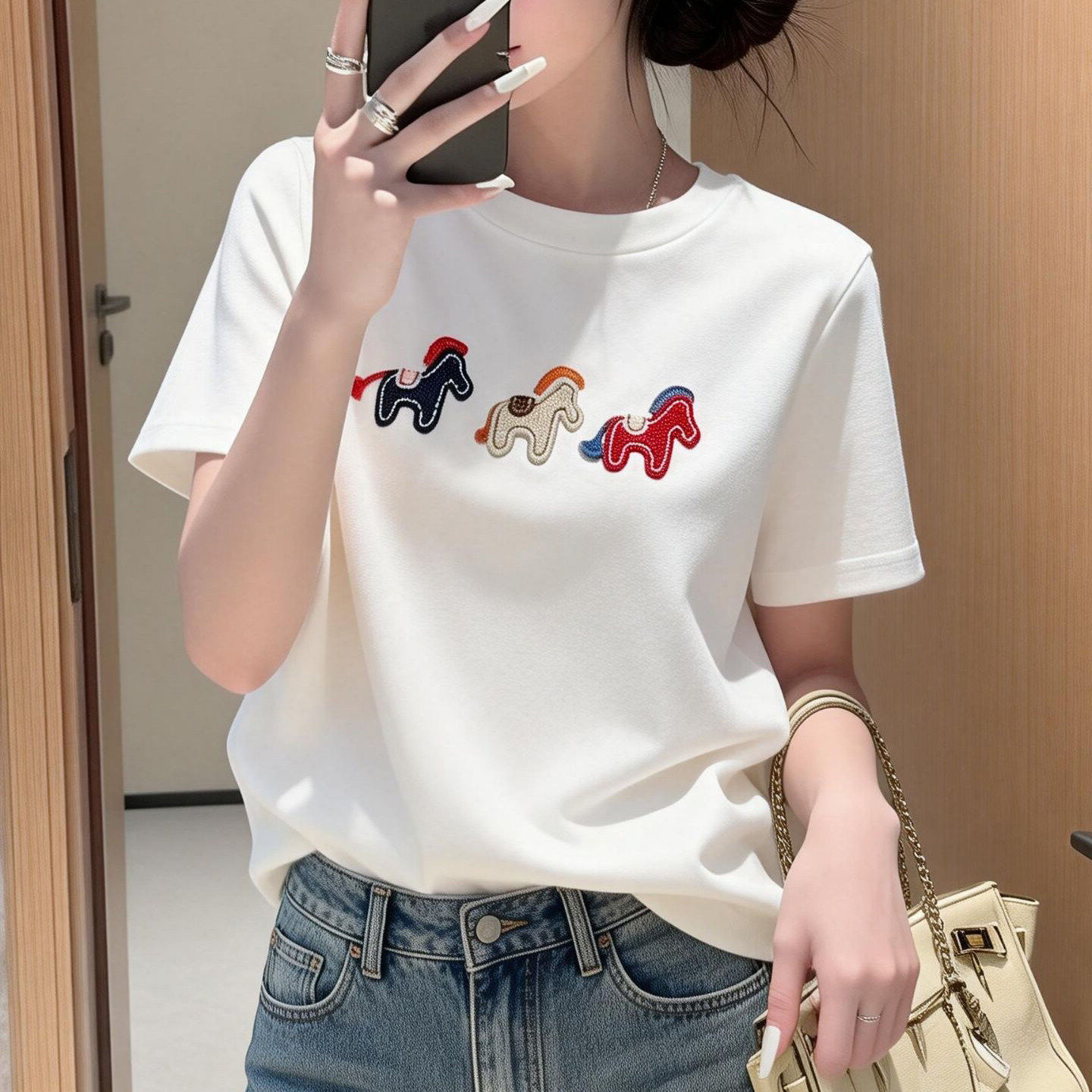 2026年新年早春小马刺绣短袖T恤女宽松休闲时尚小众打底衫上衣