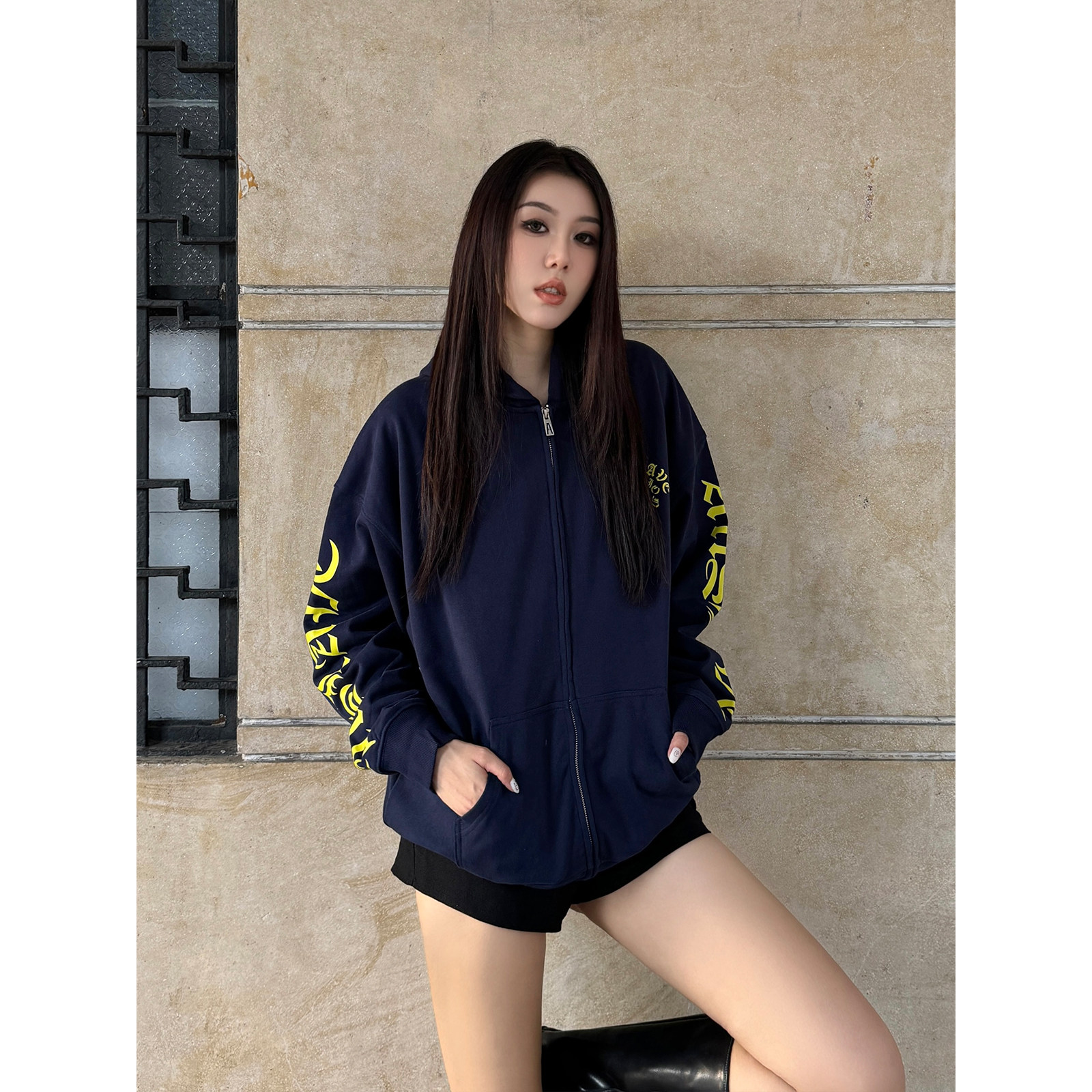 --------------------- A11SLAVE美式梵文哥特字母印花拉链开衫连帽卫衣高街男女春秋外套 【原售价】219元 【现售价】78.3元 【推荐理由】